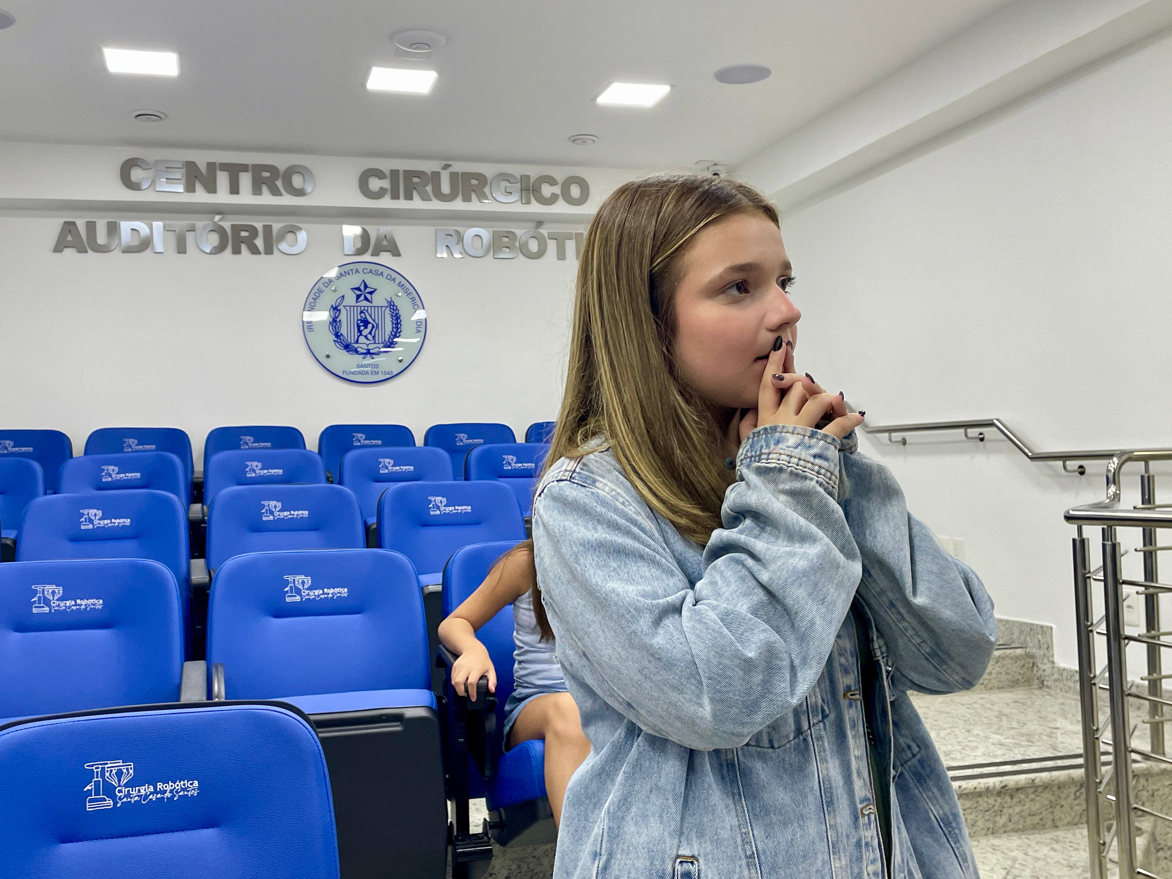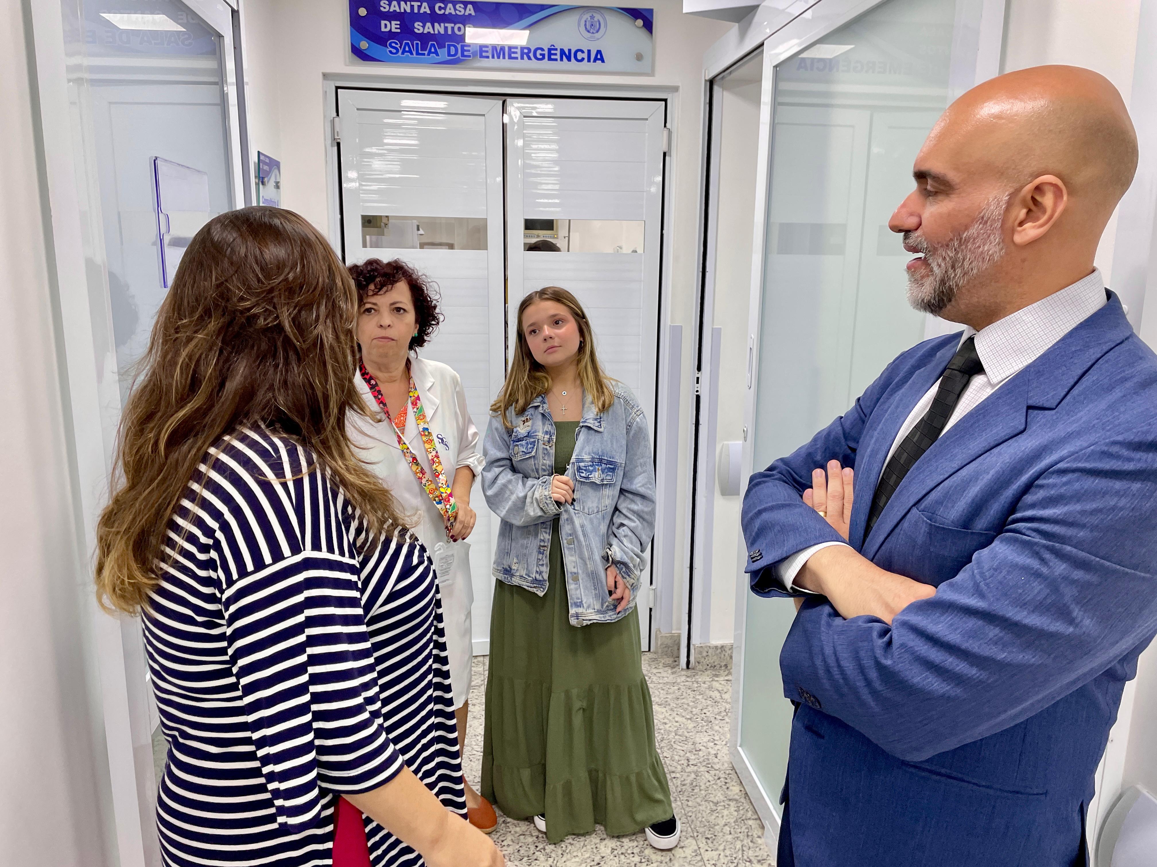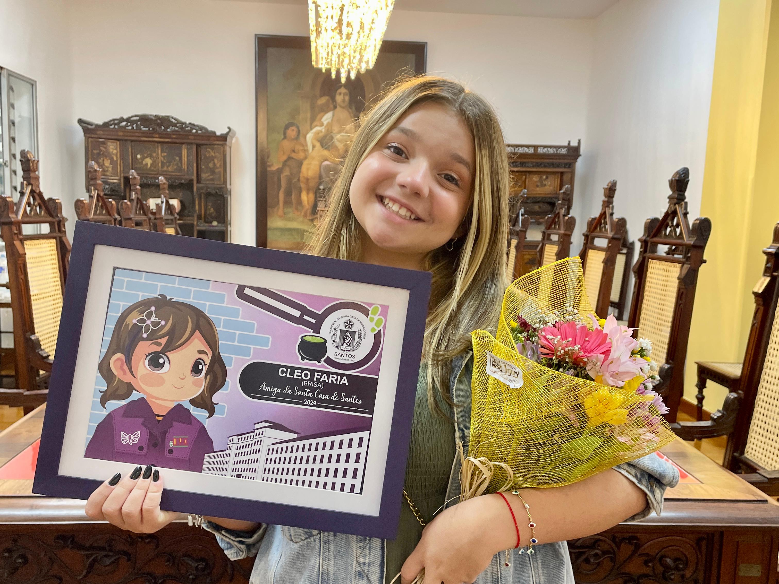 Cléo Faria, a Brisa da série infantil DPA, visita a Santa Casa de Santos