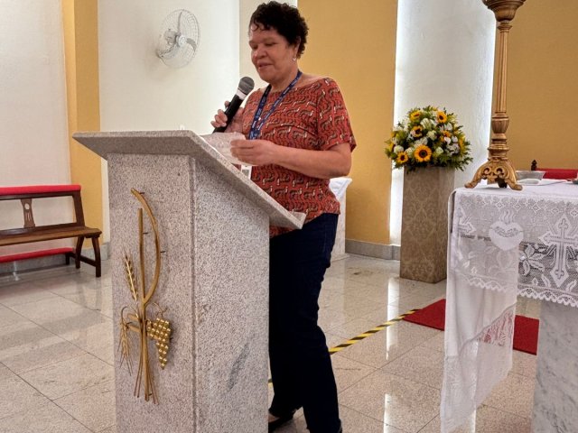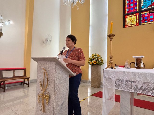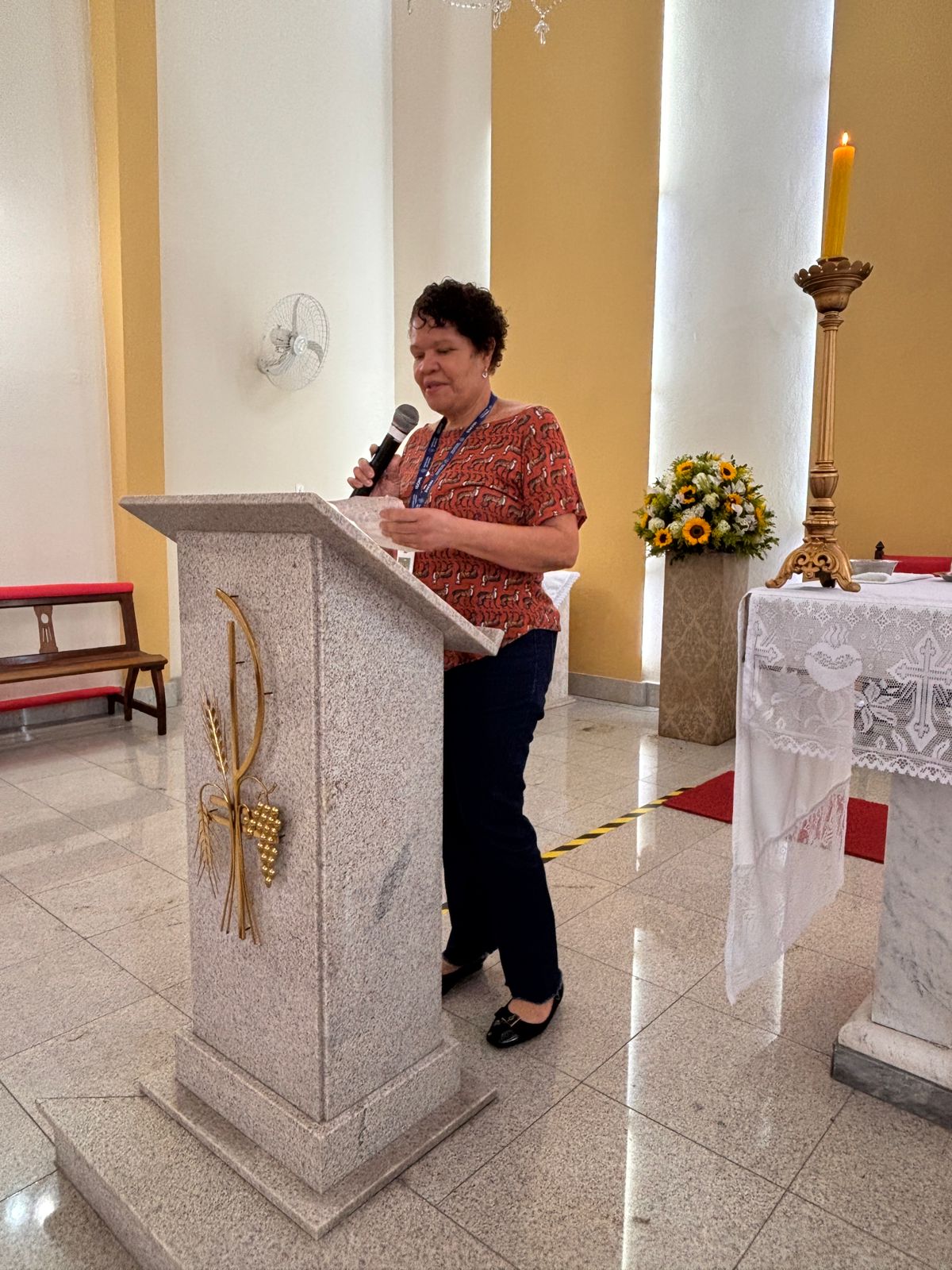 A colaboradora do Arquivo Geral e Histórico da Santa Casa, Rosilda Raimunda Gouveia Ferreira fez uma homenagem aos voluntários, contando brevemente a história da AVOSC e sua importância para o dia a dia da instituição.