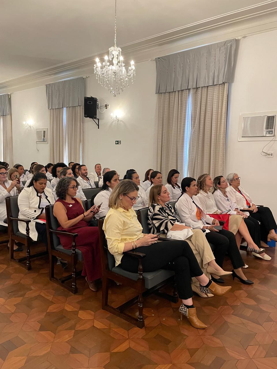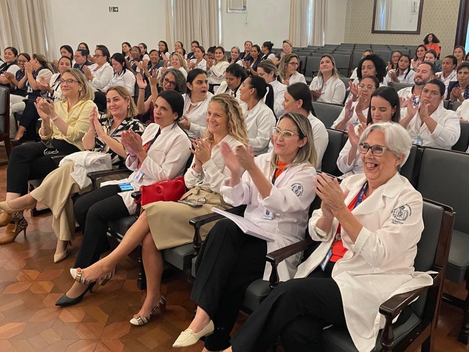 Na tarde de ontem, 16 de abril de 2025, no Consistório da Santa Casa de Santos, 87 profissionais receberam o certificado de conclusão do curso Amigo do Idoso. Este projeto, em parceria com a empresa Pfizer (Senior Heroes), iniciou há cerca de 9 meses, com 6 módulos, e capacitou equipes multiprofissionais para a linha de cuidados com os pacientes idosos.