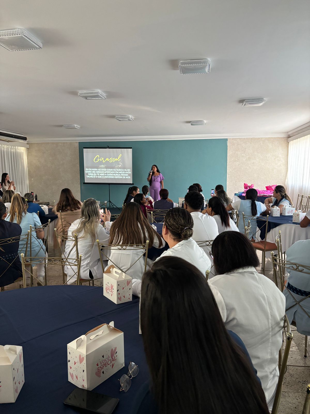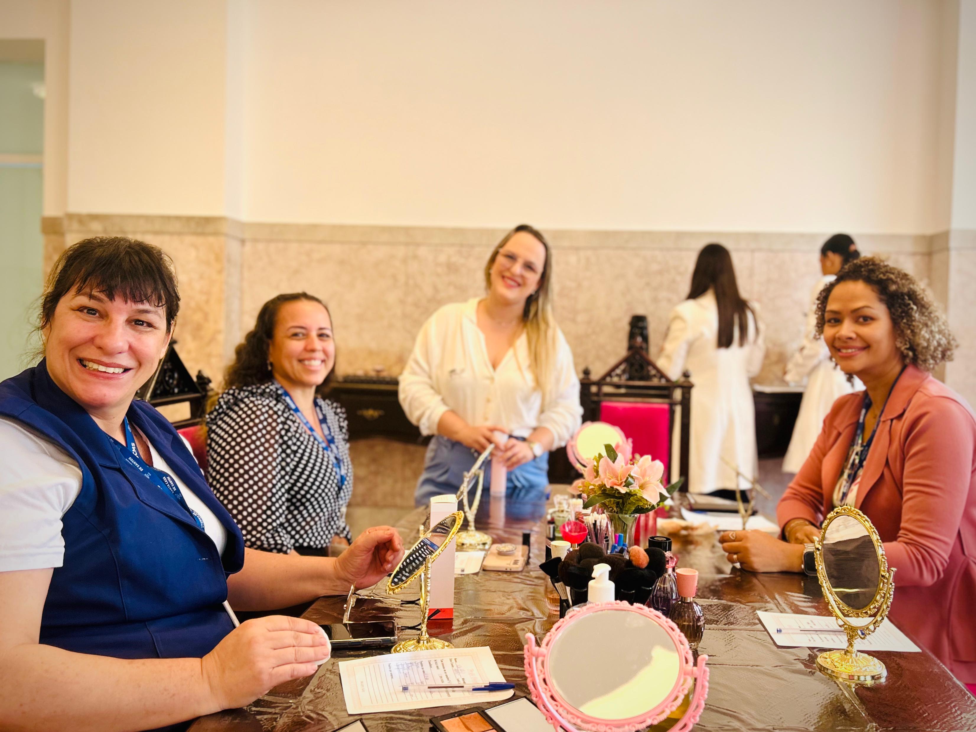 No salão rosa do 2ºA, representantes da Mary Kay, ministraram aulas de auto maquiagem com dicas de beleza. Ficou disponível um toten de fotos impressas para os colaboradores registrarem o momento. Além disso, também tinha disponível aula prática de Yoga e massagem.