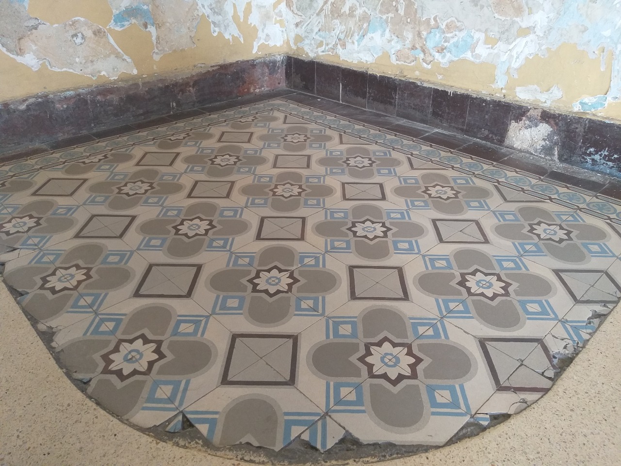 No chão do hall de entrada, nota-se que os pisos originais foram trocados por granitina, restando apenas uma pequena parte do que poderia ter sido o piso do passado, supostamente preservado por ter ficado escondido embaixo de algum móvel.