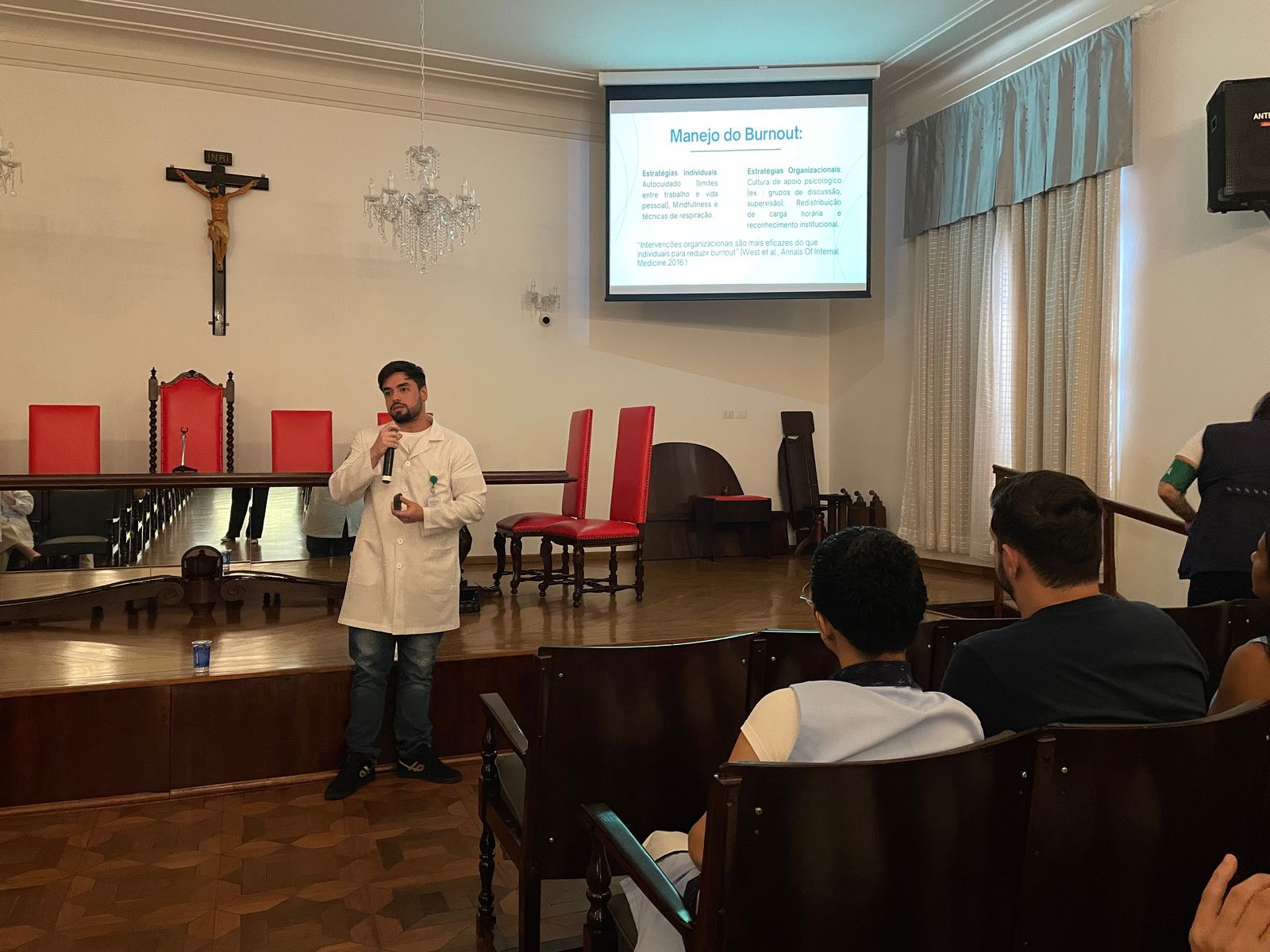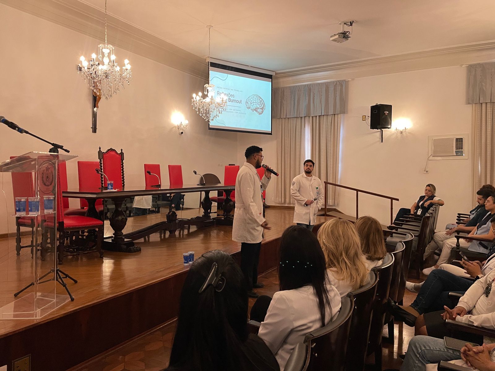 Na palestra da tarde do dia 25/3, os Psicólogos Ocupacionais da Santa Casa, Júlio Maurício e Leonardo Fagundes, falaram sobre o Burnout e a exaustão profissional.