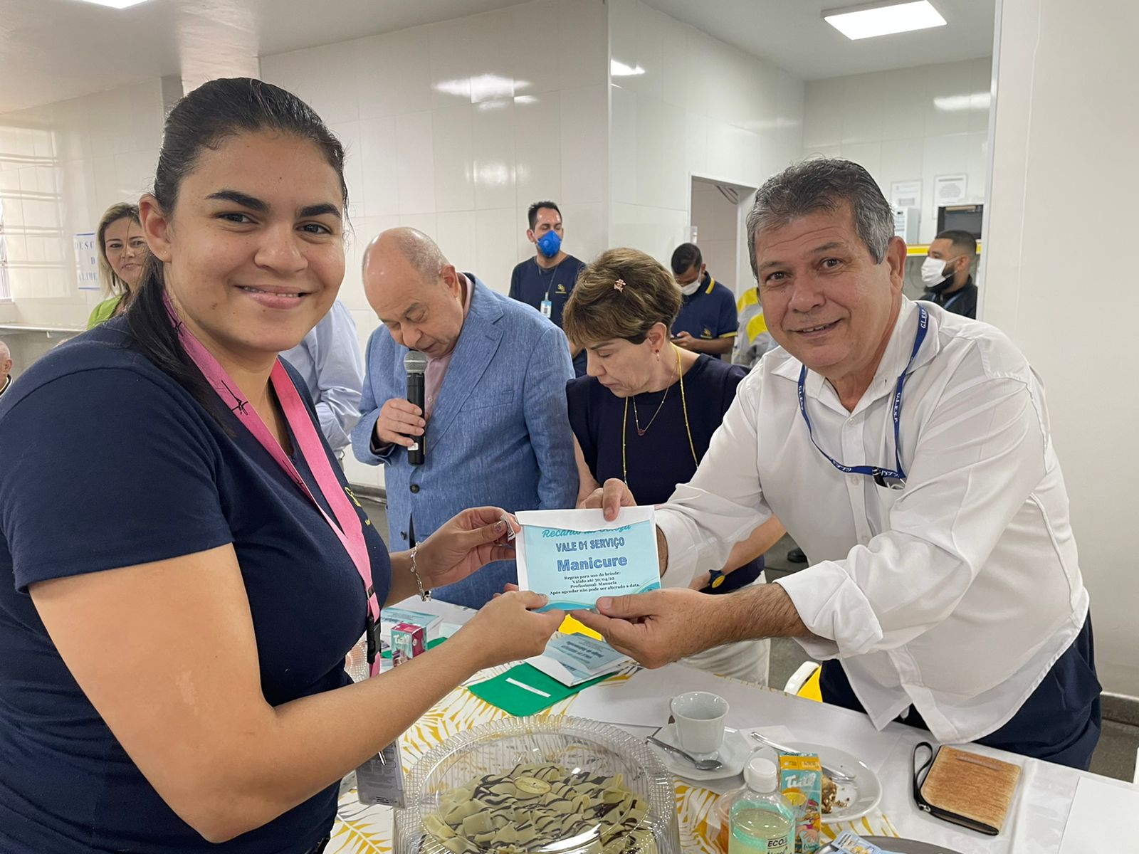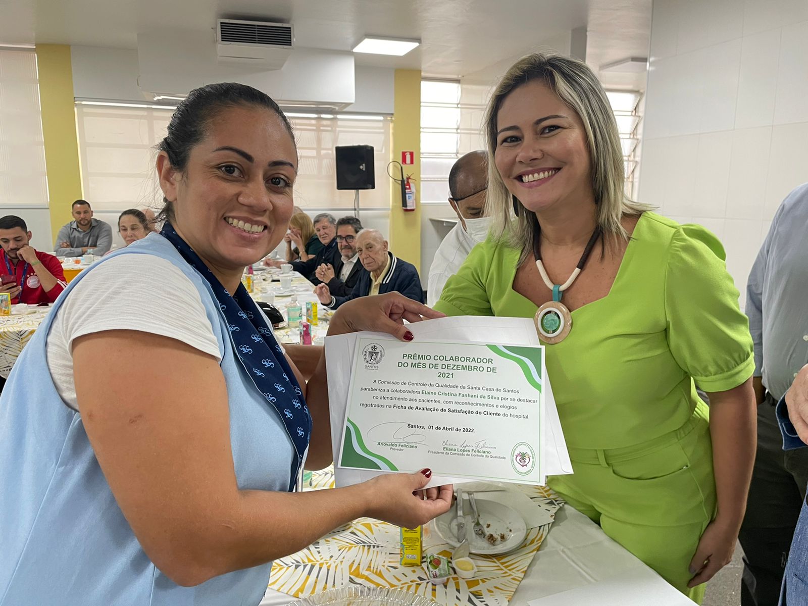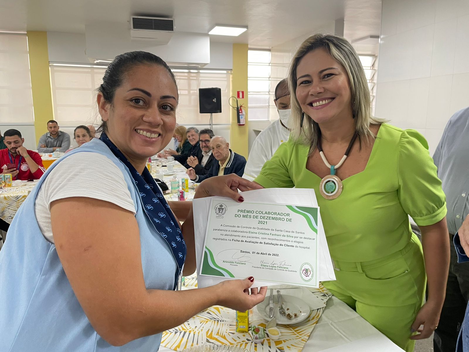 Os colaboradores mais elogiados foram chamados à frente para receber os cumprimentos e o certificado que congratula o profissional pelo destaque na assistência. A Técnica de Enfermagem Inês Pereira Silva de Melo foi destaque pela 4ª vez, e ganhou uma joia em ouro, que foi entregue pela presidente da C.C.Q. Eliana Lopes Feliciano, em reconhecimento pela excelência no atendimento.