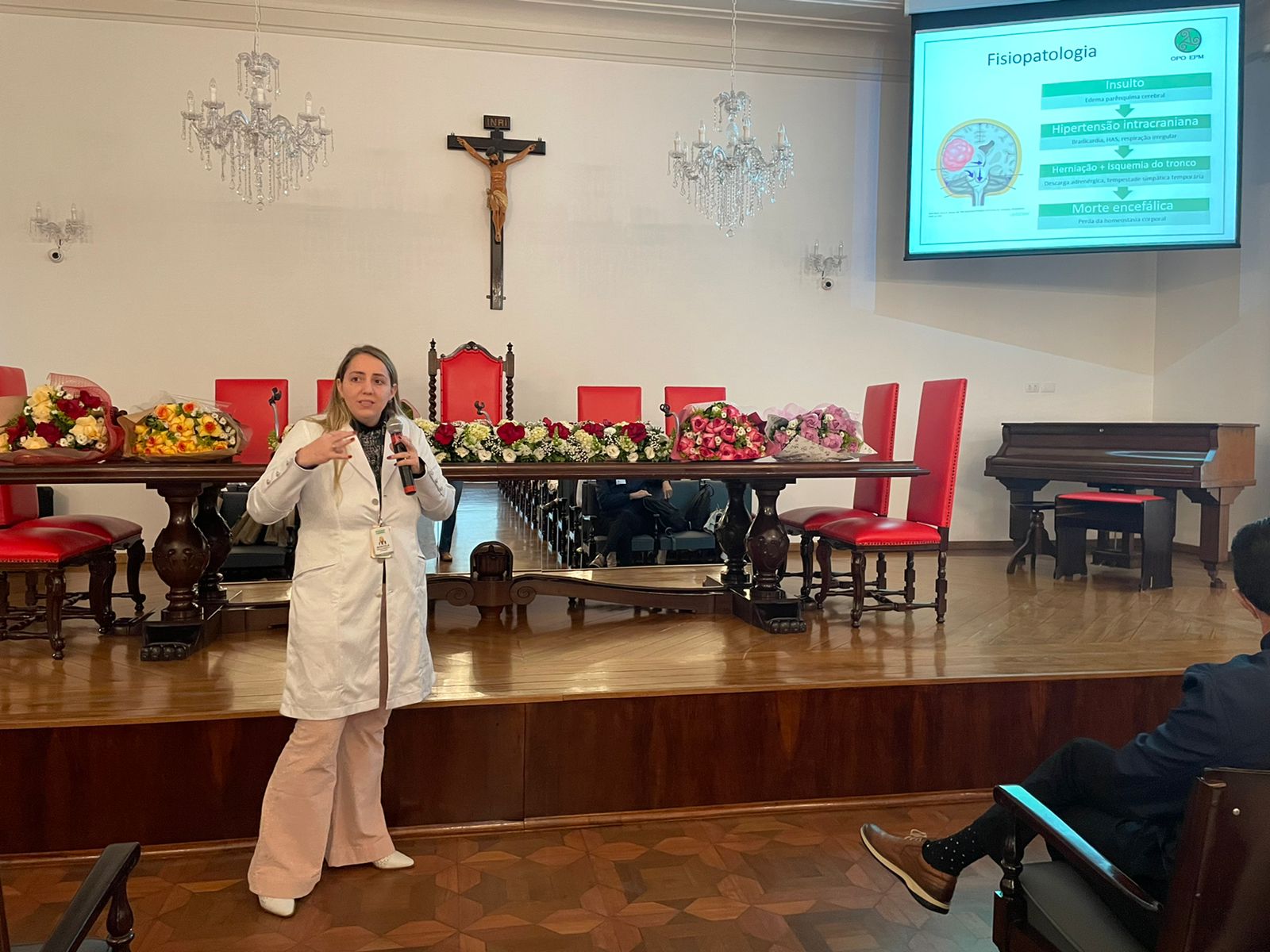 A primeira palestra foi com a médica Nefrologista e residente em transplante do Hospital do Rim, Drª. Marcela Simões, que falou sobre o diagnóstico de morte encefálica.