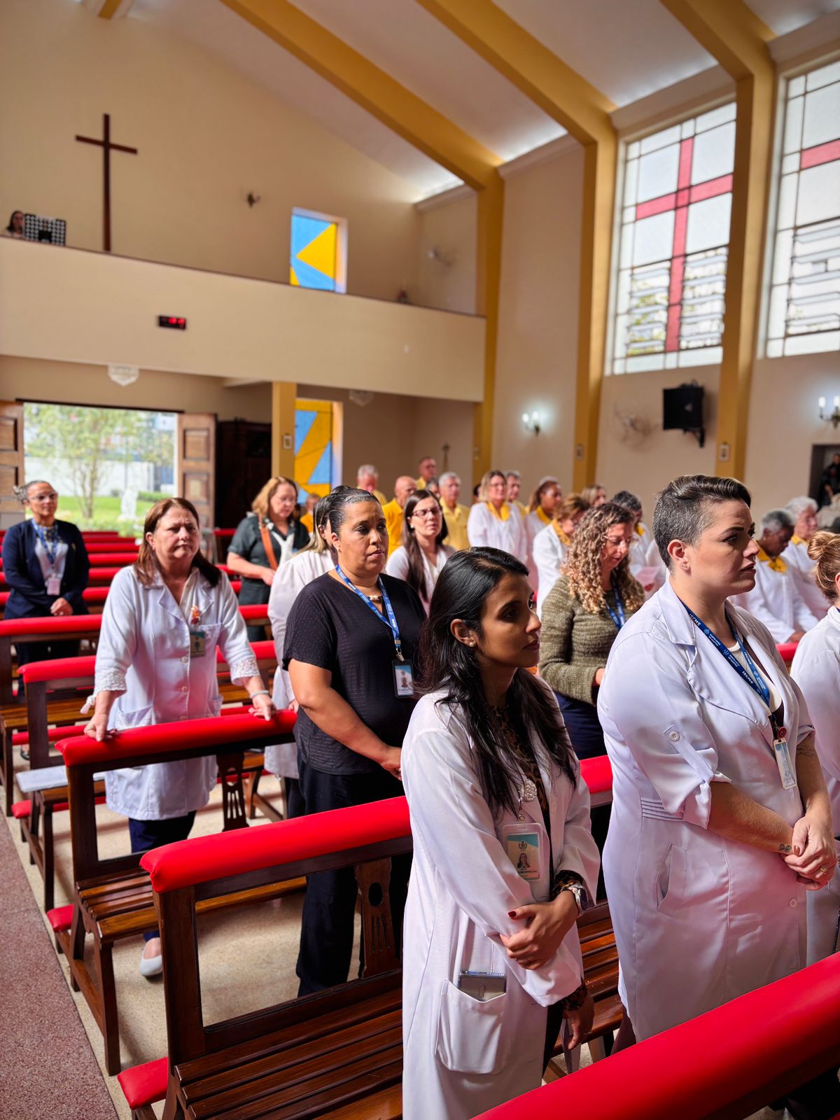 Durante a homilia, Padre Denilson ressaltou o papel essencial dos voluntários no acolhimento aos pacientes e familiares. “Os ‘Amarelinhos’ são parte da história da Santa Casa. Eles estão presentes nos momentos de dor e sofrimento, oferecendo uma palavra amiga ou até mesmo um abraço”, destacou.