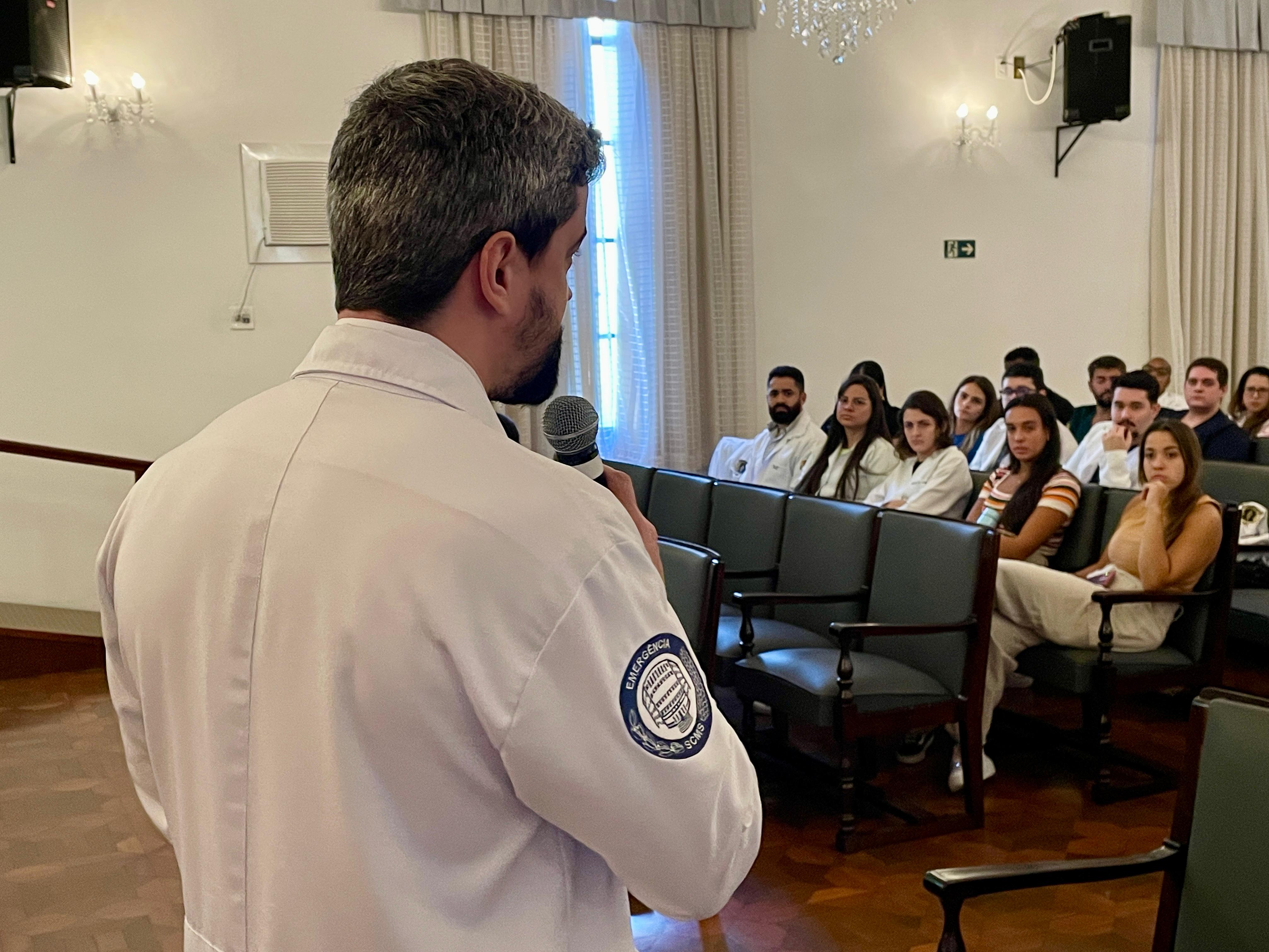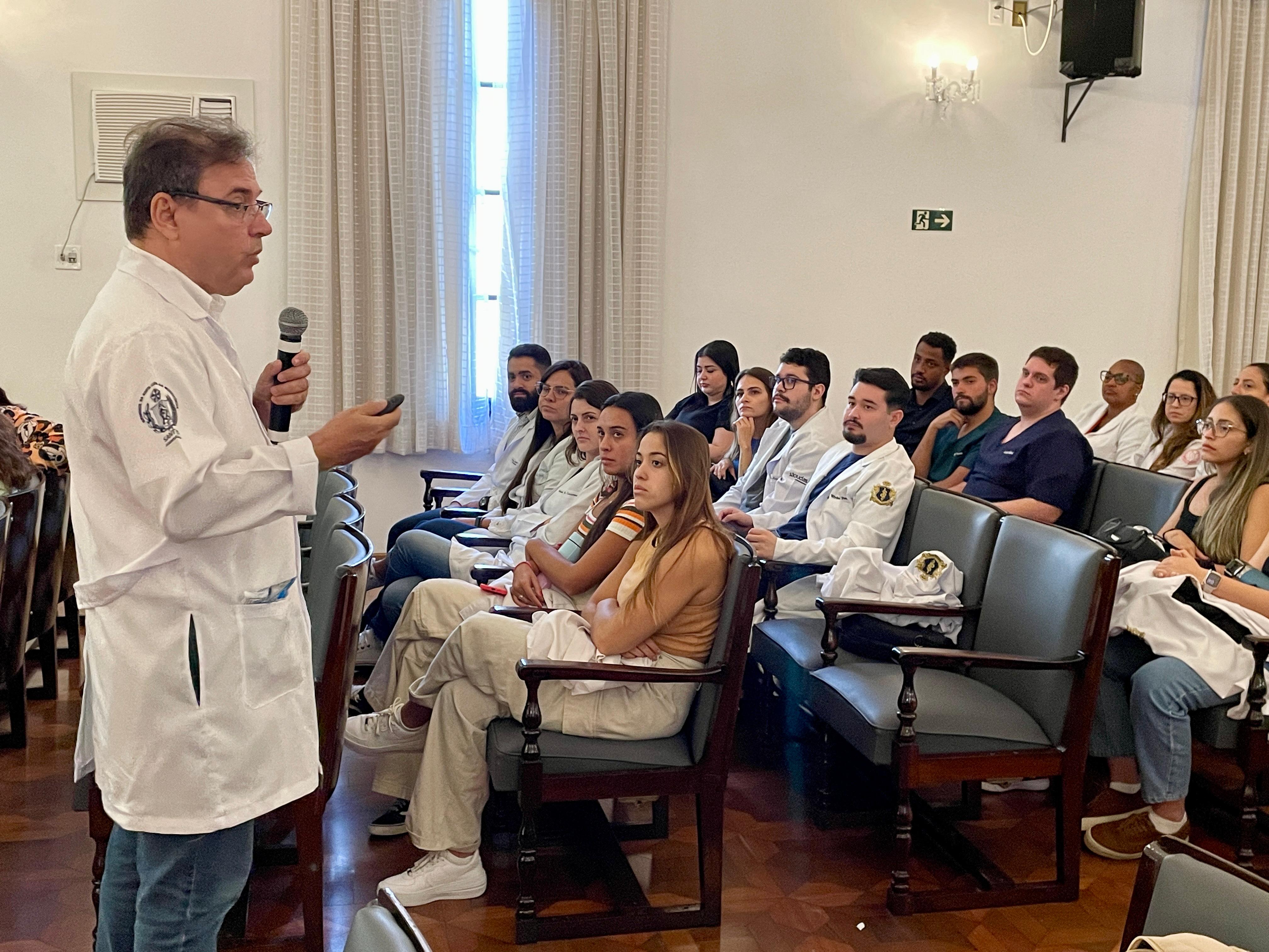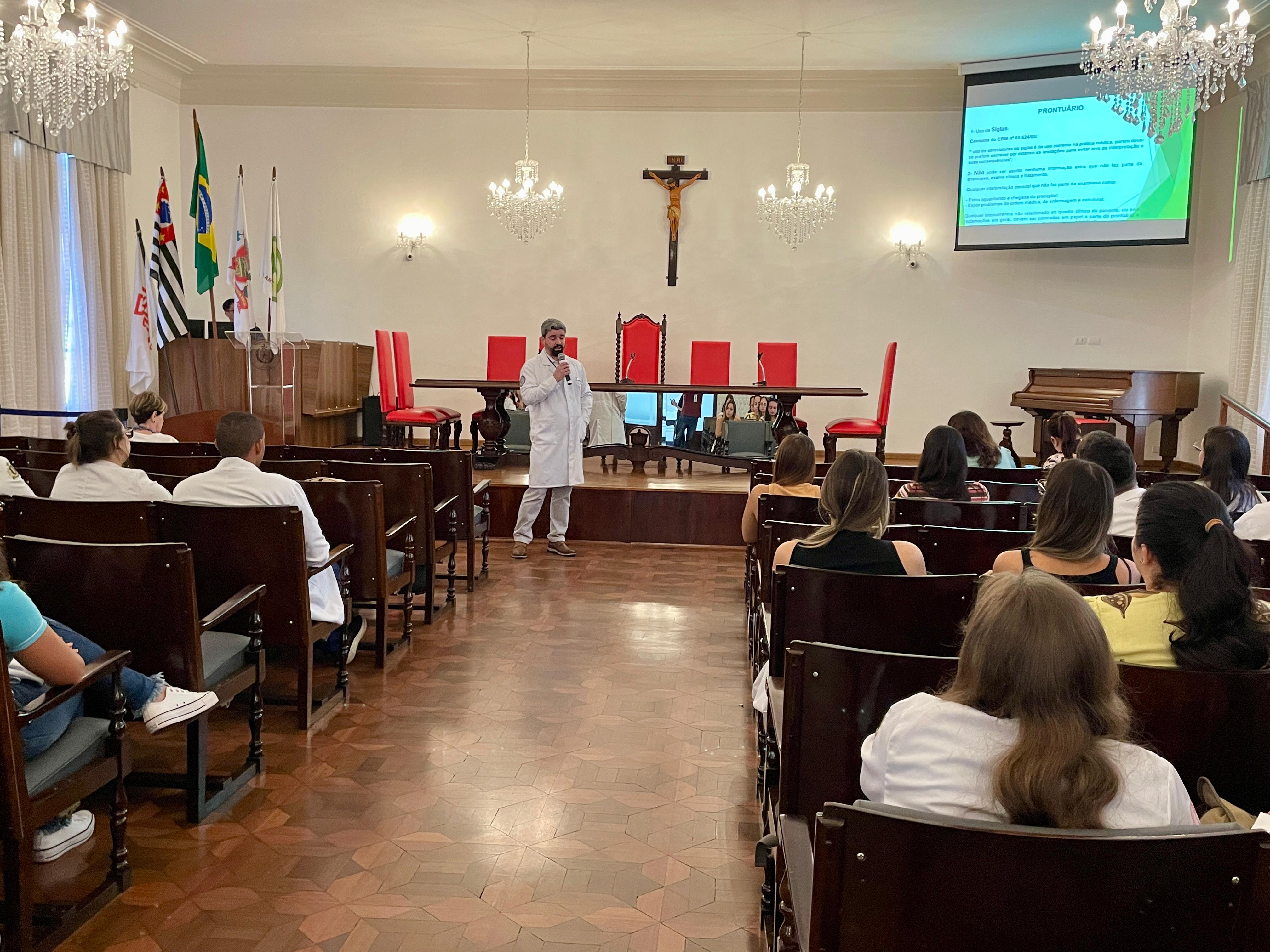 Aula inaugural apresenta orientações institucionais e marca o início da nova turma que fará internato na Santa Casa de Santos em 2024 .