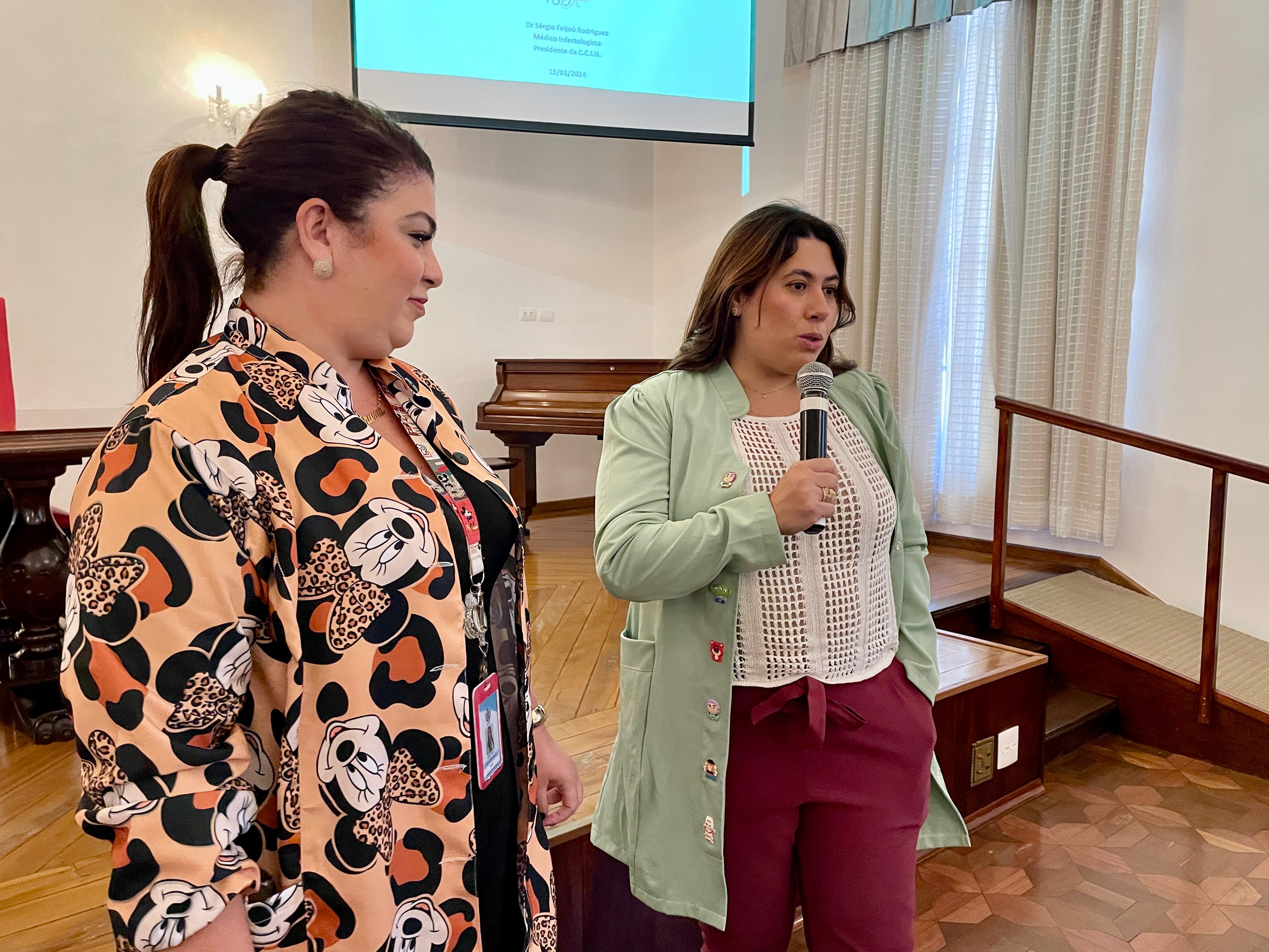A médica coordenadora da Pediatria, Drª. Bruna Giacomelli, falou um pouco sobre a especialidade, e a pediatra Drª. Ana Dib complementou contando um breve histórico sobre a pediatria, dando dicas para o internato.