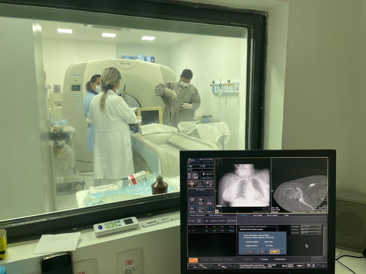 Para a realização do exame, no primeiro momento é feita a aplicação do contraste diretamente na articulação, guiada por tomografia computadorizada.