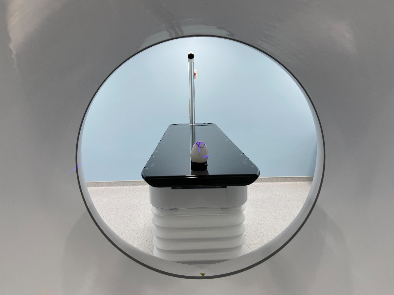 O aparelho de tomografia computadorizada completa o parque tecnológico do complexo. Totalmente dedicado à Radioterapia, o equipamento auxilia na precisão do tratamento. “Só é possível fazer o planejamento e a aplicação do tratamento mediante a imagem do paciente, realizada no tomógrafo. No novo Complexo, todo paciente fará uma tomografia, para que no planejamento possamos calcular e entregar a dose prescrita pelo médico”, explica Raquel.