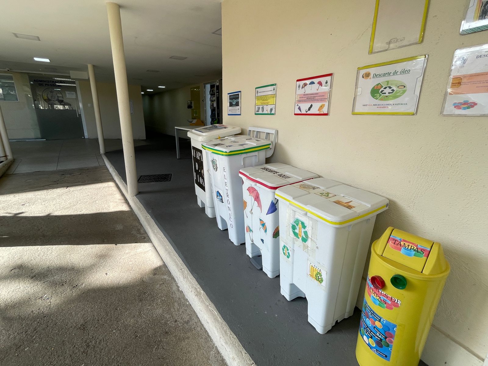 Funcionários e visitantes podem descartar óleo usado, lixo eletrônico e diversos itens nos contentores localizados em frente ao Departamento Pessoal.
