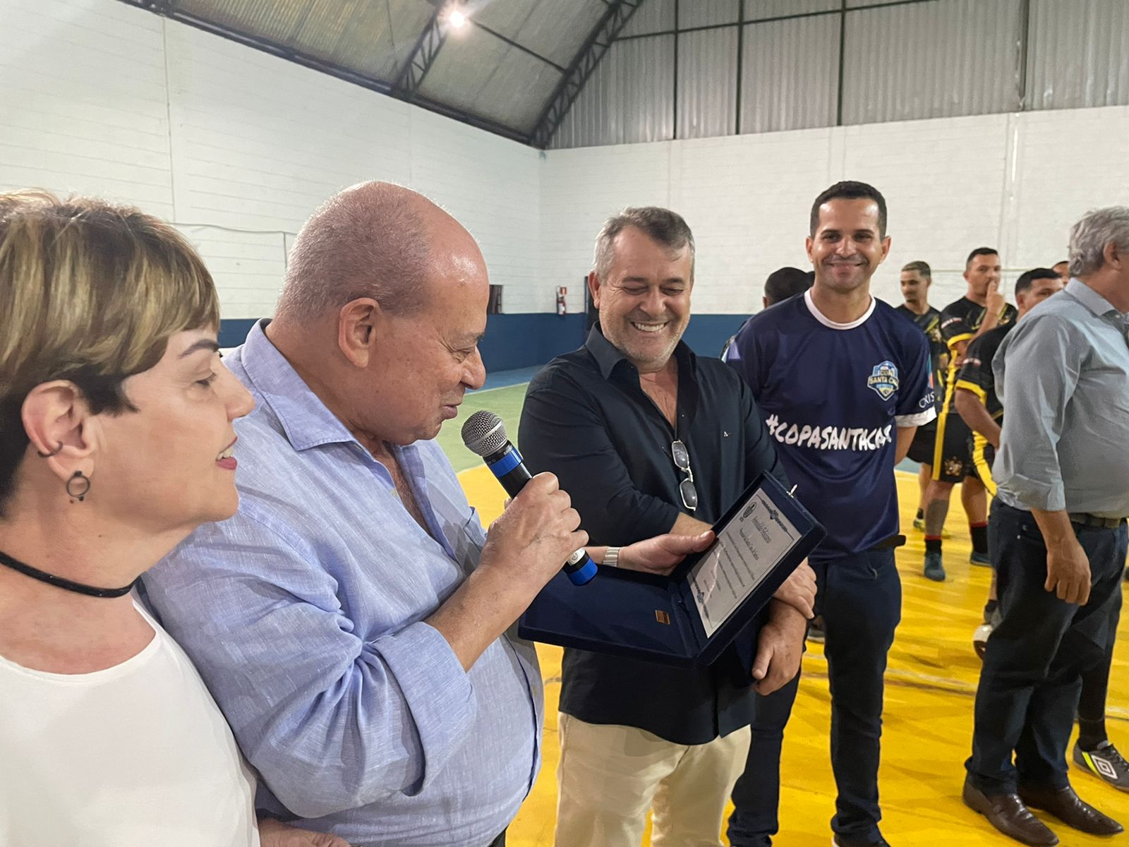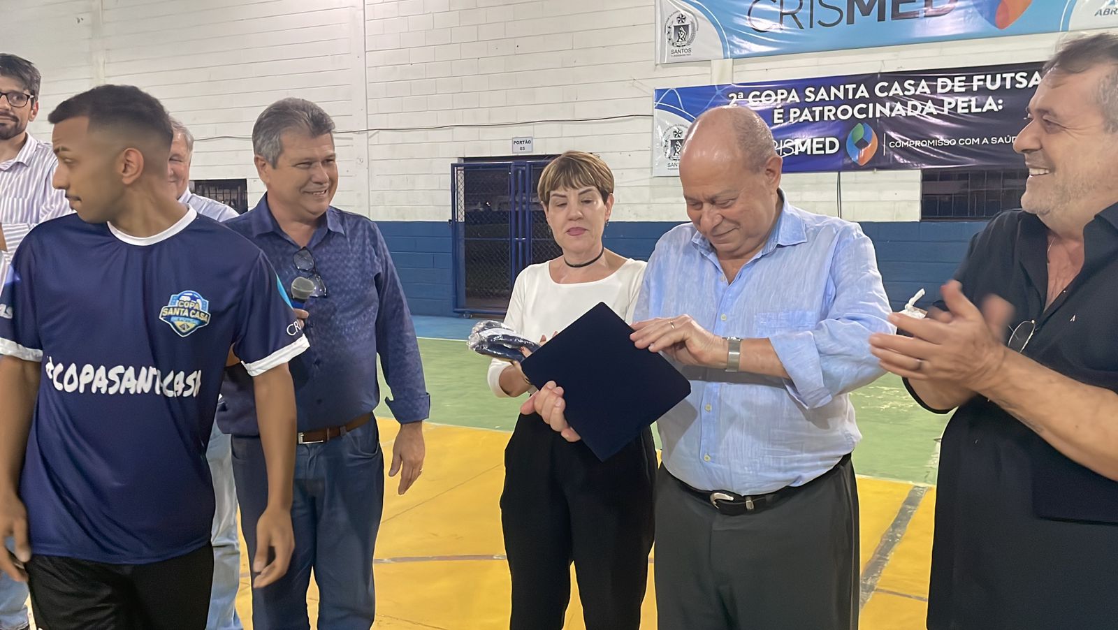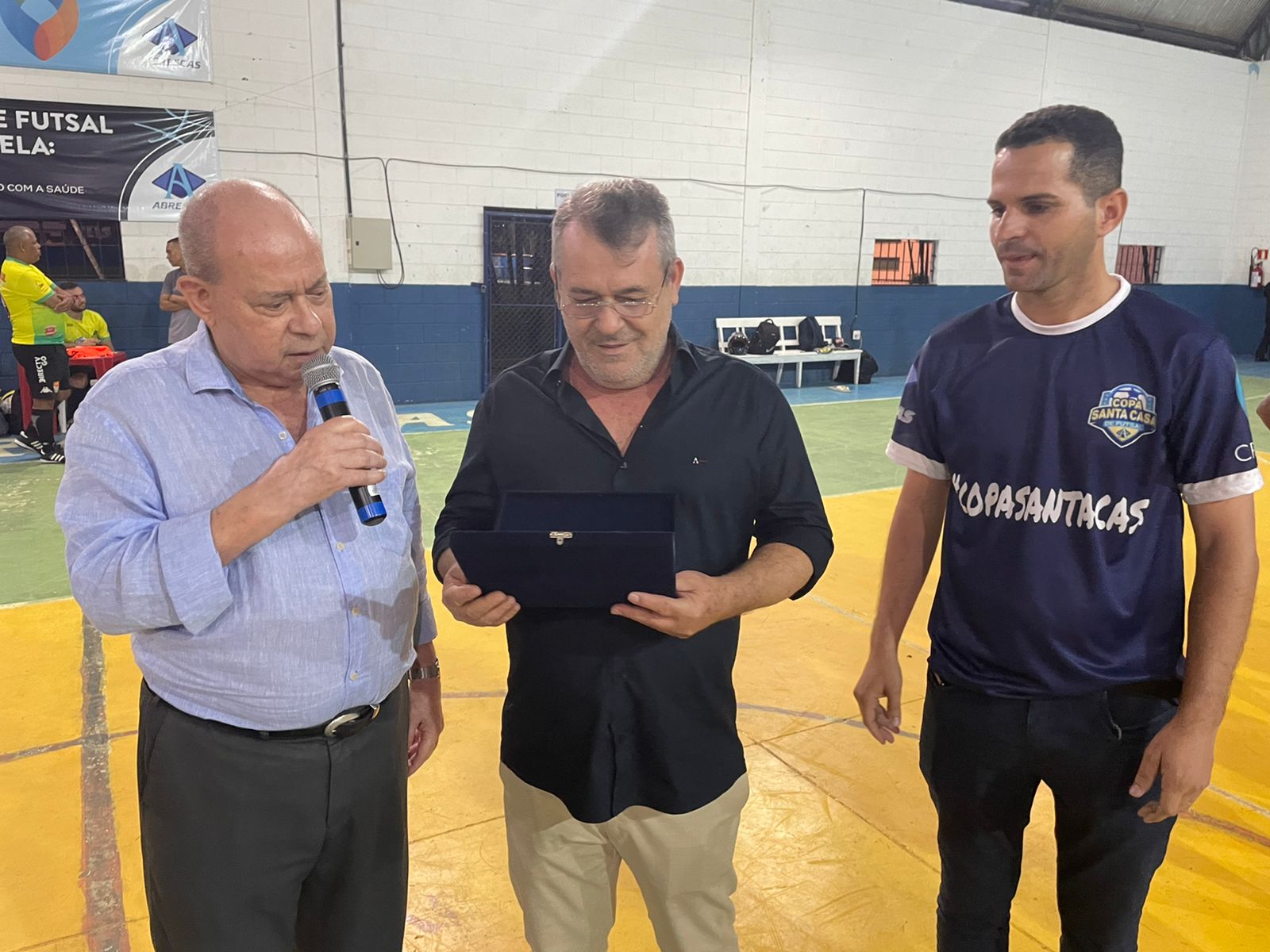 Representando os funcionários, o colaborador da T.I. Israel Galdino entregou uma placa de homenagem ao provedor, em agradecimento pelo apoio na realização do evento. O provedor também entregou uma placa ao presidente diretor da Crismed, Laércio Esaú dos Santos, em agradecimento pelo patrocínio da 2ª Copa Santa Casa de Futsal.