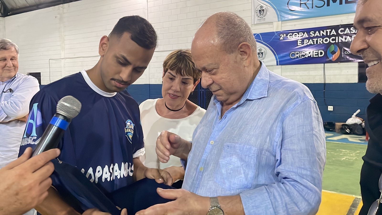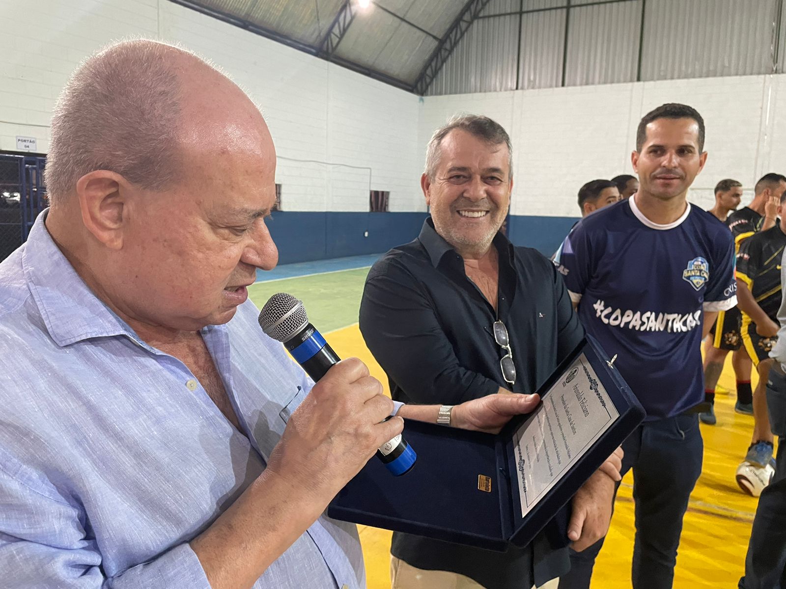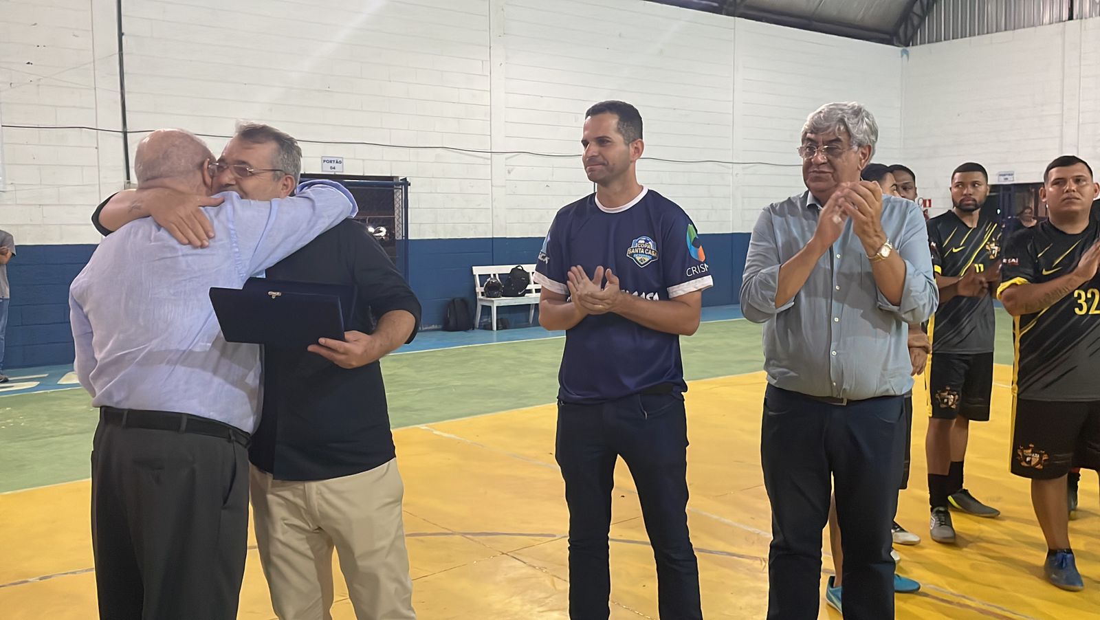 Representando os funcionários, o colaborador da T.I. Israel Galdino entregou uma placa de homenagem ao provedor, em agradecimento pelo apoio na realização do evento. O provedor também entregou uma placa ao presidente diretor da Crismed, Laércio Esaú dos Santos, em agradecimento pelo patrocínio da 2ª Copa Santa Casa de Futsal.