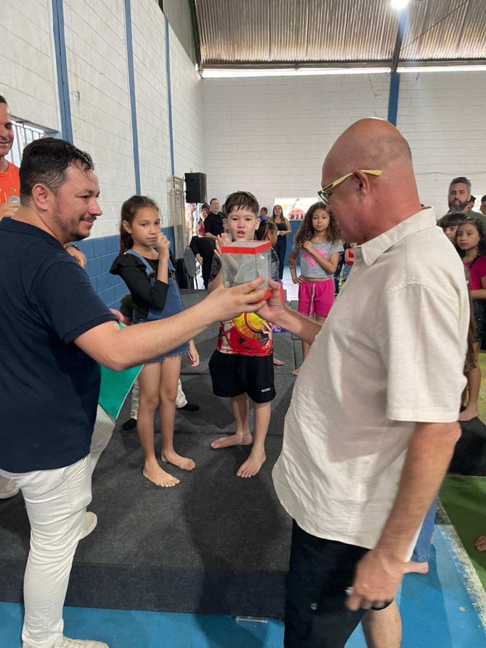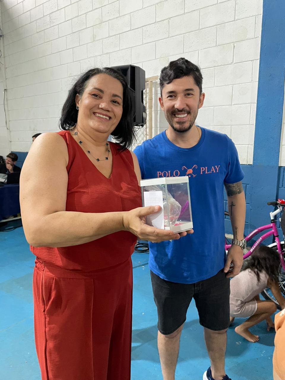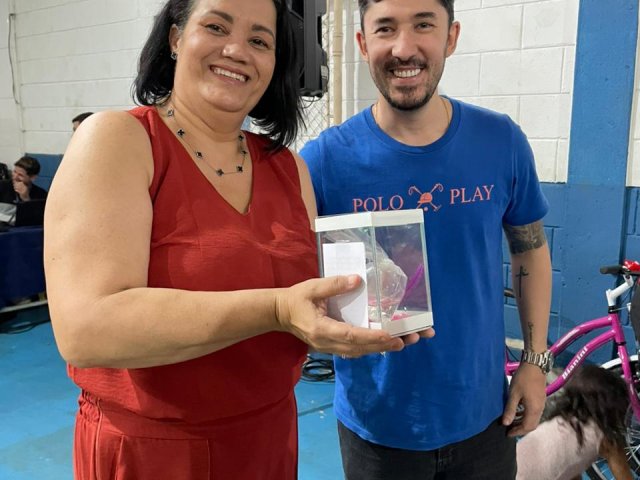 Foram sorteadas 2 bicicletas, cerca de 20 aquários com peixe beta e outros diversos brindes.