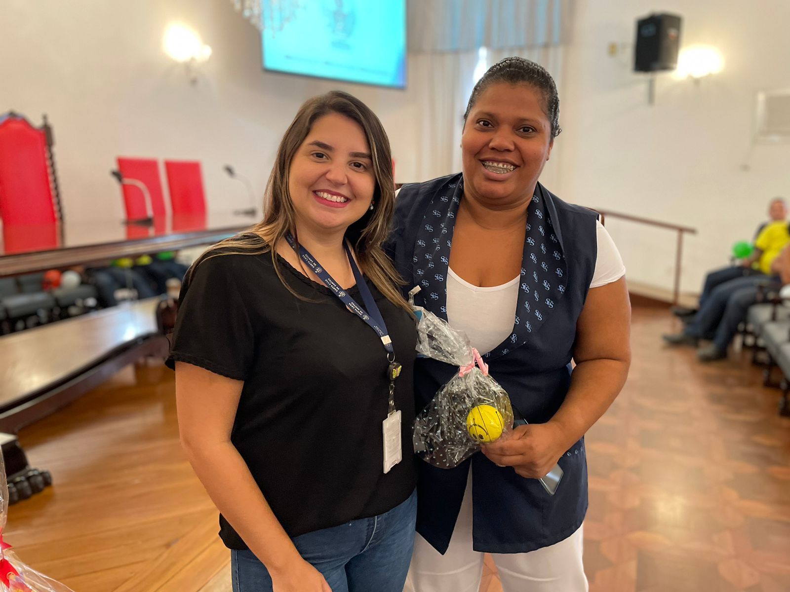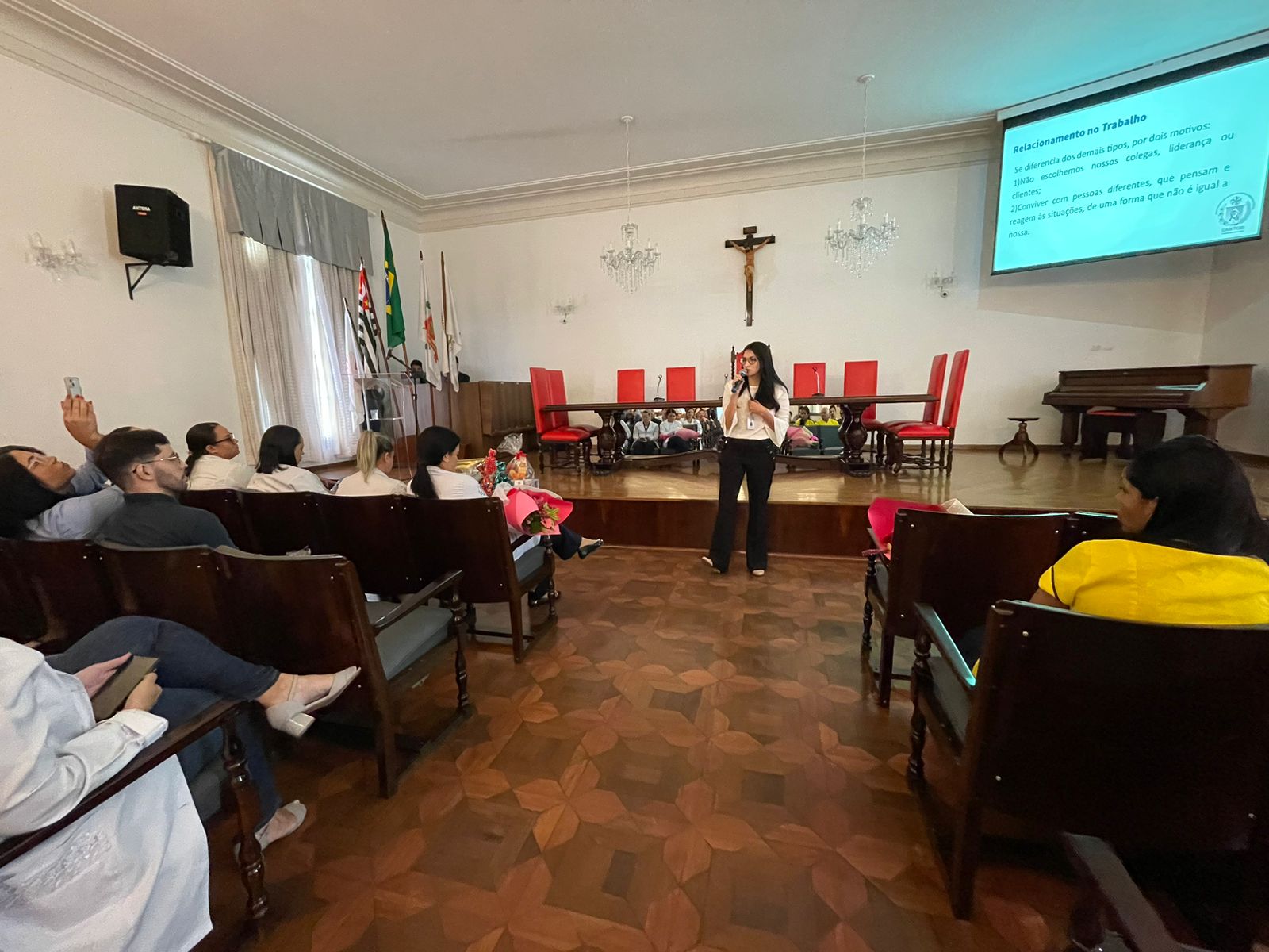 Na sequência, foi a vez da analista de RH, Ana Paula Moyano, falar dos desafios da construção de relações interpessoais no trabalho, e destacou a importância da ética profissional e comunicação assertiva. O assunto foi finalizado com uma dinâmica de grupo, onde os maus pensamentos deveriam ser soprados em uma bexiga escura, a qual teria como destino o lixo. Já os pensamentos e palavras positivas foram soprados em uma bexiga colorida, a qual deveria ser jogada no ar e compartilhada com os presentes. O momento lúdico alegrou o consistório e divertiu a todos com a brincadeira.