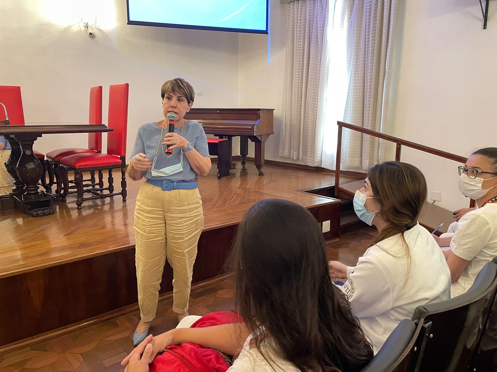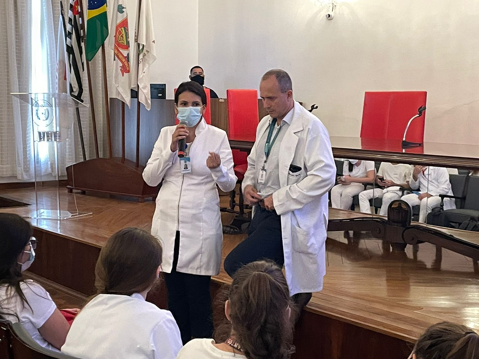 A presidente da CCQ e esposa do provedor do hospital, Srª. Eliana Lopes Feliciano, marcou presença e também participou explanando sobre algumas dúvidas levantadas pelos estudantes.
