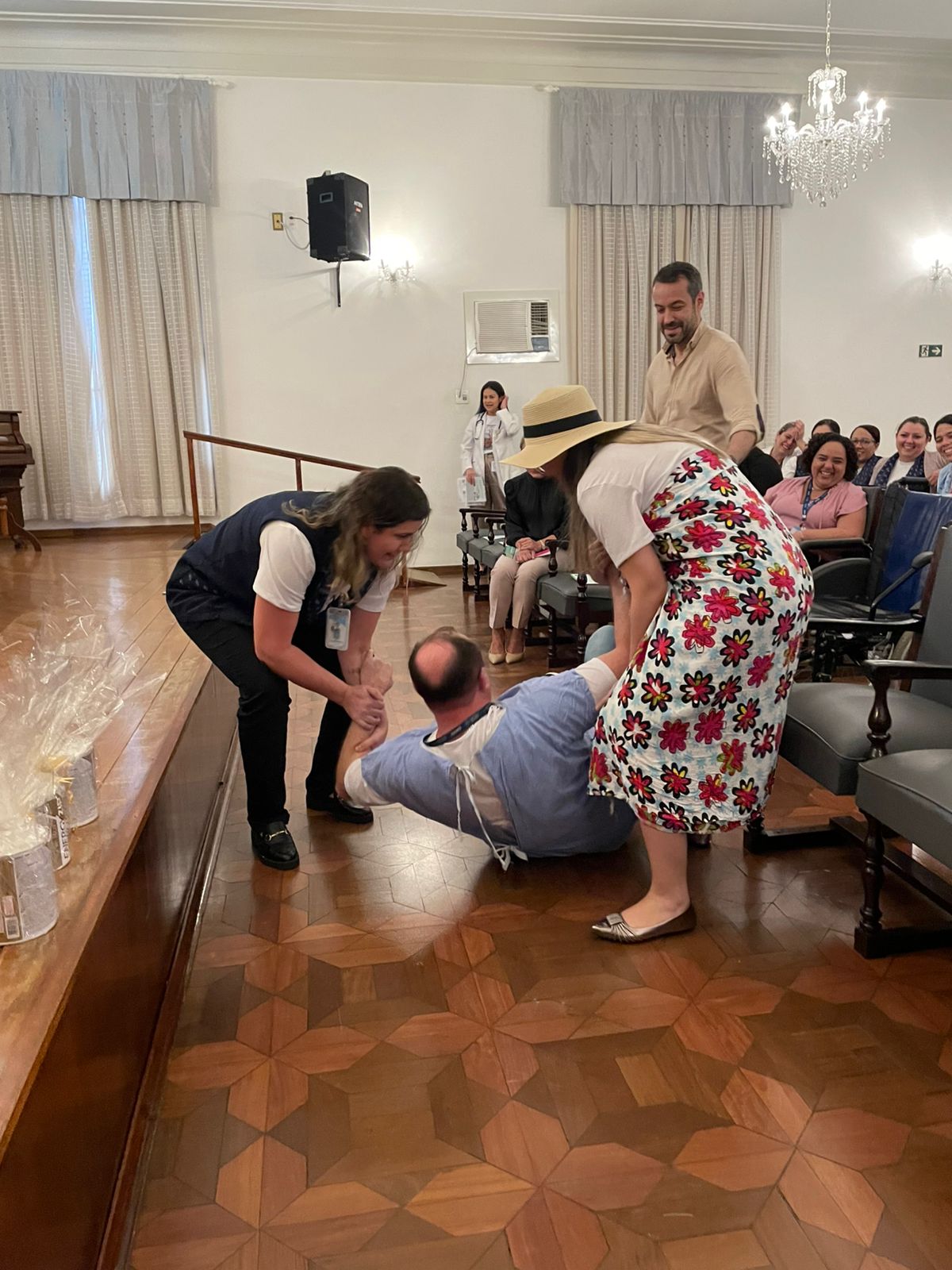 No decorrer da programação, a equipe apresentou uma peça teatral que simulou a entrada de um paciente idoso no hospital. A encenação retratou a situação de uma queda sofrida pelo paciente, ilustrando de forma prática os desafios enfrentados no atendimento e reforçando a importância da atenção, da prevenção e da atuação rápida da equipe multiprofissional.