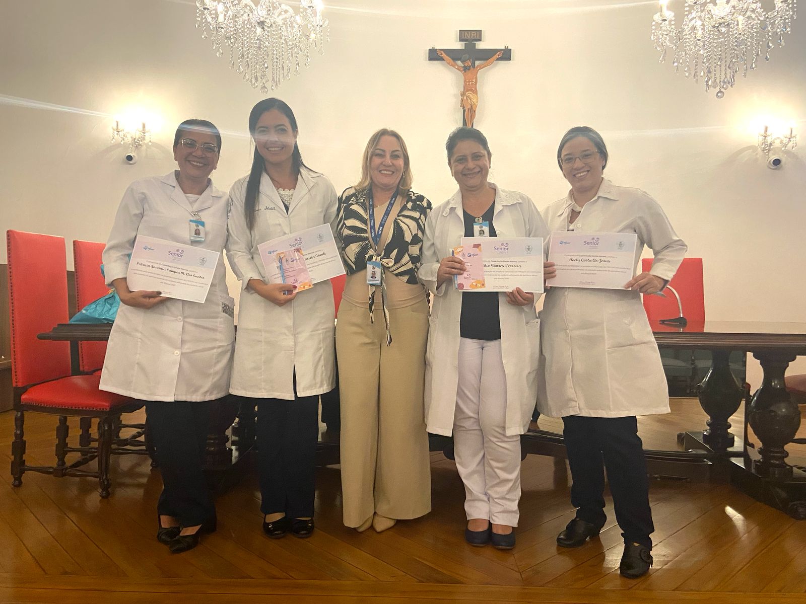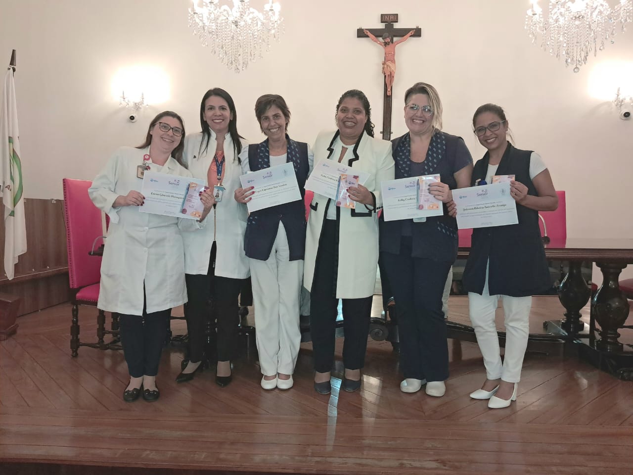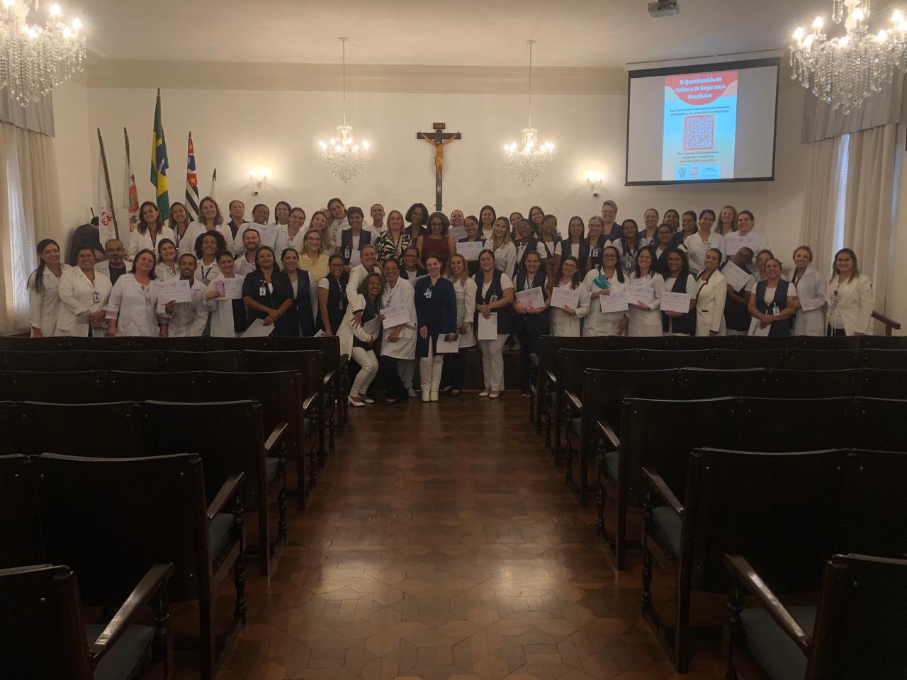 Na tarde de ontem, 16 de abril de 2025, no Consistório da Santa Casa de Santos, 87 profissionais receberam o certificado de conclusão do curso Amigo do Idoso. Este projeto, em parceria com a empresa Pfizer (Senior Heroes), iniciou há cerca de 9 meses, com 6 módulos, e capacitou equipes multiprofissionais para a linha de cuidados com os pacientes idosos.