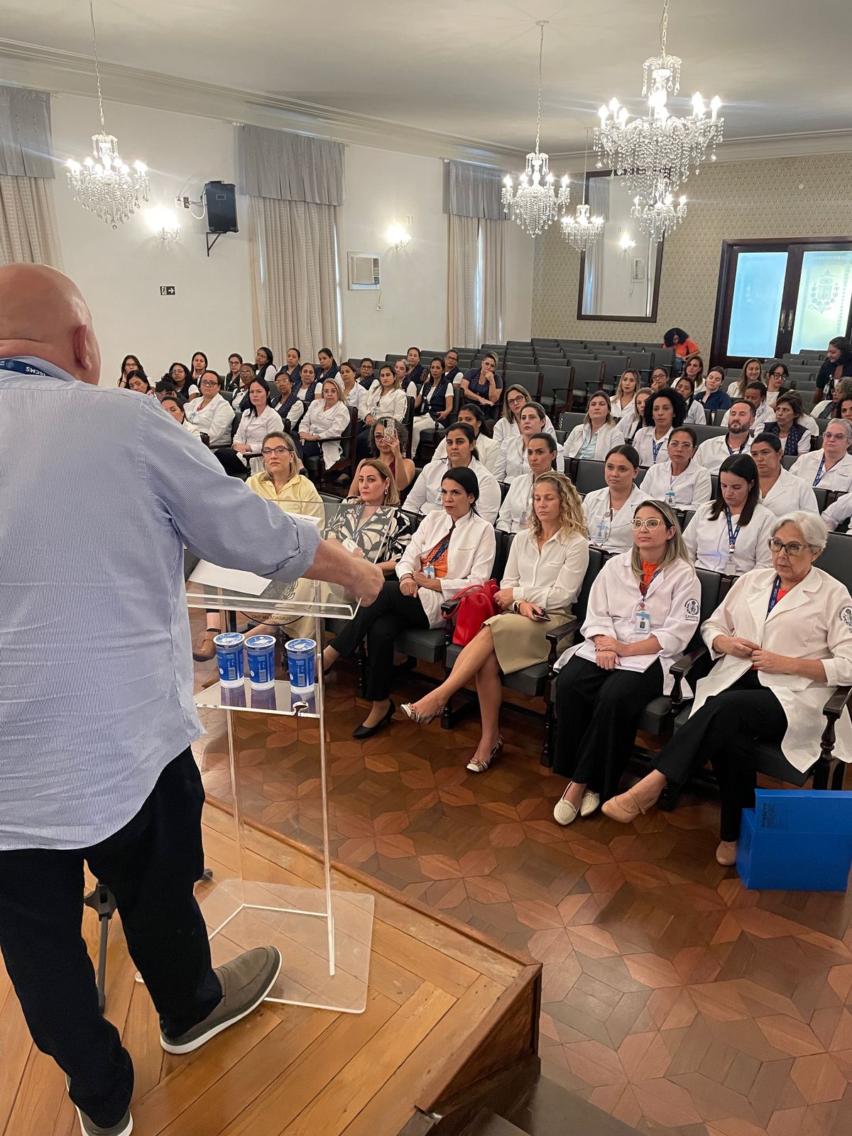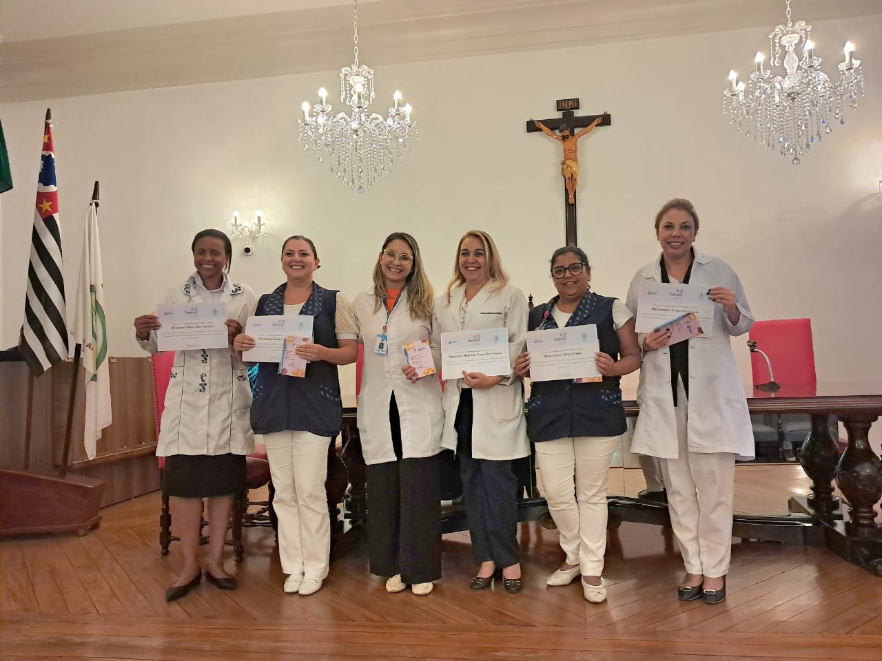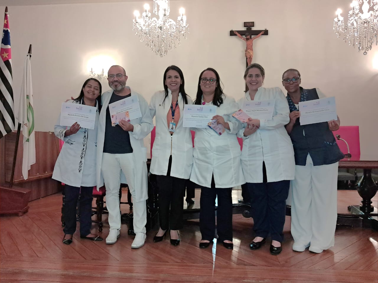 Na tarde de ontem, 16 de abril de 2025, no Consistório da Santa Casa de Santos, 87 profissionais receberam o certificado de conclusão do curso Amigo do Idoso. Este projeto, em parceria com a empresa Pfizer (Senior Heroes), iniciou há cerca de 9 meses, com 6 módulos, e capacitou equipes multiprofissionais para a linha de cuidados com os pacientes idosos.