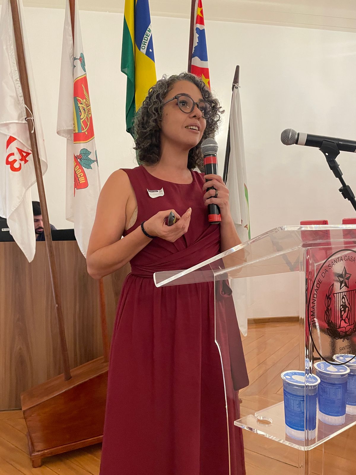 Em seguida, as enfermeiras do Núcleo Segurança do Paciente, Marcia Torelli, Amanda Antunes e a representante da Pfizer, Fernanda Espinoza, fizeram uma breve apresentação abordando os objetivos alcançados com o curso, incluindo a redução de tempo de internação e índice de queda. Além de destacar o lado humanizado, com as rodas de conversas com acompanhantes e reuniões mensais com os membros do Comitê Selo Amigo do Idoso.