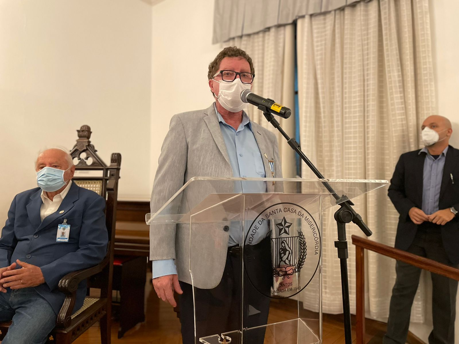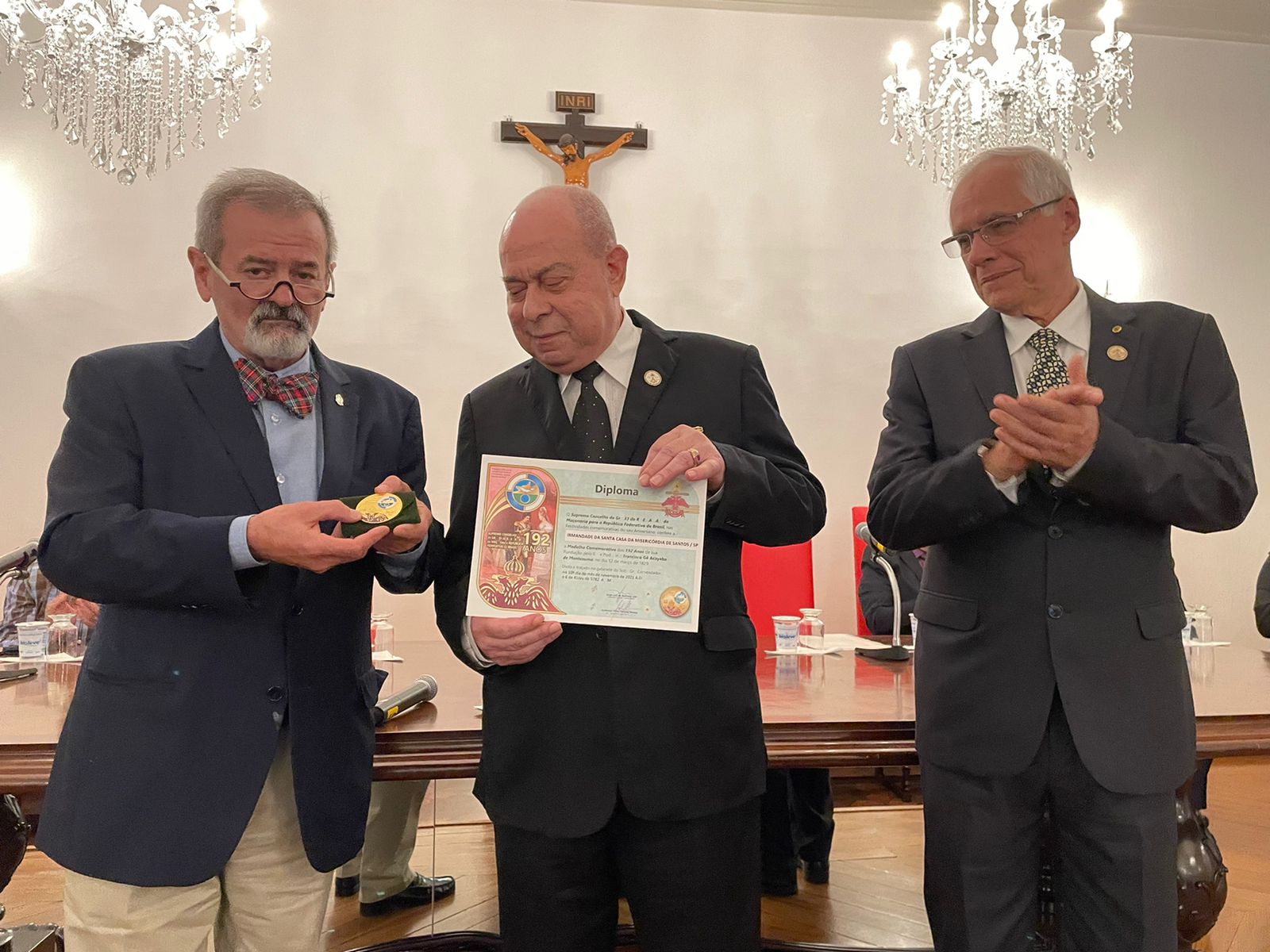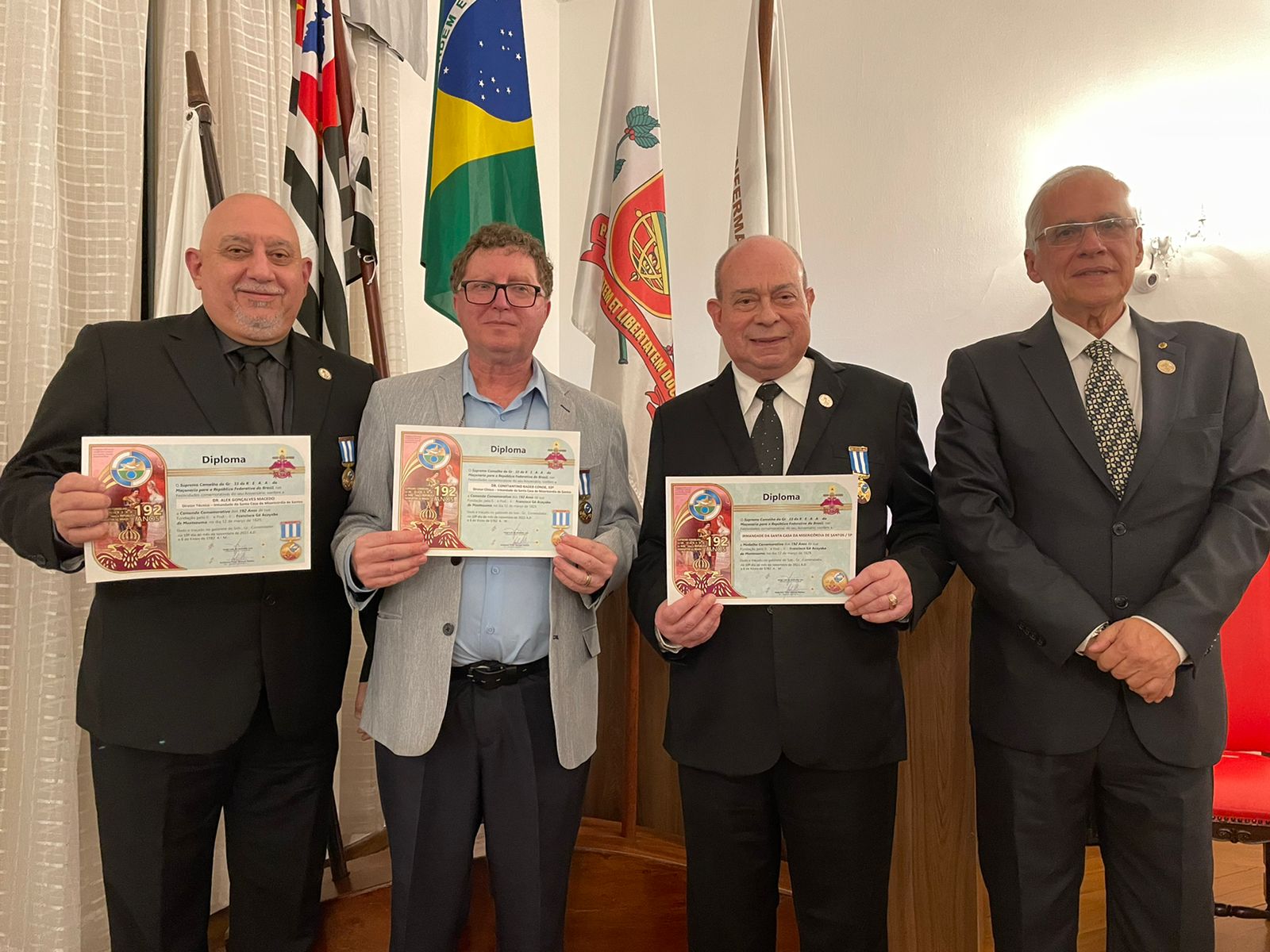 Em solenidade realizada no Consistório da Santa Casa de Santos, dia 27/5, o Provedor Ariovaldo Feliciano, o Diretor Clínico Constantino Kader Conde, o Diretor Técnico Alex Macedo Gonçalves e o próprio hospital, foram homenageados pelo Supremo Conselho do Grau 33º da Maçonaria para República Federativa do Brasil pelos serviços prestados, em especial durante a pandemia.