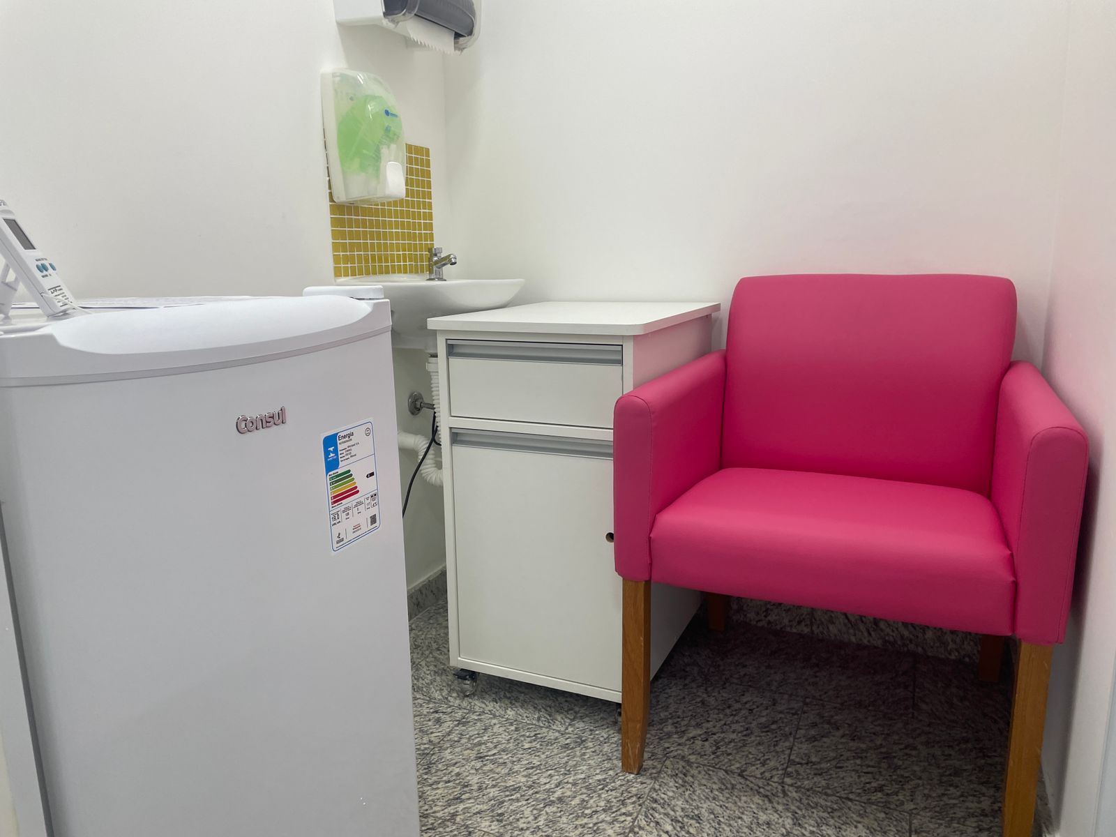 O local privativo possui poltrona e geladeira para armazenamento de leite materno para colaboradoras lactantes