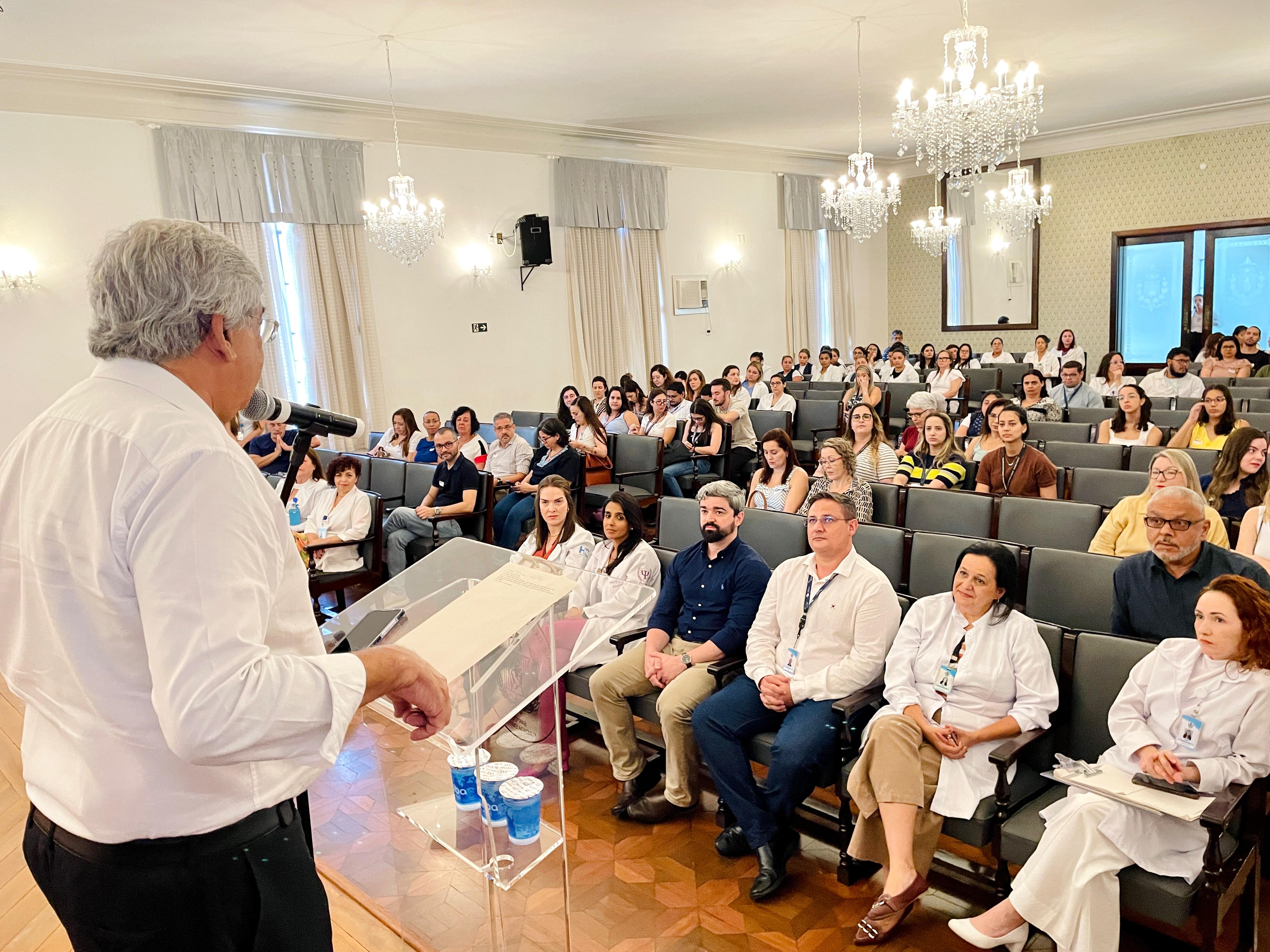 O diretor técnico, Dr. Alex Macedo, em seu momento de fala, relembrou como começaram os primeiros passos da equipe de Cuidados Paliativos na instituição e da atuação da assistente social Cláudia Jacob à frente do grupo.