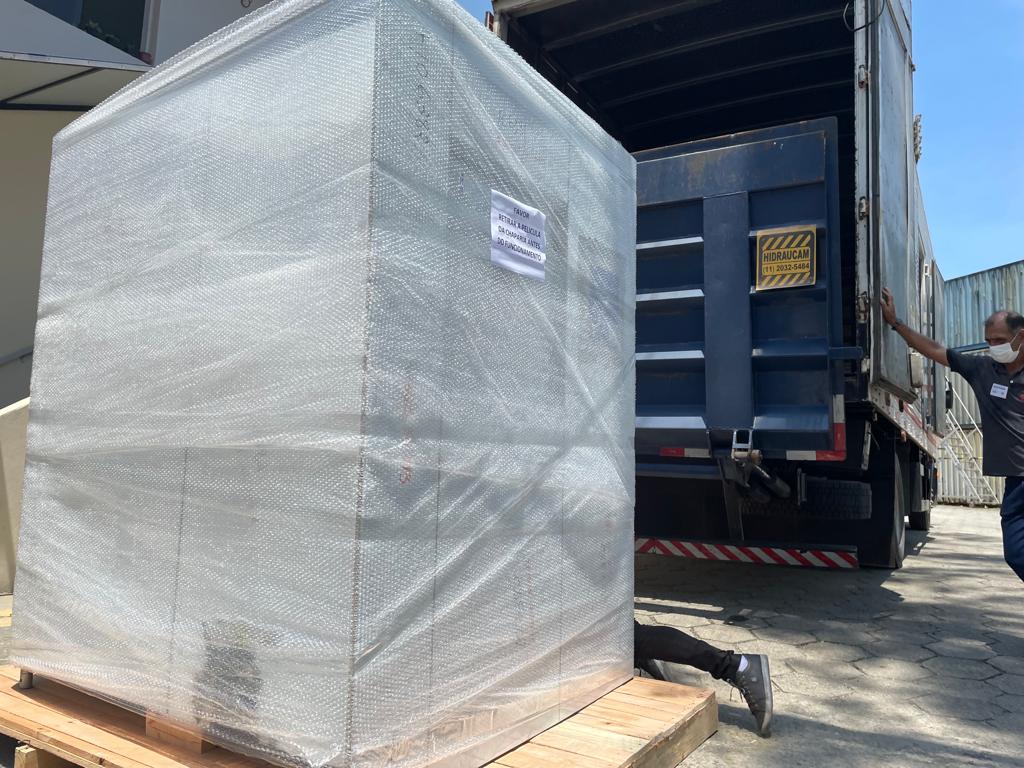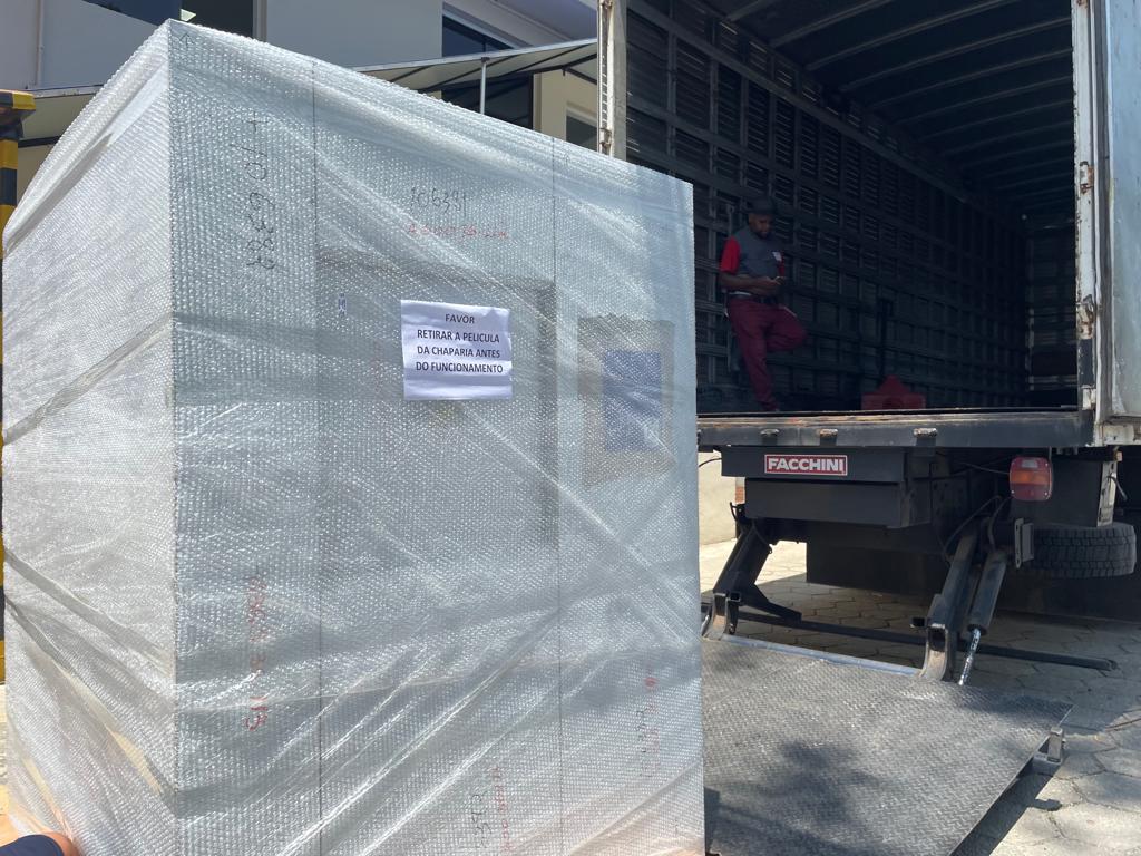 A entrega da Autoclave Universal Ultra Fast, da Ortosíntese, mobilizou a equipe da Central de Equipamentos, Engenharia Clínica e DMG, que ajudaram a transportadora a descarregar o aparelho de quase 2 toneladas.
