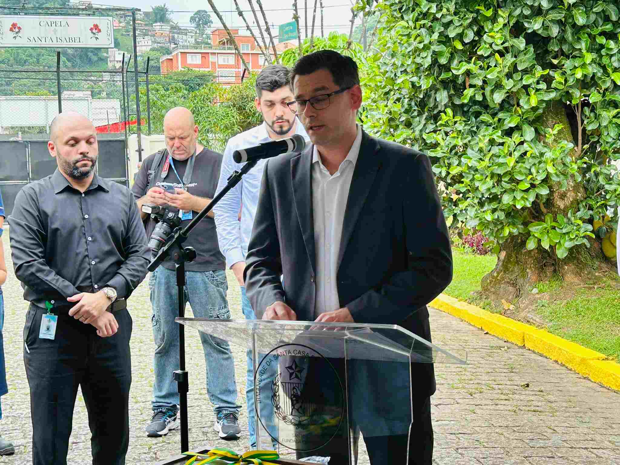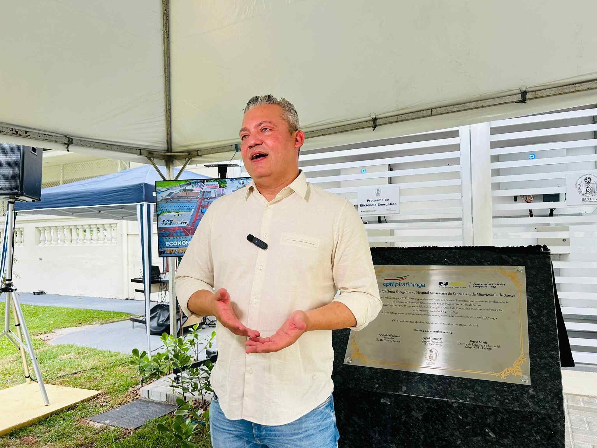 A entrega oficial do Sistema de Energia Fotovoltaica da Santa Casa de Santos aconteceu no dia 29/11/24, em solenidade que contou com o provedor do hospital, Ariovaldo Feliciano, o diretor presidente da CPFL Piratininga, Rafael Lazzaretti, e do diretor de Estratégia e Inovação do Grupo CPFL Energia, Bruno Monte.