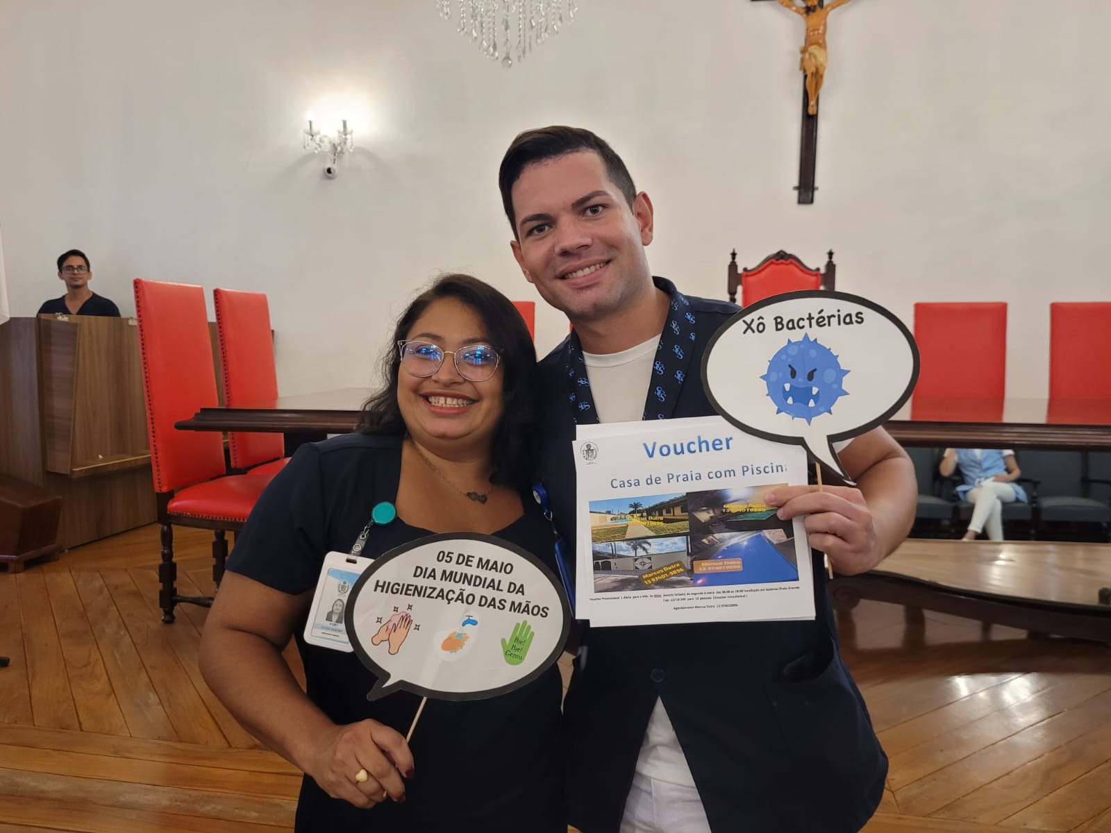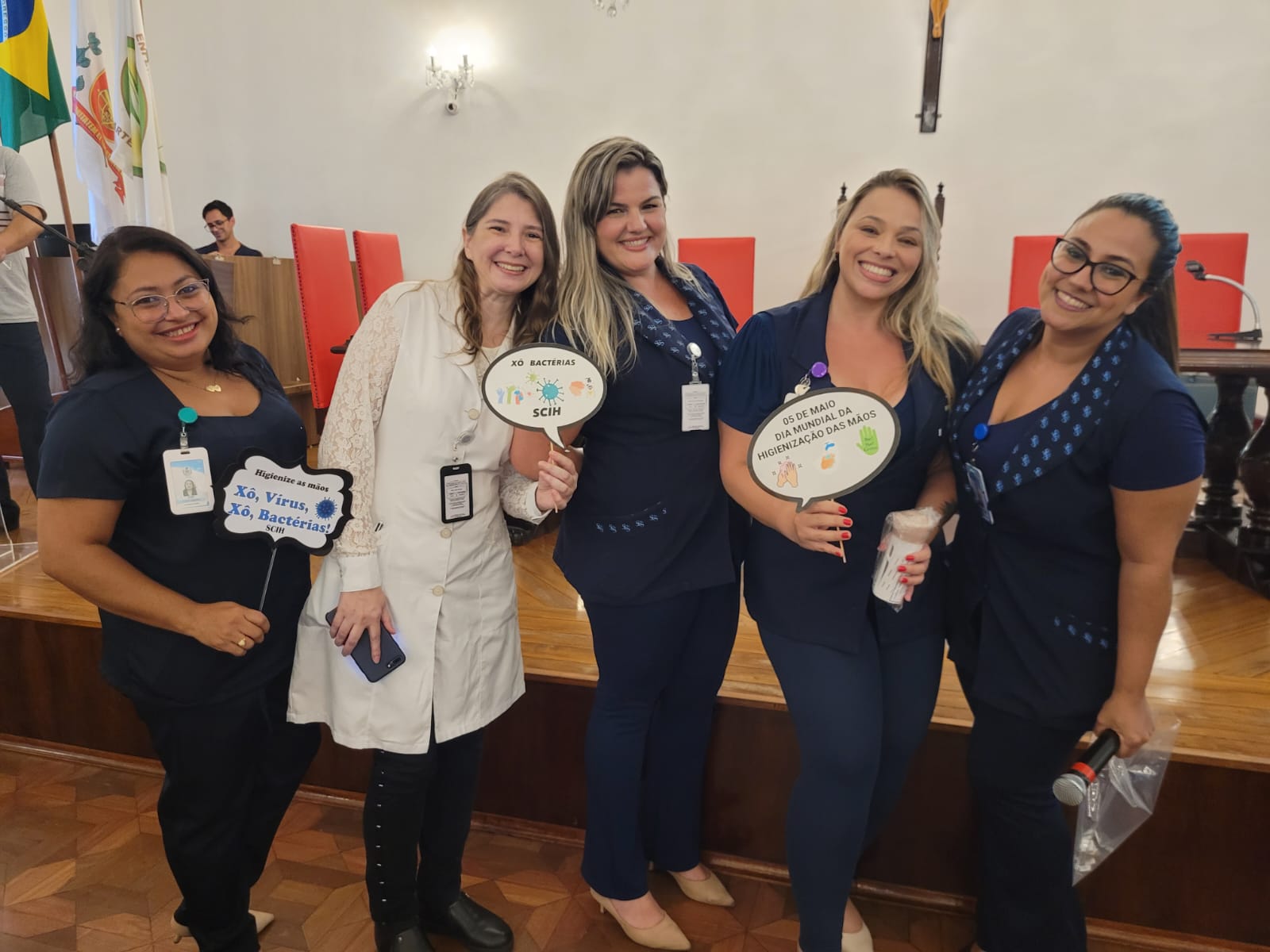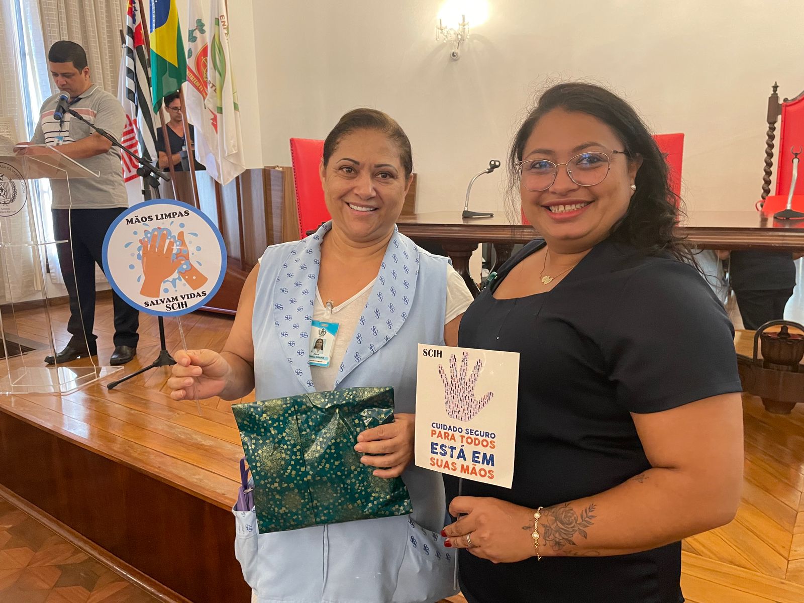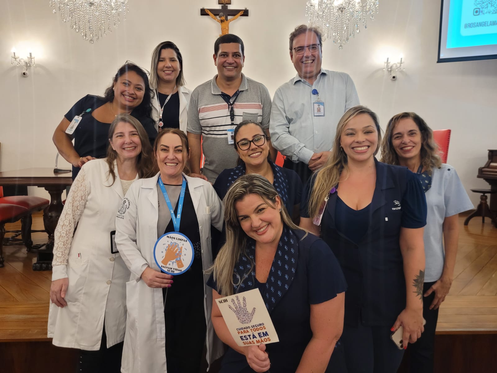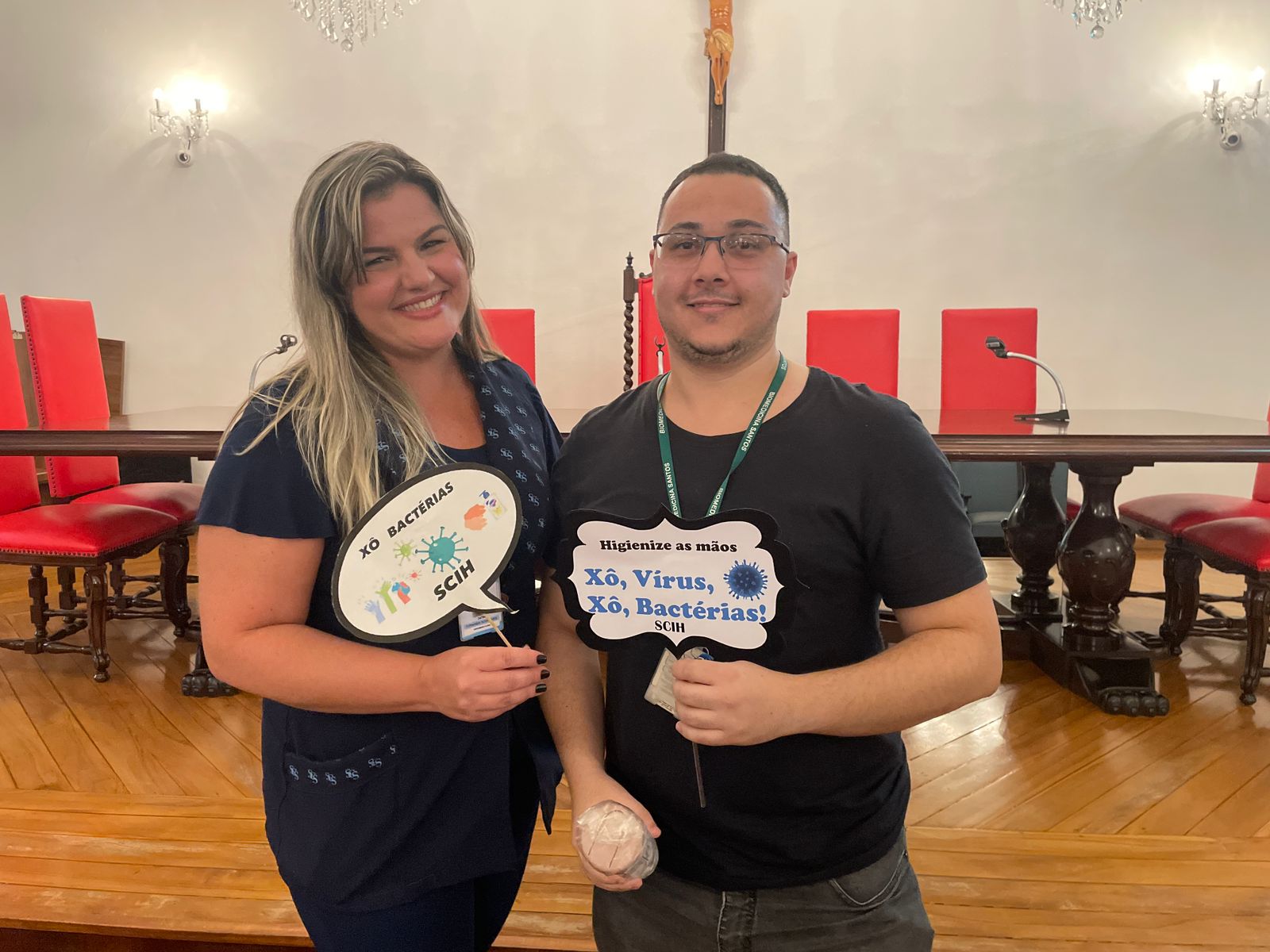 Além disso, foi apresentado vídeos educacionais que ensinam a técnica correta de higienizar as mãos e também o Índice da Taxa de Infecção Hospitalar da Santa Casa de Santos, que em 2015 era de 5,5% e em 2023 caiu para 2,2%. Esse número é o resultado do trabalho da equipe da CCIH, dentro das unidades de internação, especialmente nas UTI’s.
