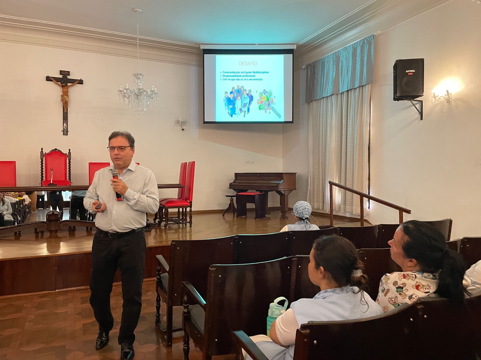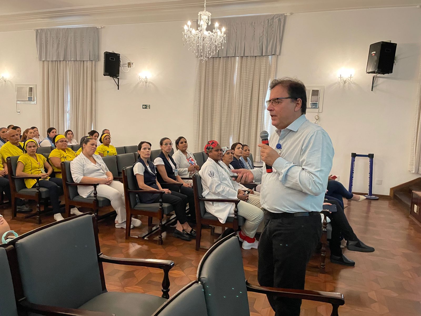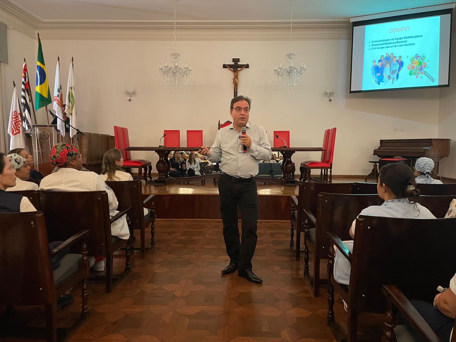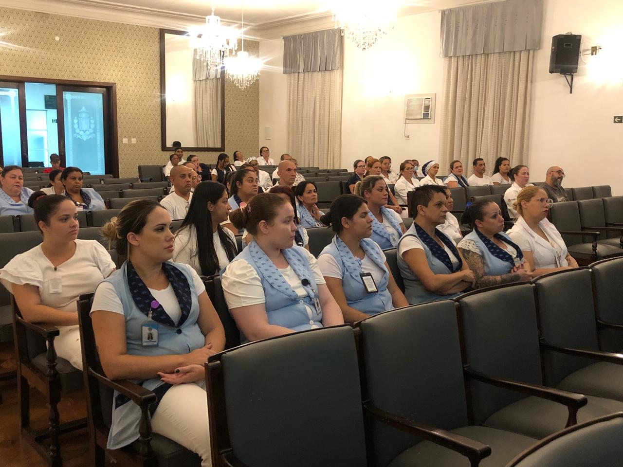 Na última terça-feira, 7 de maio, o Consistório da Santa Casa de Santos recebeu duas palestras com o tema: O Impacto da Higienização das Mãos em Ambiente Hospitalar. No período da tarde, foi ministrada pelo Médico Infectologista e Presidente da Comissão de Controle de Infecção Hospitalar (CCIH), Dr. Sérgio Feijoó Rodriguez. E para os colaboradores do período noturno, a palestra foi ministrada pela Enfermeira do Serviço de Controle de Infecção Hospitalar (SCIH), Olivia Guedes Silva. Ao final do evento teve sorteio de brindes aos participantes. Ao todo, 180 colaboradores assistiram o curso.