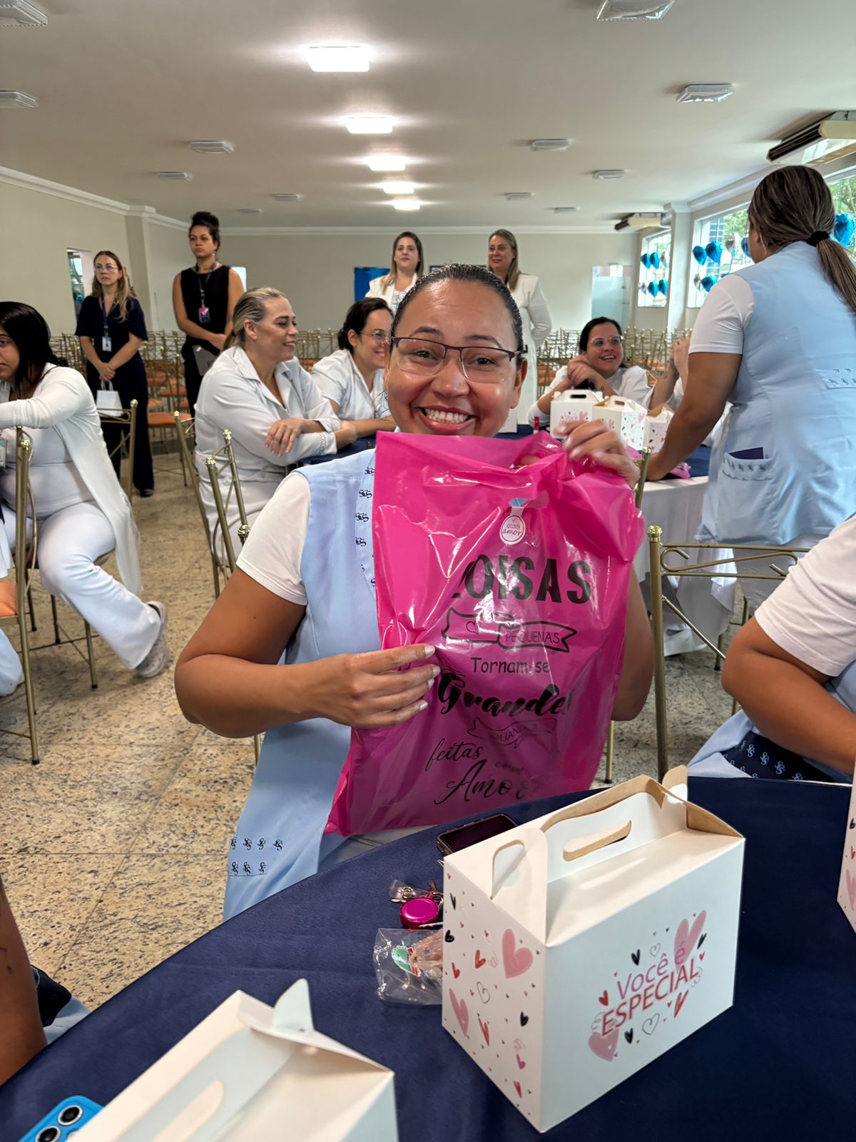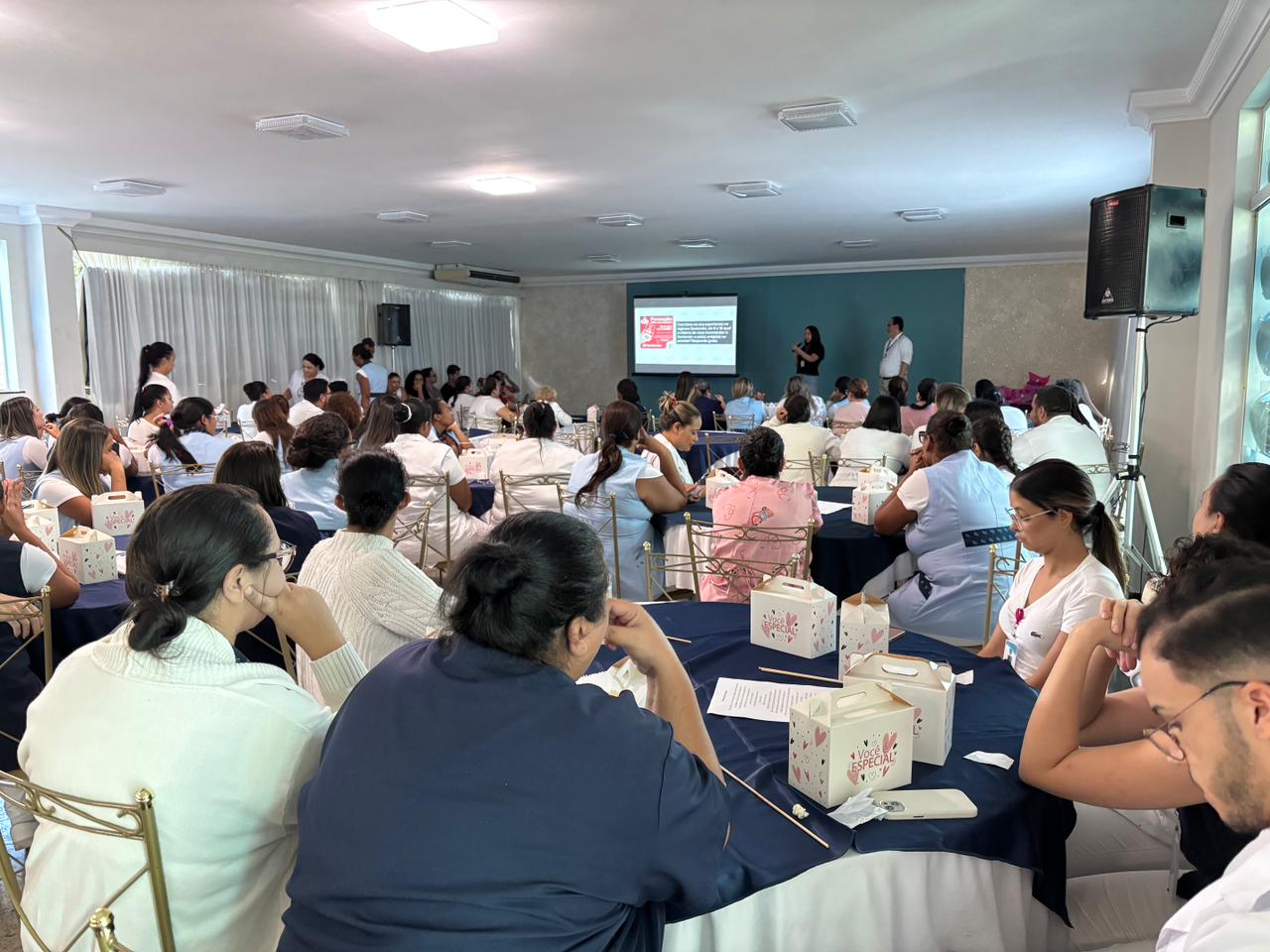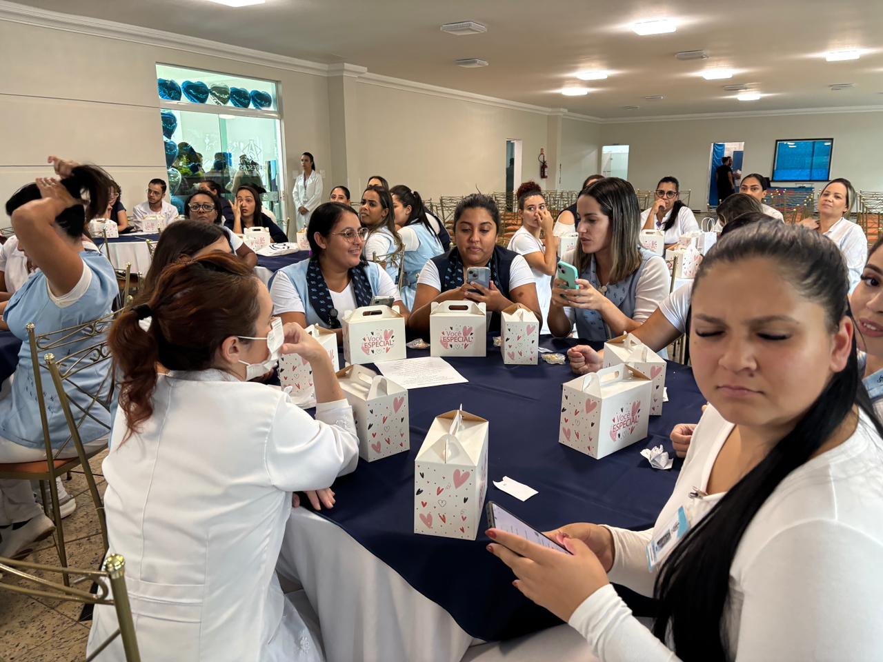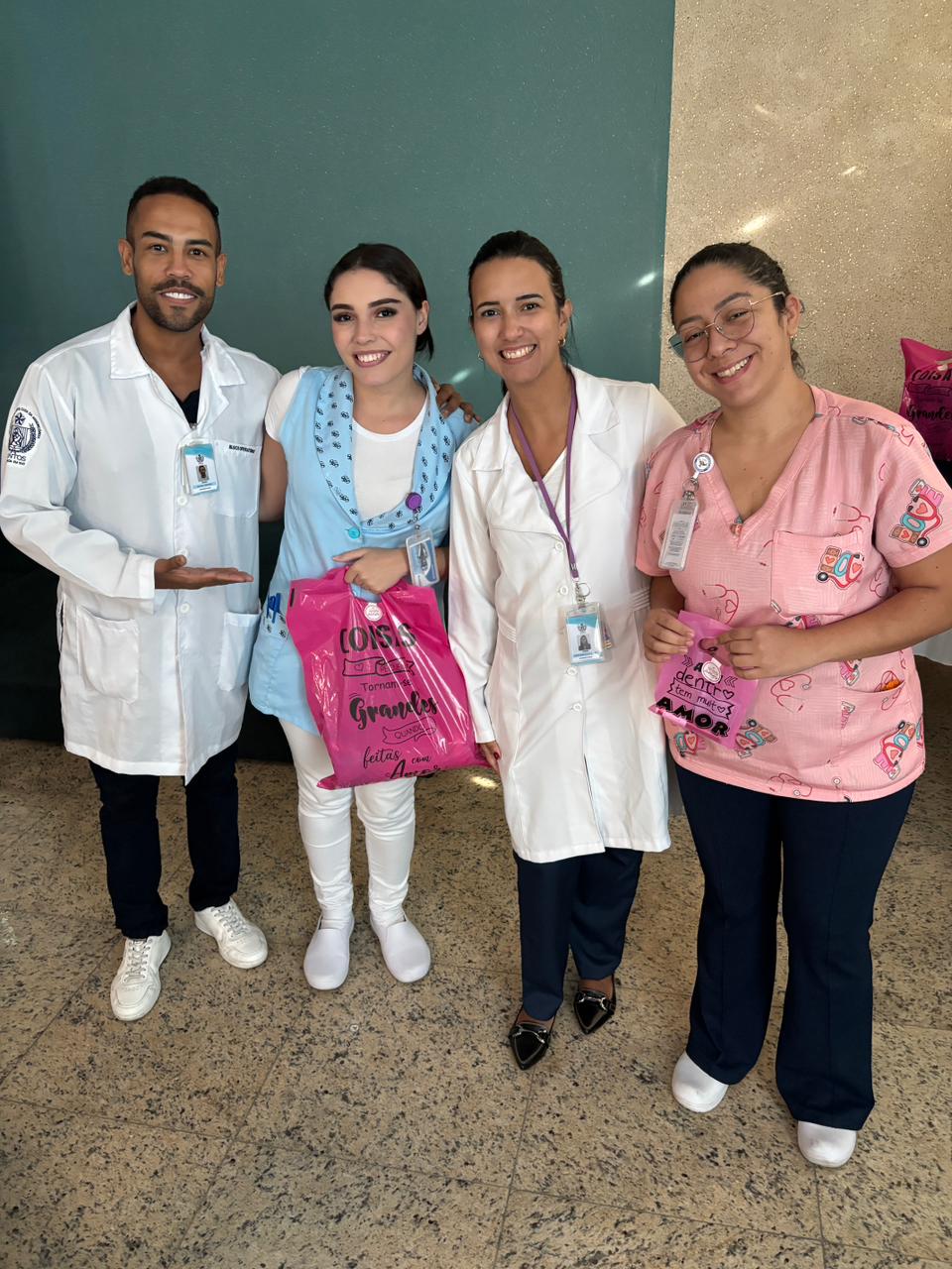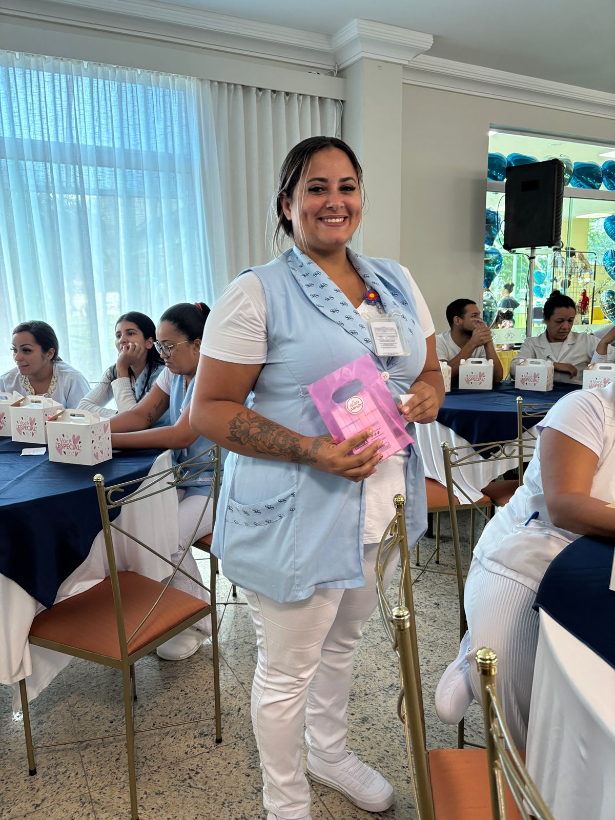 Também foram sorteados diversos brindes e os colaboradores receberam uma caixa com lanche e um porta crachá especial da Semana da Enfermagem.