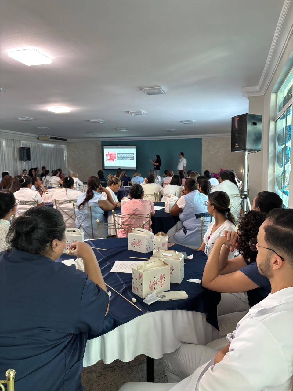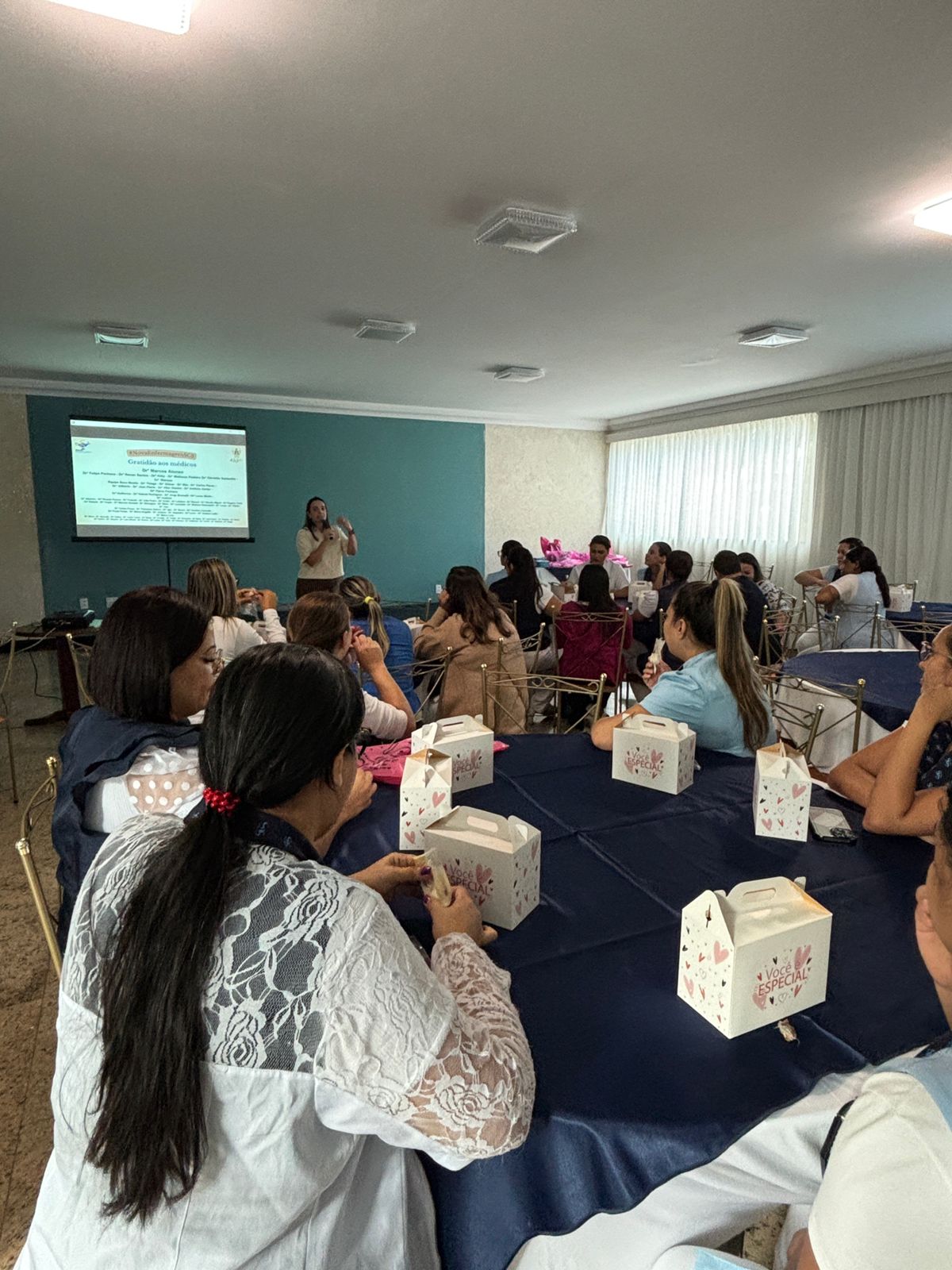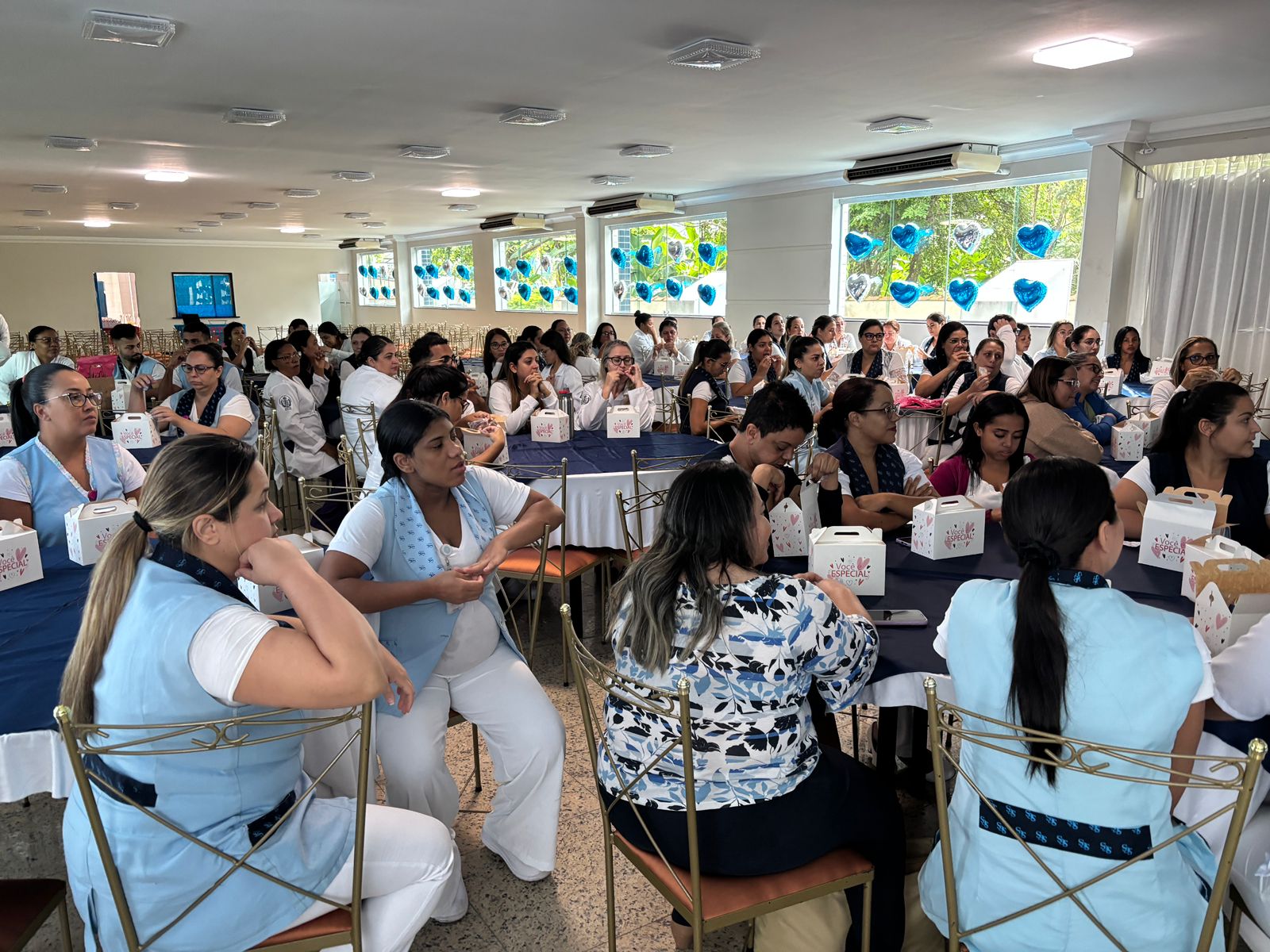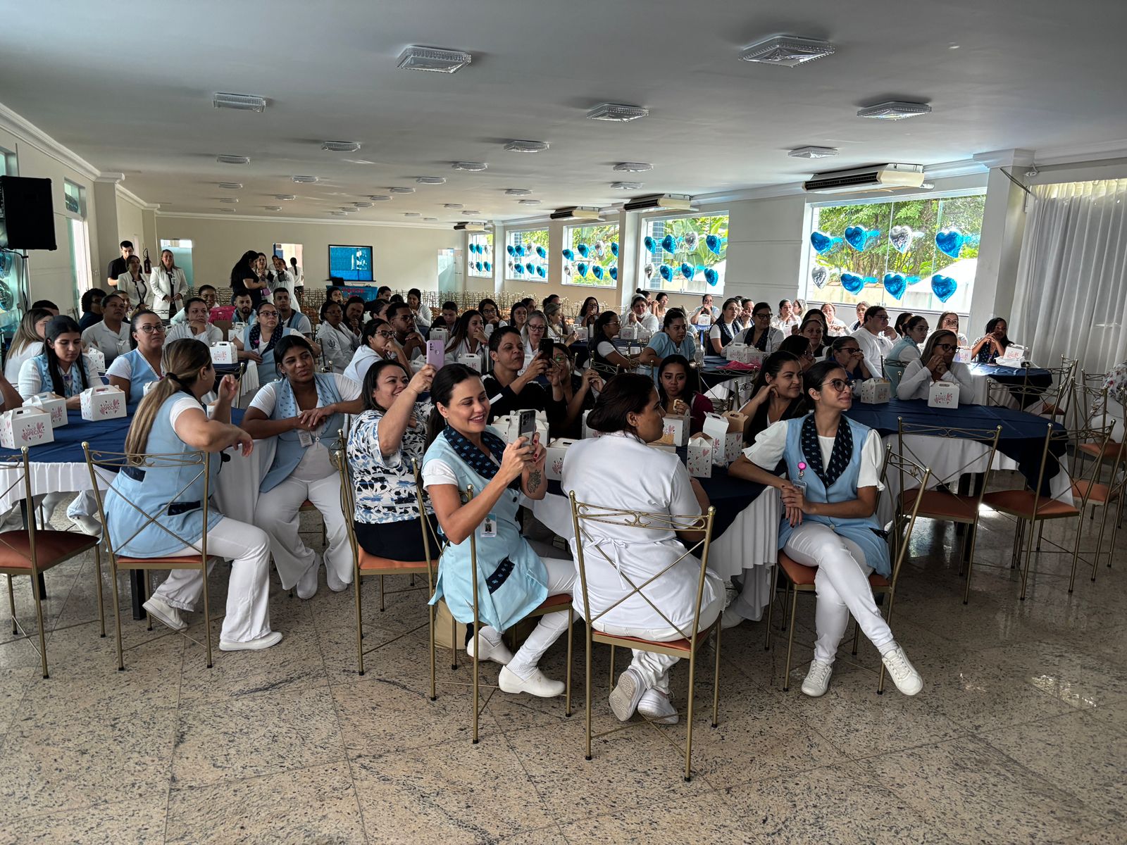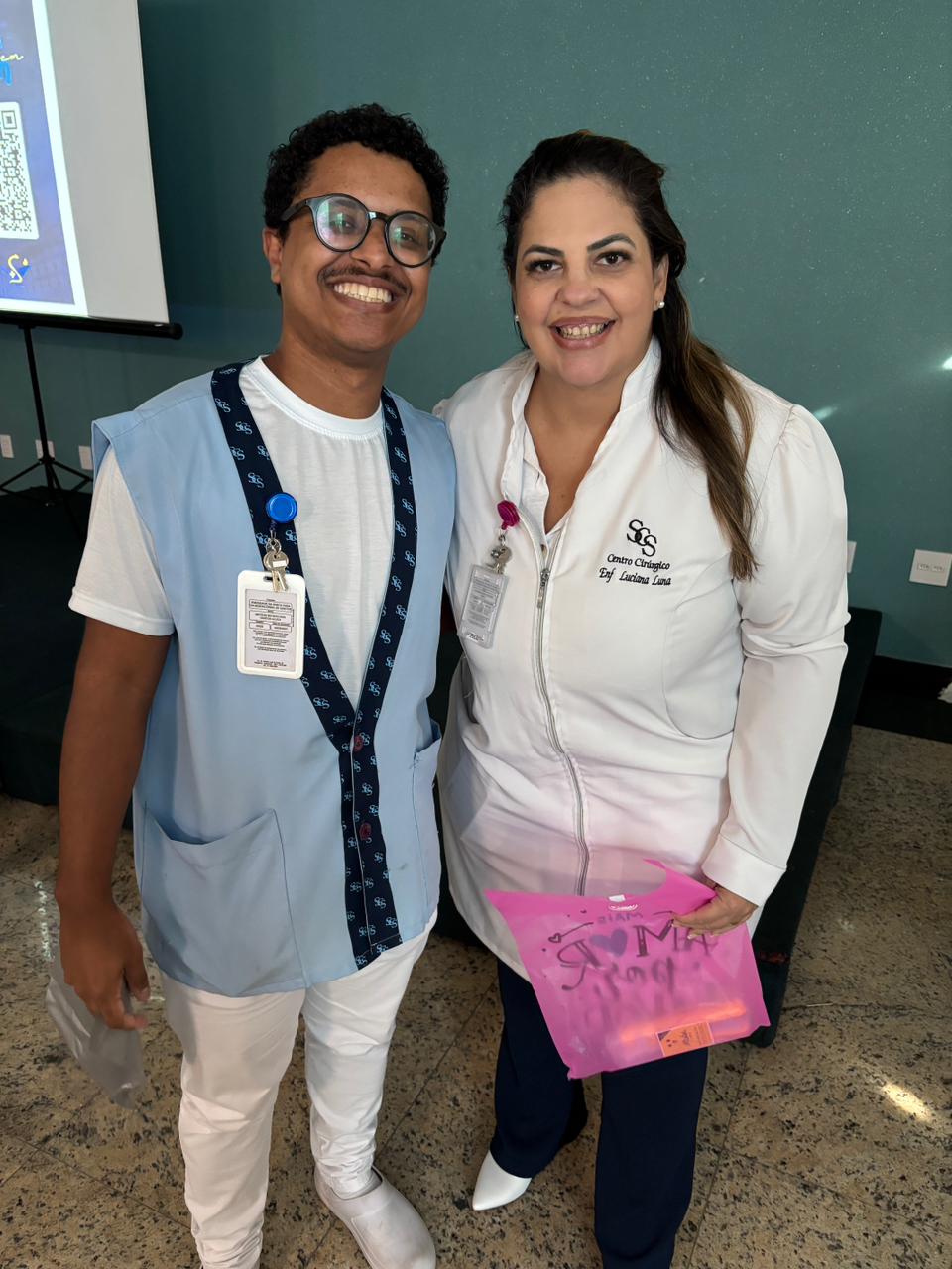 Também foram sorteados diversos brindes e os colaboradores receberam uma caixa com lanche e um porta crachá especial da Semana da Enfermagem.