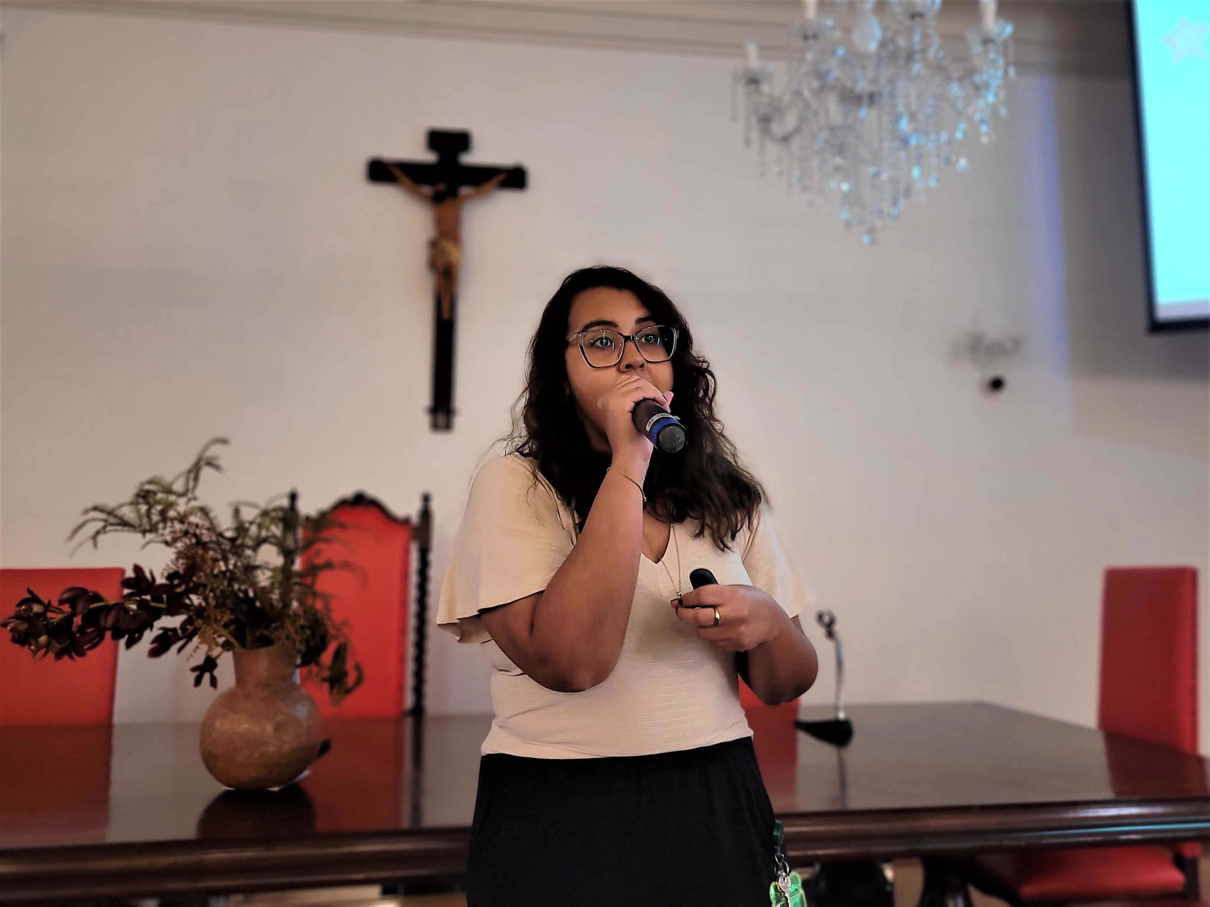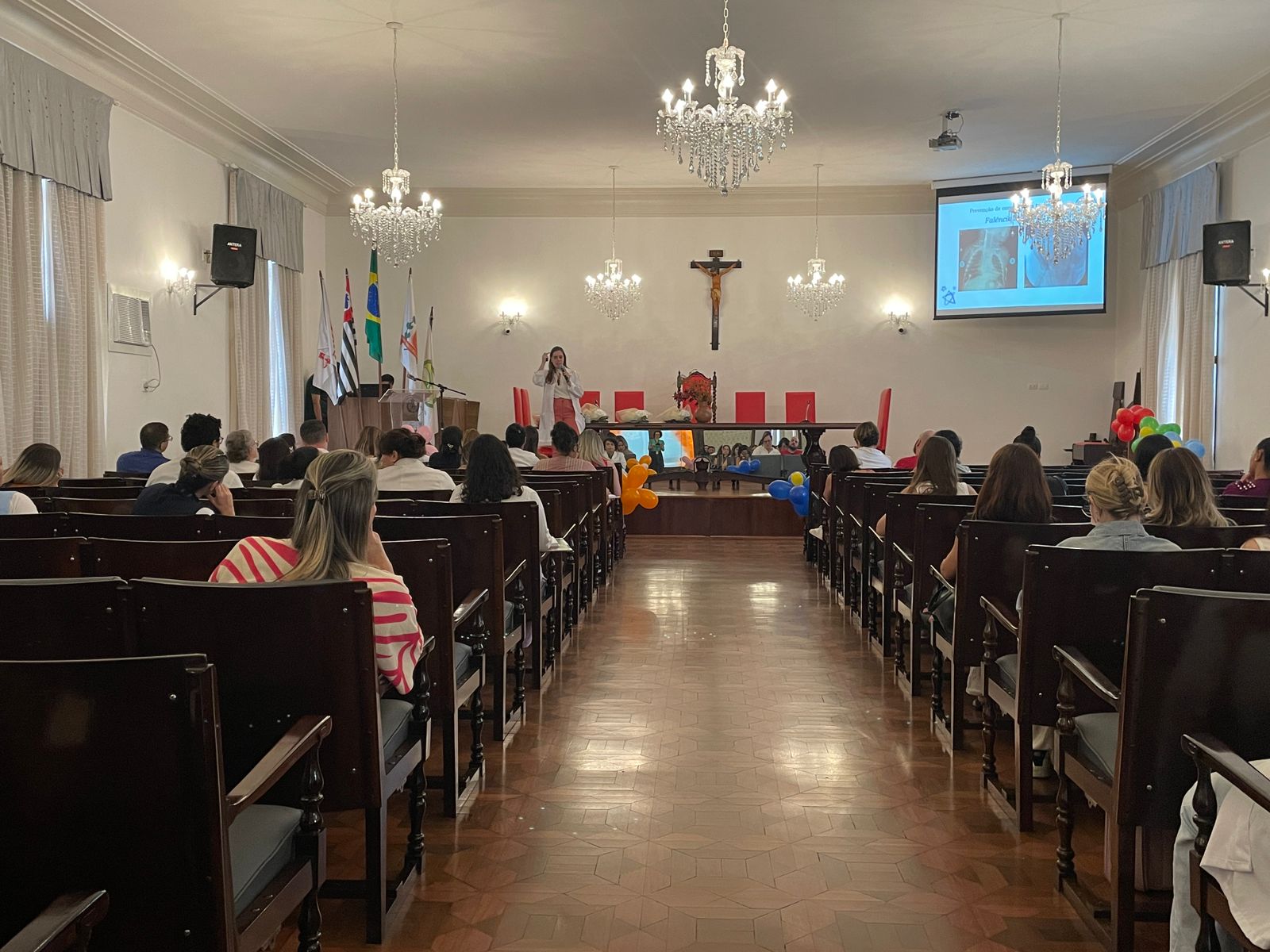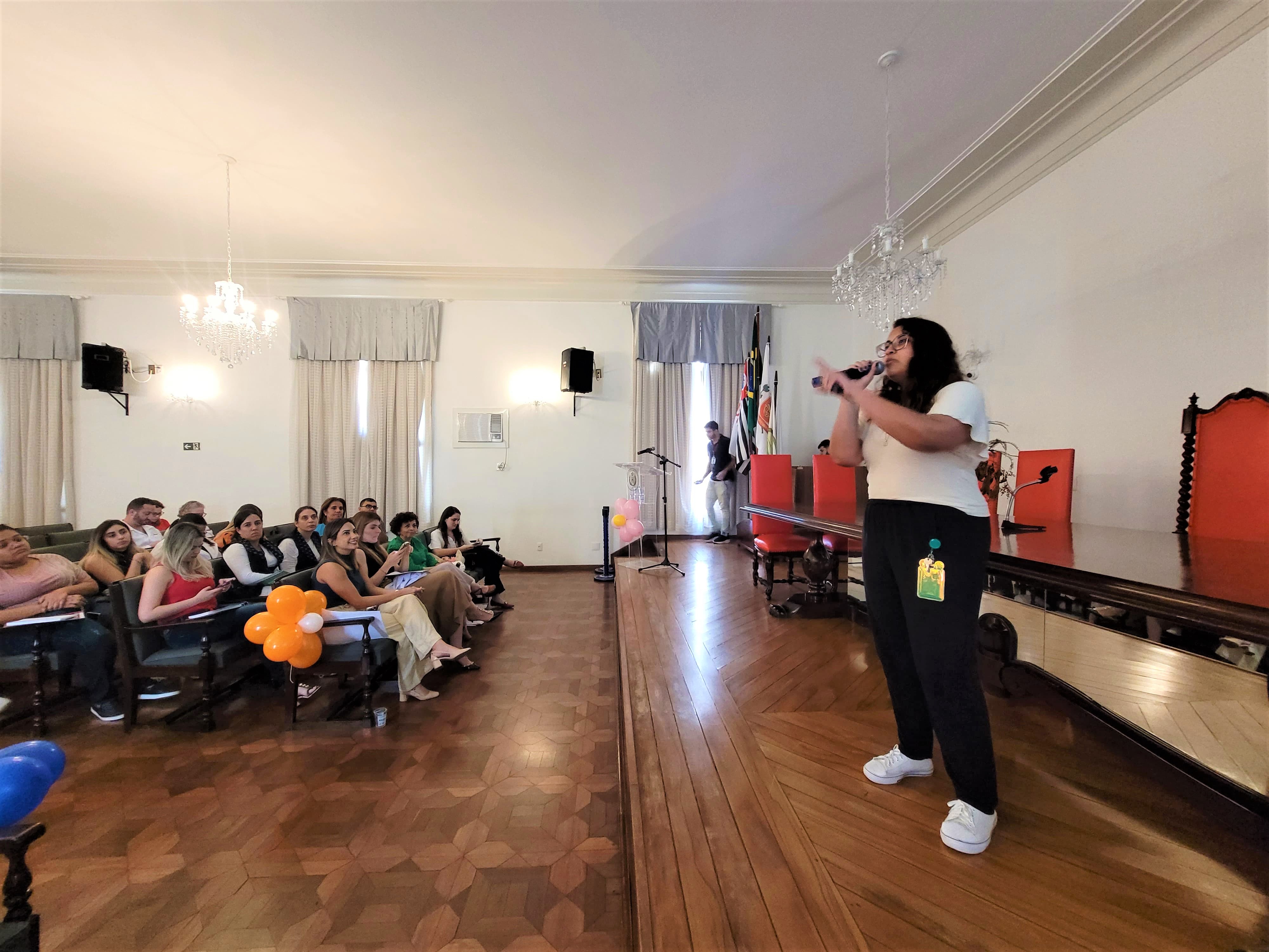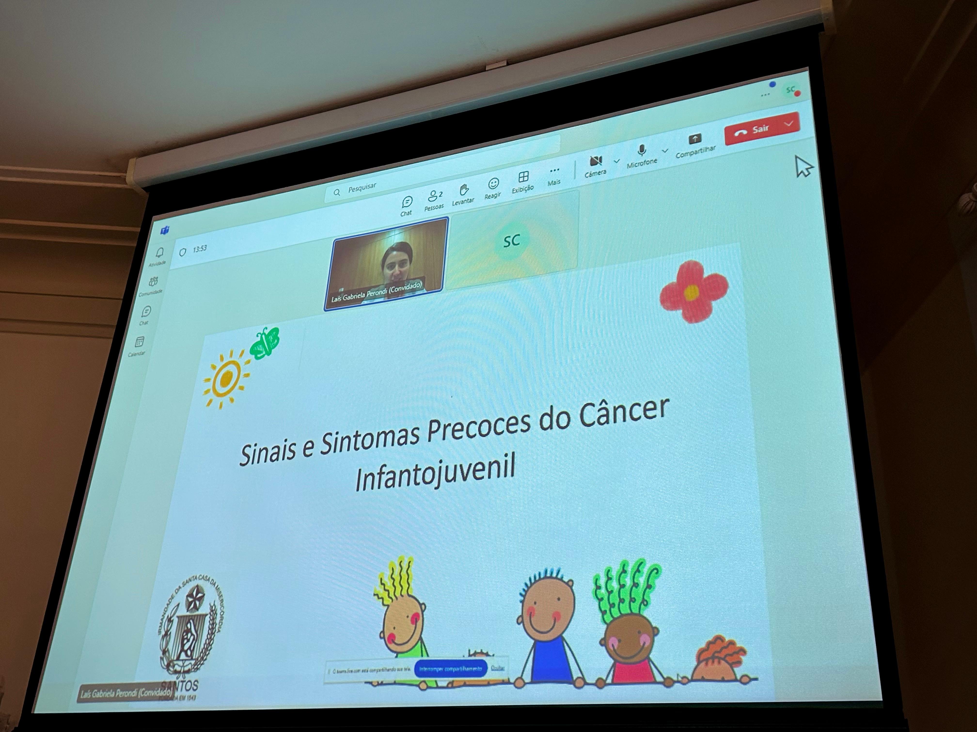 A segunda palestra foi com a médica oncologista pediátrica responsável pelo Serviço de Oncopediatra da Santa Casa, Drª. Fabiola Velarde, que falou sobre os sinais e sintomas do câncer, e a importância do diagnóstico precoce. Drª. Fabiola também explicou que a causa do câncer infanto juvenil ainda é desconhecida.