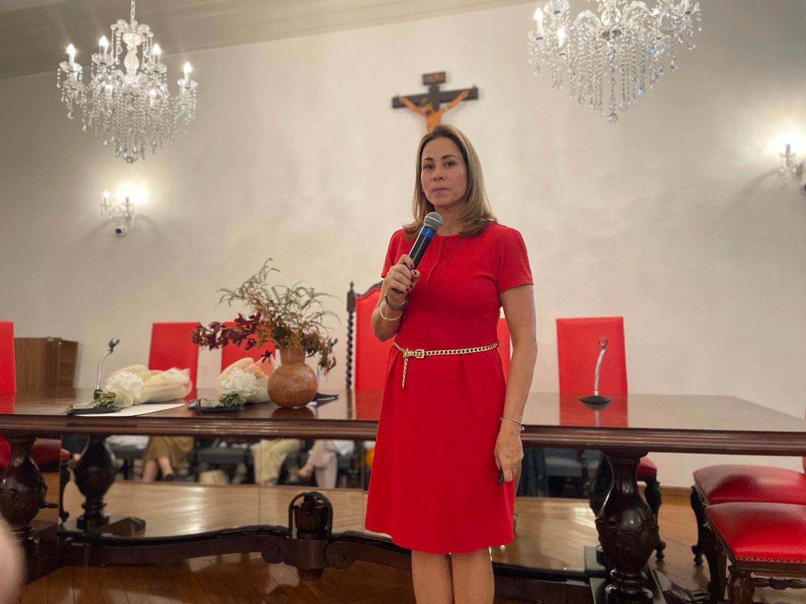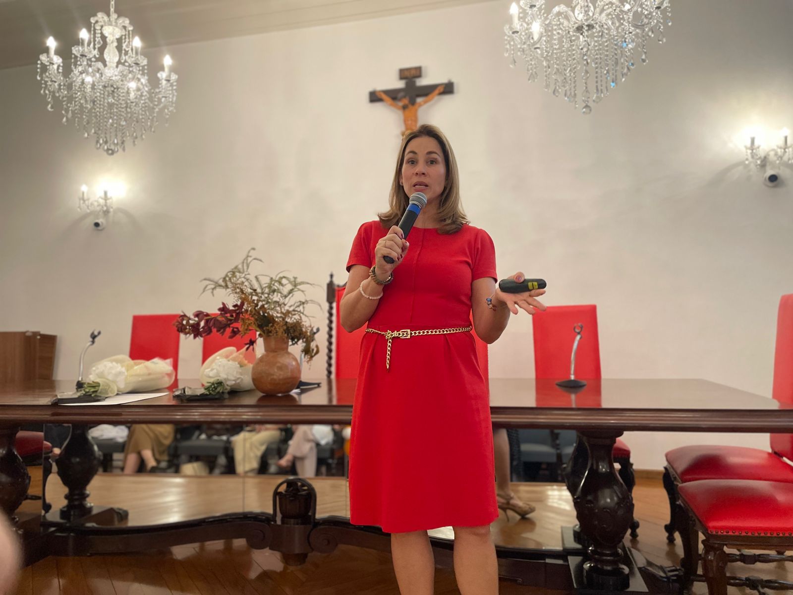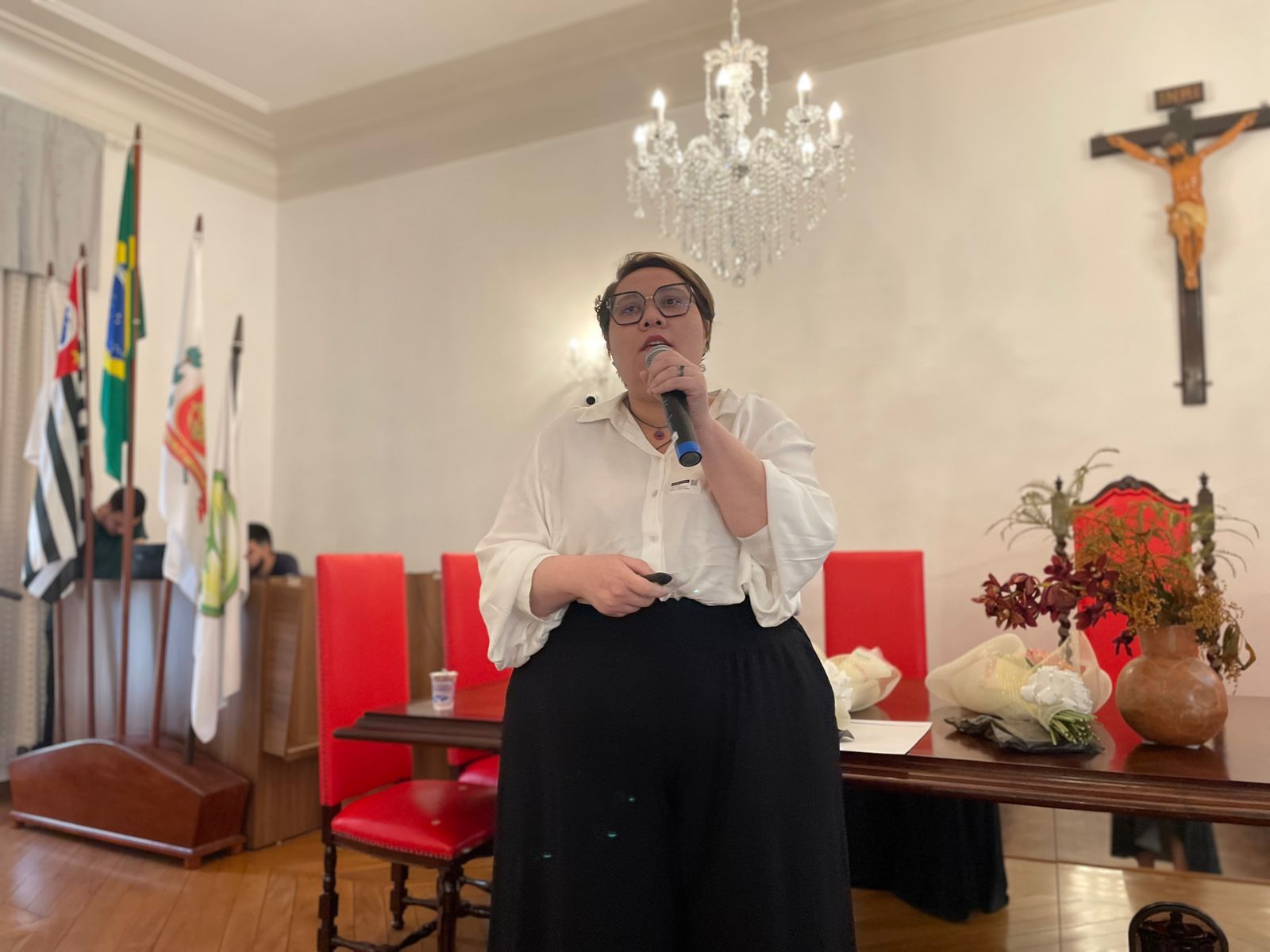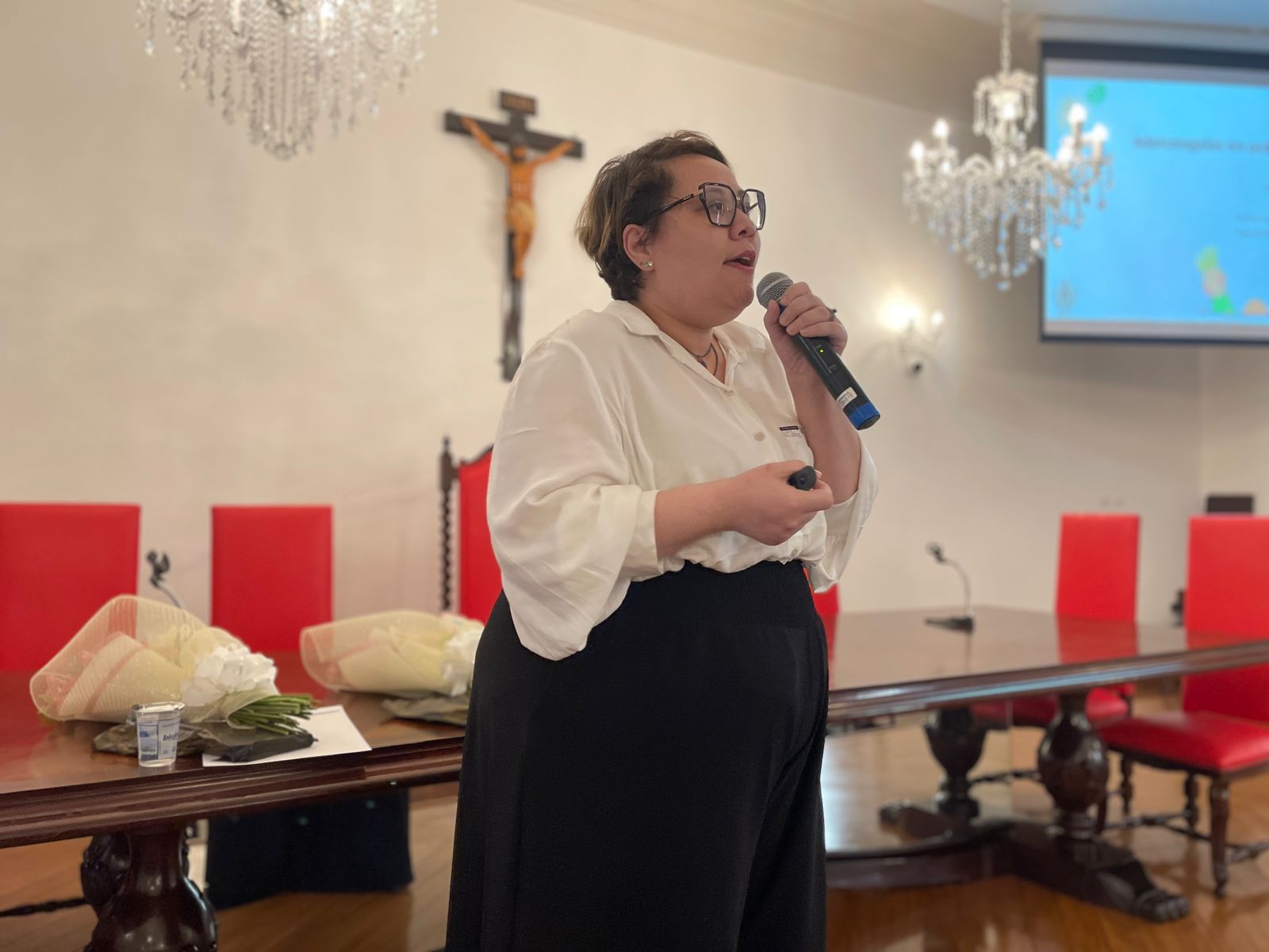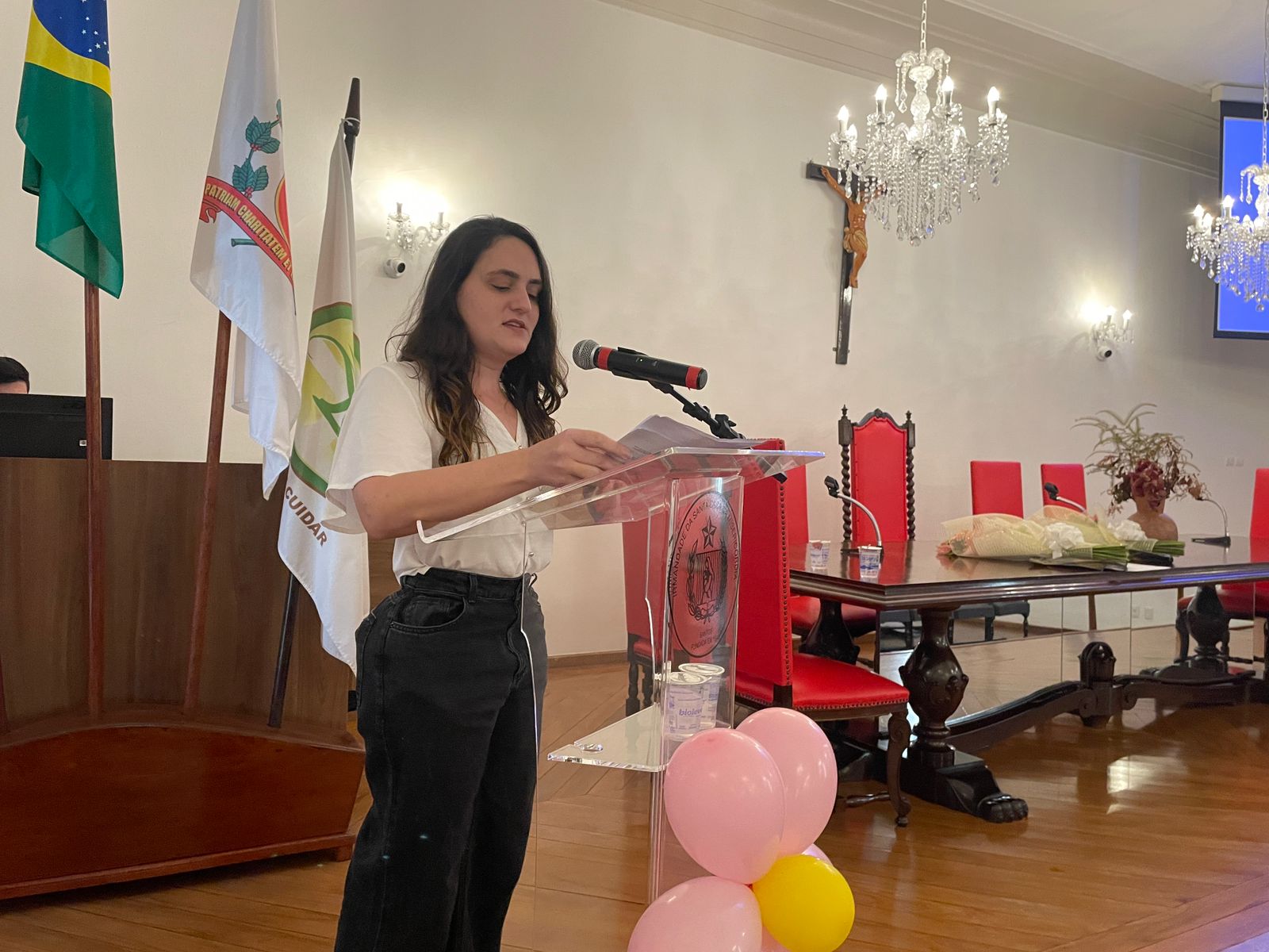 A segunda palestra foi com a médica oncologista pediátrica responsável pelo Serviço de Oncopediatra da Santa Casa, Drª. Fabiola Velarde, que falou sobre os sinais e sintomas do câncer, e a importância do diagnóstico precoce. Drª. Fabiola também explicou que a causa do câncer infanto juvenil ainda é desconhecida.