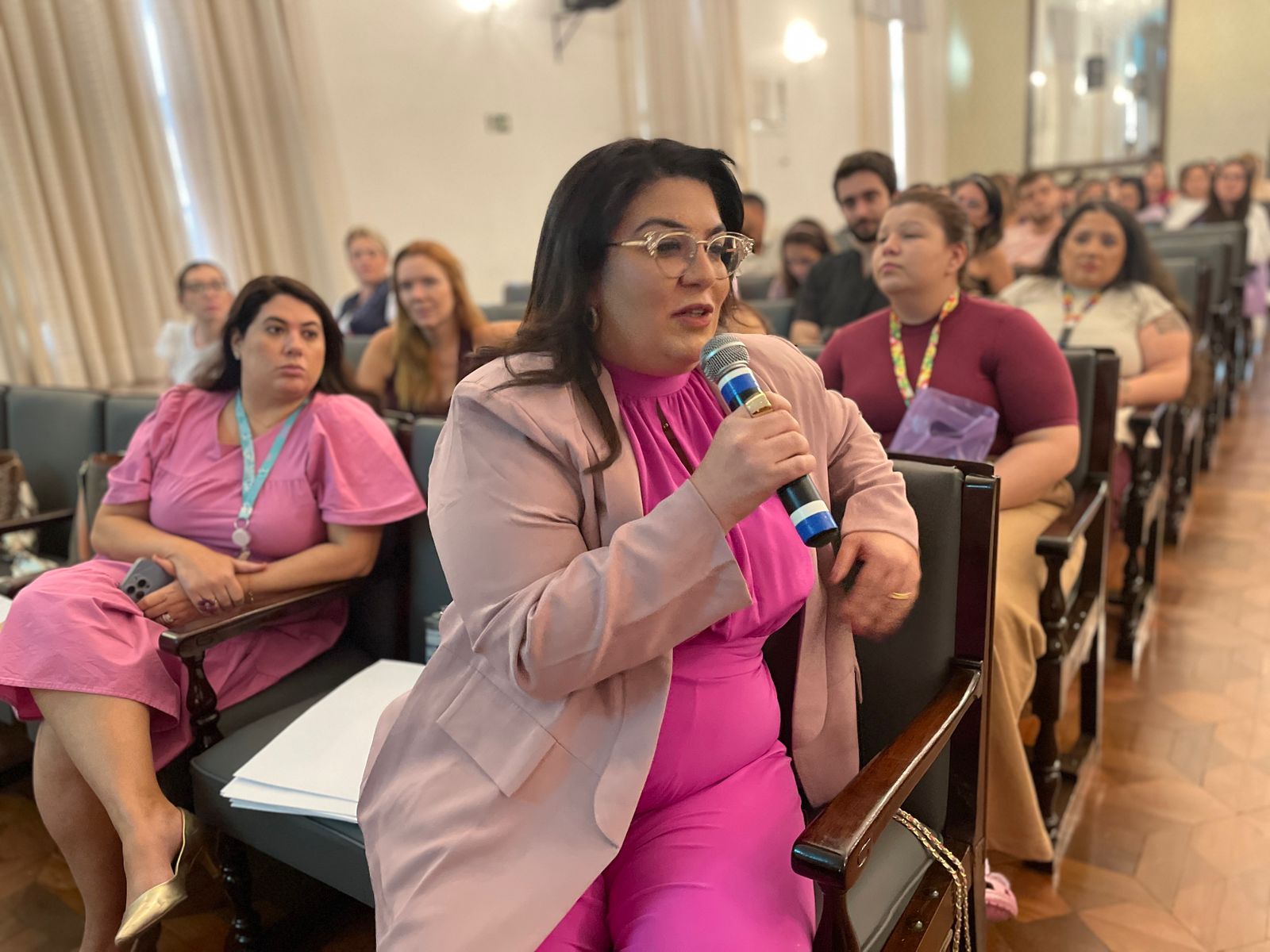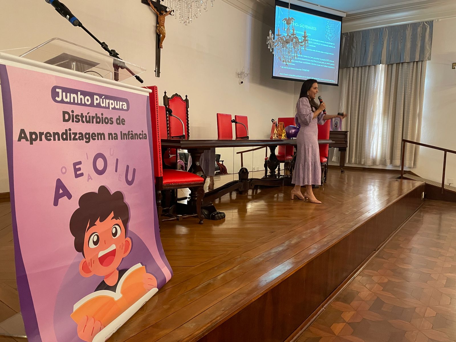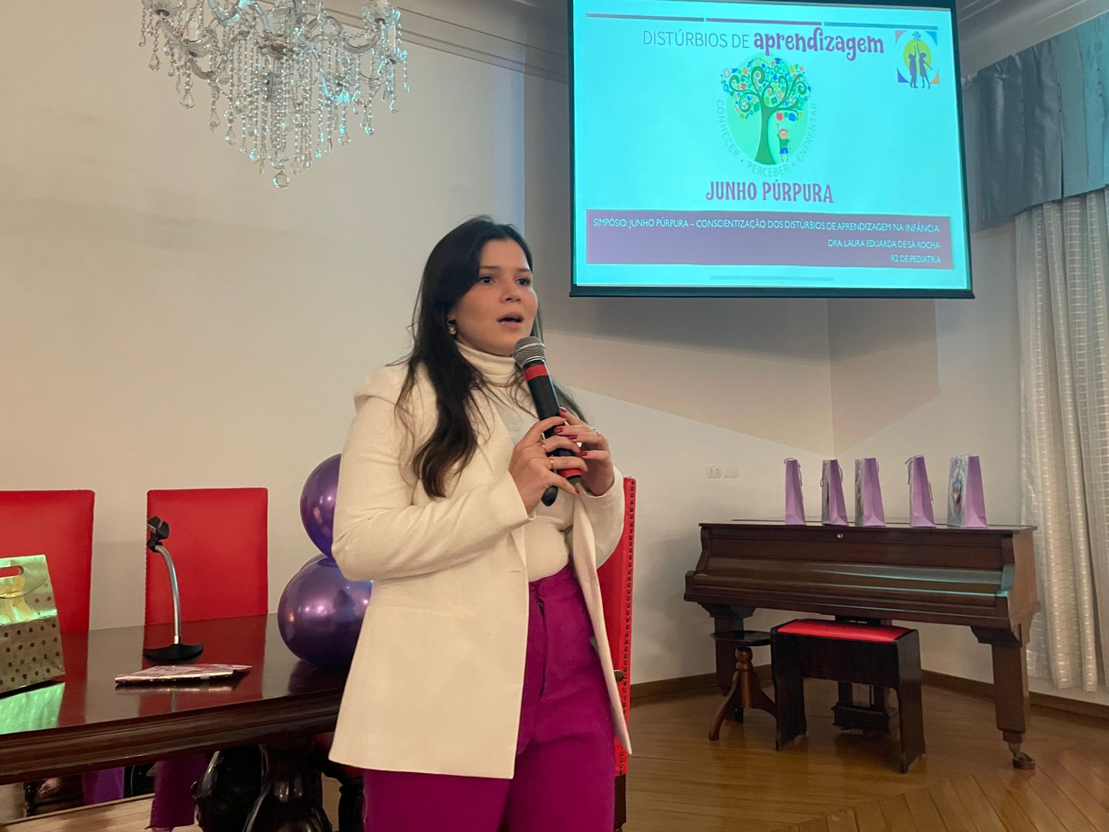 A primeira palestra foi ministrada pela médica residente da Pediatria, Drª. Aline Onahara, que falou sobre a campanha Junho Púrpura, seus objetivos e a importância dos distúrbios de aprendizagem no contexto pediátrico.
