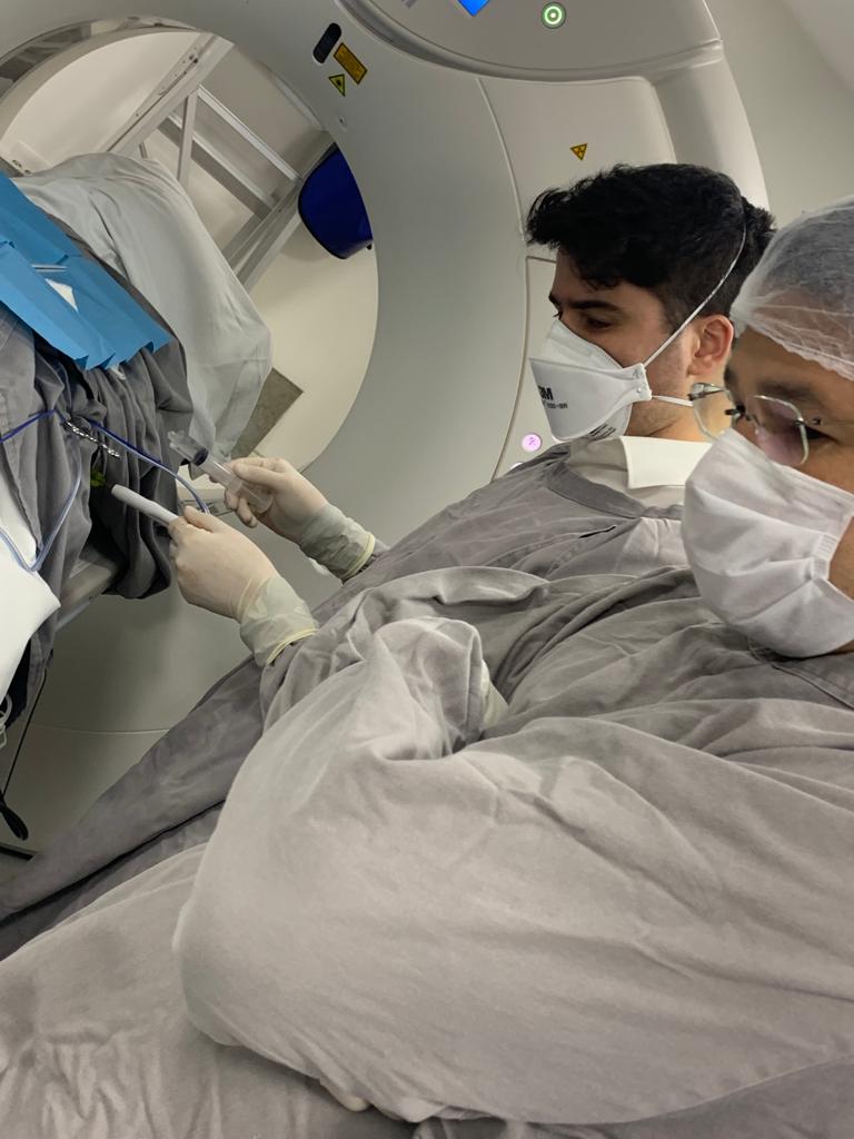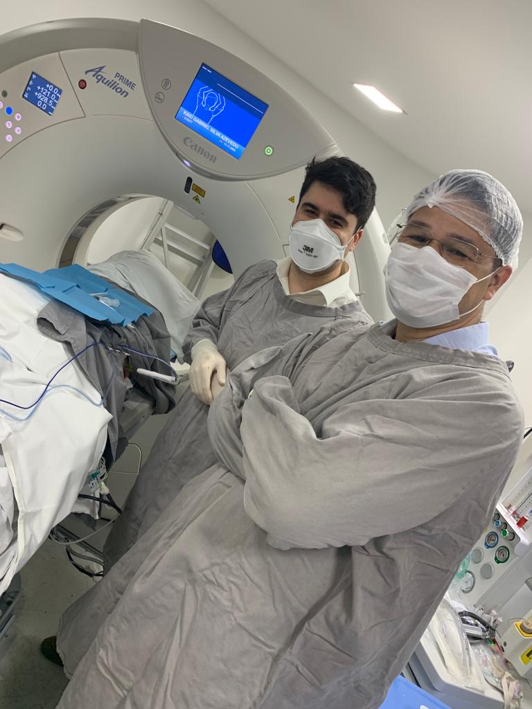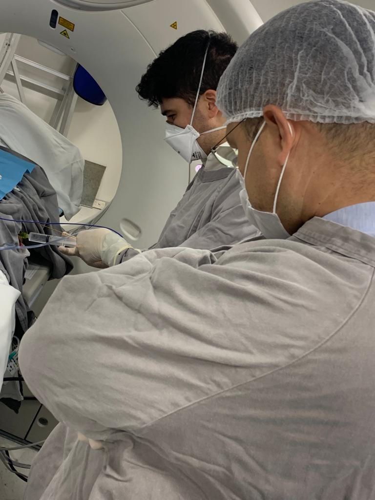 Para a realização do procedimento, uma das salas do Serviço de Tomografia foi equipada como um centro cirúrgico, com equipe e todos os recursos necessários por cerca de 2 horas.