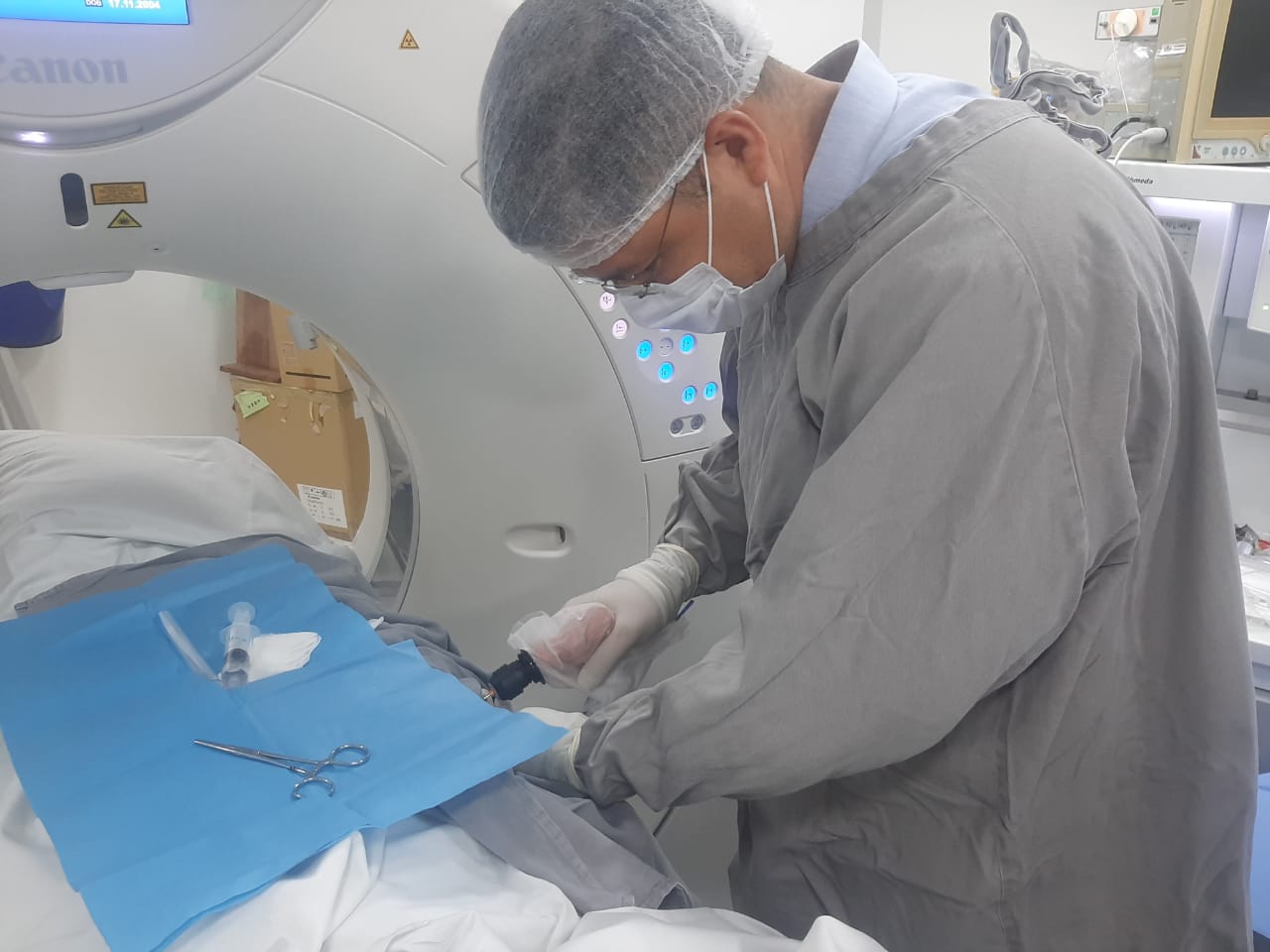 O paciente é posicionado no aparelho da tomografia computadorizada (TC) e submetido a anestesia geral. São feitas medidas de assepsia e antissepsia para o procedimento.