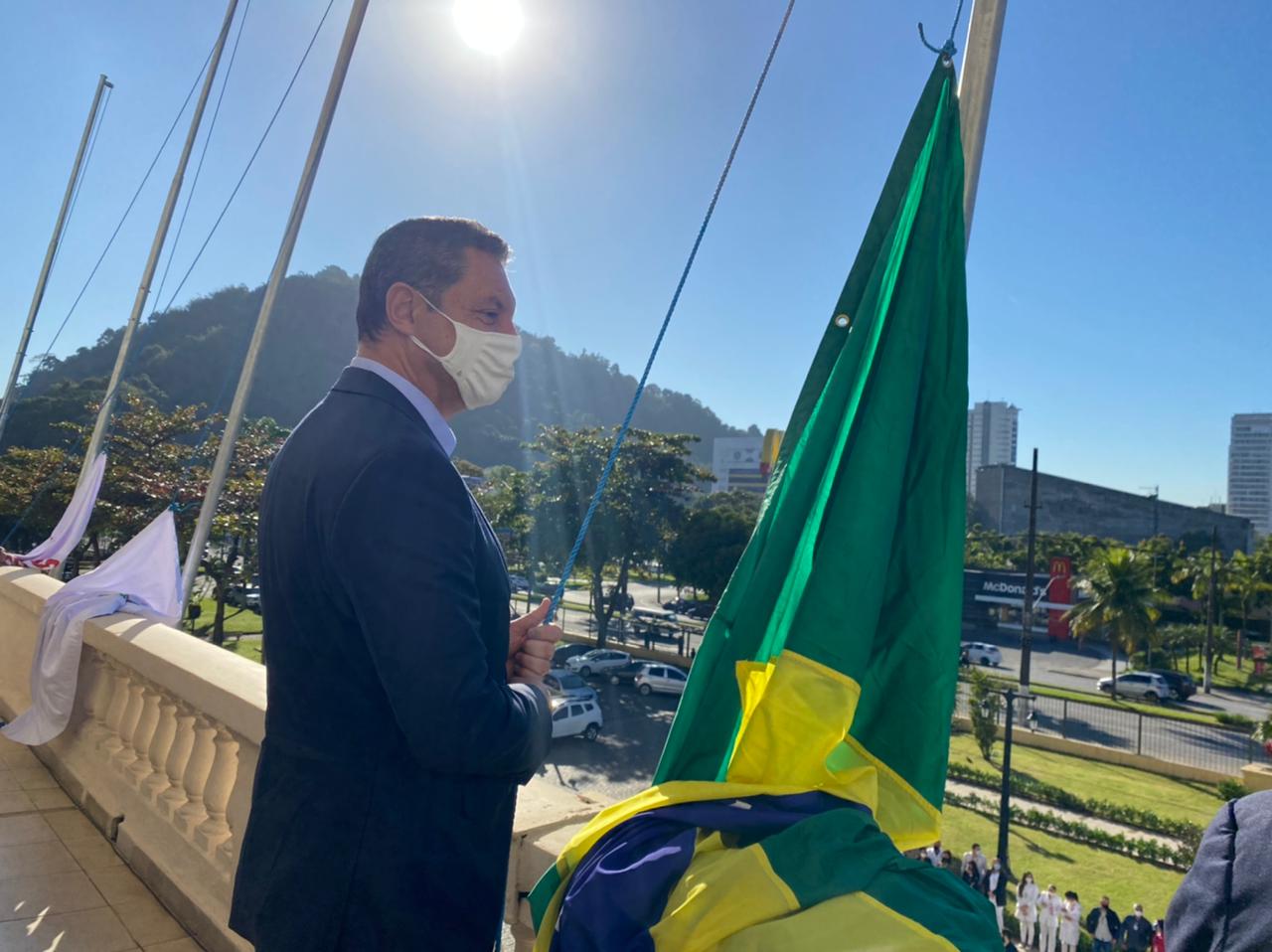 Prefeito de Santos, Rogério Santos, marcou presença para o hasteamento da bandeira, e Banda da Polícia Militar animou a programação aberta ao público.