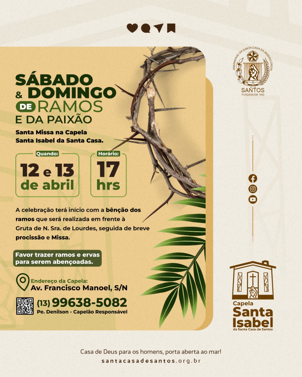A programação especial para a Semana Santa, na Capela Santa Isabel terá início no Sábado e Domingo de Ramos e da Paixão, nos dias 12 e 13/4, às 17 horas. A celebração terá início com a benção dos ramos, que será realizada em frente à Gruta de Nossa Senhora de Lourdes, seguida de breve procissão e a Santa Missa celebrada pelo Capelão Padre Denilson. Os fiéis podem levar ramos e ervas para serem abençoadas.