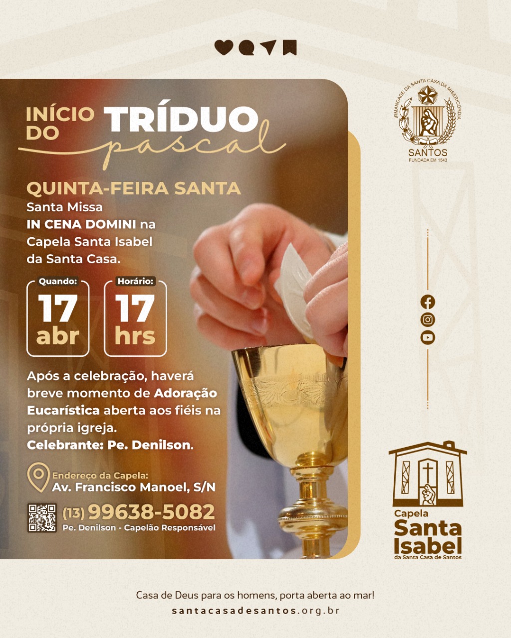 Já na Quinta-Feira Santa, acontecerá o início do Tríduo Pascal, com Santa Missa IN CENA DOMINI, em 17/4, às 17 horas, celebrada pelo Capelão Padre Denilson. Após a celebração, haverá breve momento de Adoração Eucarística aberta aos fiéis na própria igreja.