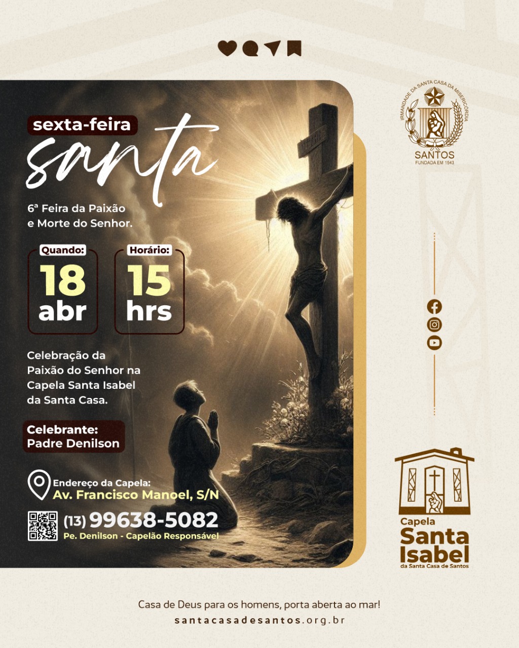 Na Sexta-Feira Santa, ou Sexta-Feira da Paixão, em 18/4, às 15 horas, haverá a celebração da Paixão do Senhor, celebrada pelo Capelão Padre Denilson.