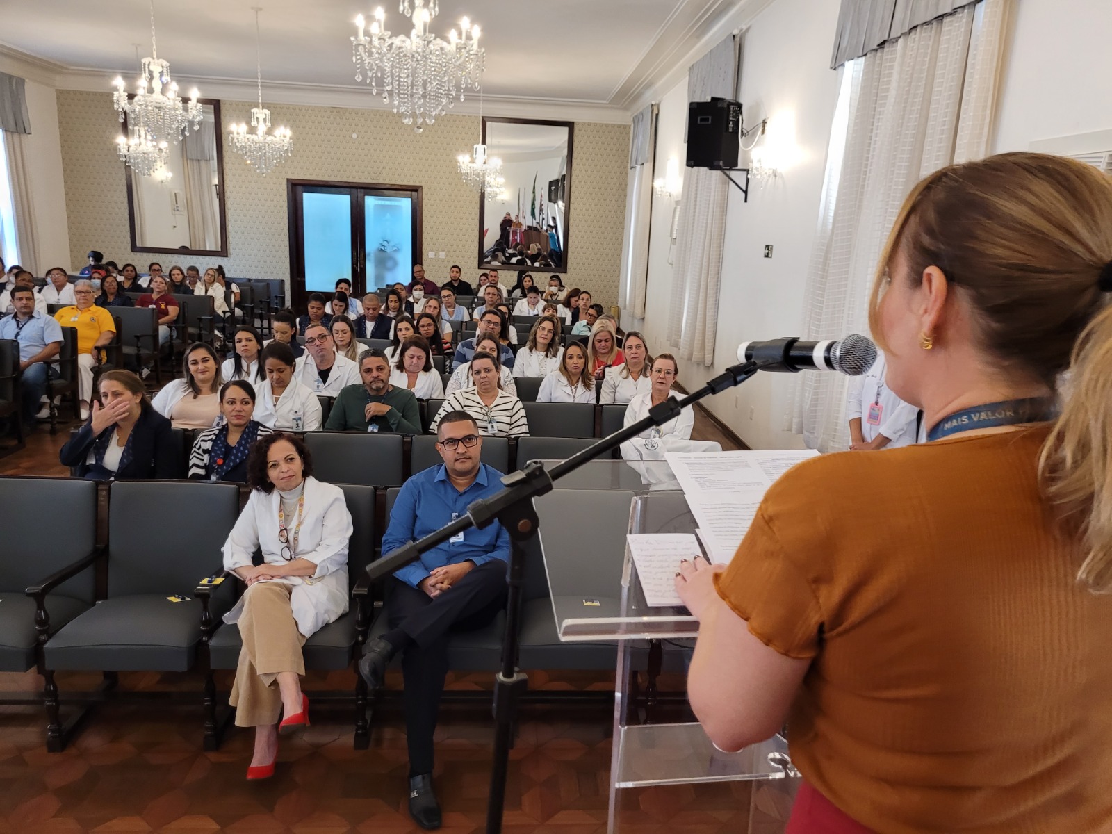 Após os discursos de abertura, a primeira palestra foi com a supervisora de Humanização do hospital, Cláudia Jacob, que abordou exatamente sobre o atendimento humanizado, e a importância de sempre dar o seu melhor, pois é sempre possível fazer um “algo a mais”, seja num gesto, uma palavra, ou uma simples “mudança na posição de uma cadeira”.