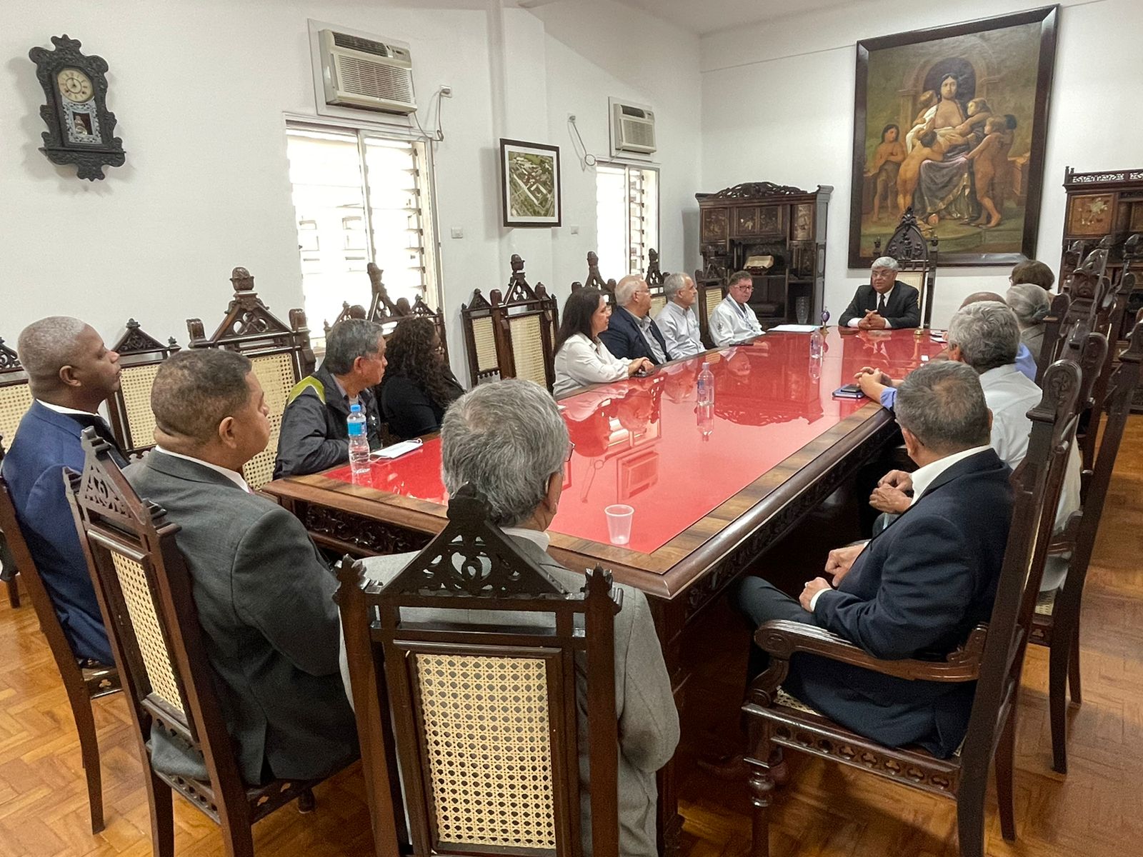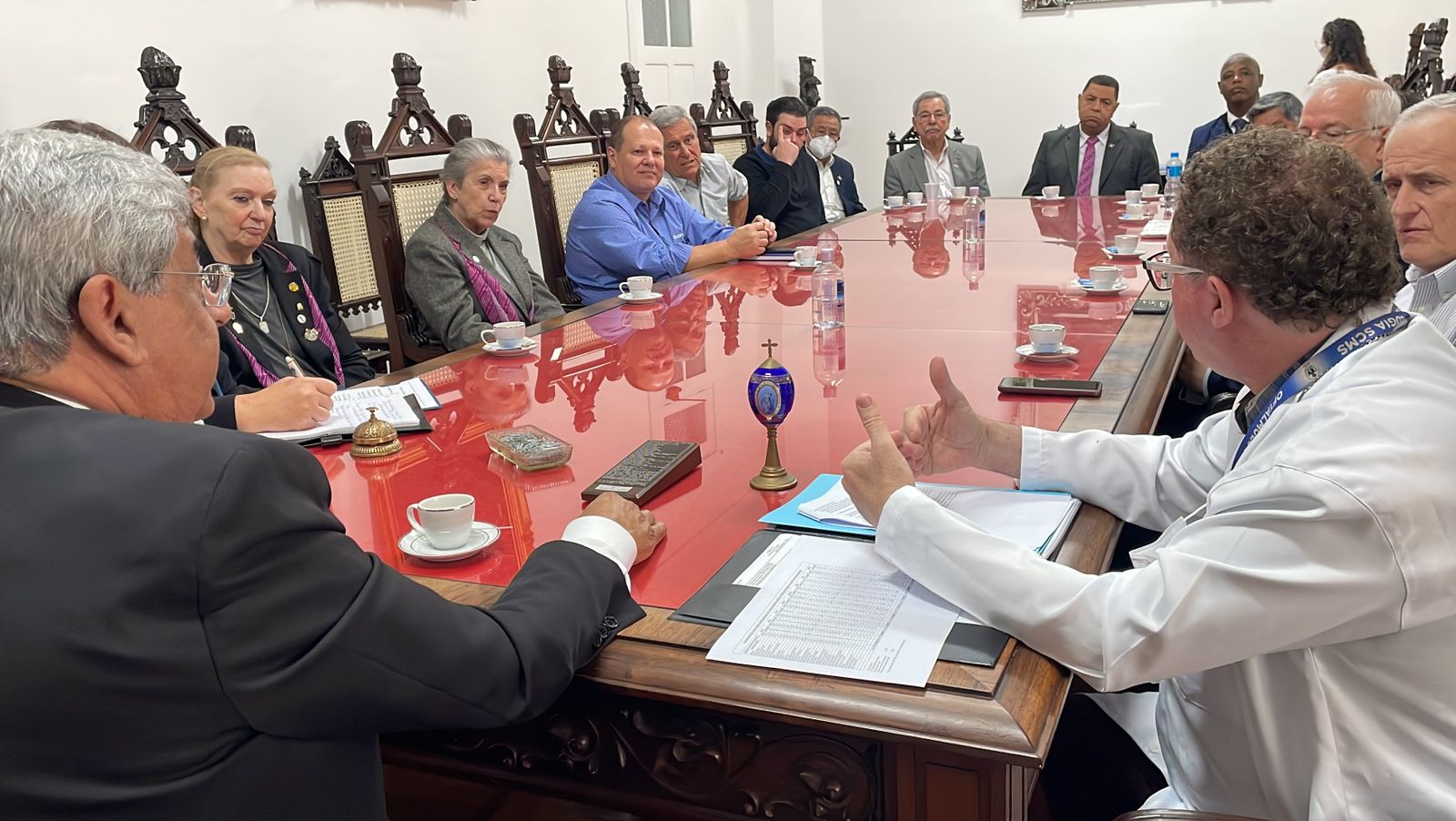 O vice provedor, Carlos Teixeira Filho, e o diretor clínico, Constantino Kader Conde, receberam a comitiva na Sala da Mesa Administrativa. O vice provedor explanou sobre a história da Santa Casa de Santos, como também sobre a representatividade da instituição para o país. O diretor clínico falou sobre os desafios da pandemia, e como foram os atendimentos no serviço de Oftalmologia neste período.