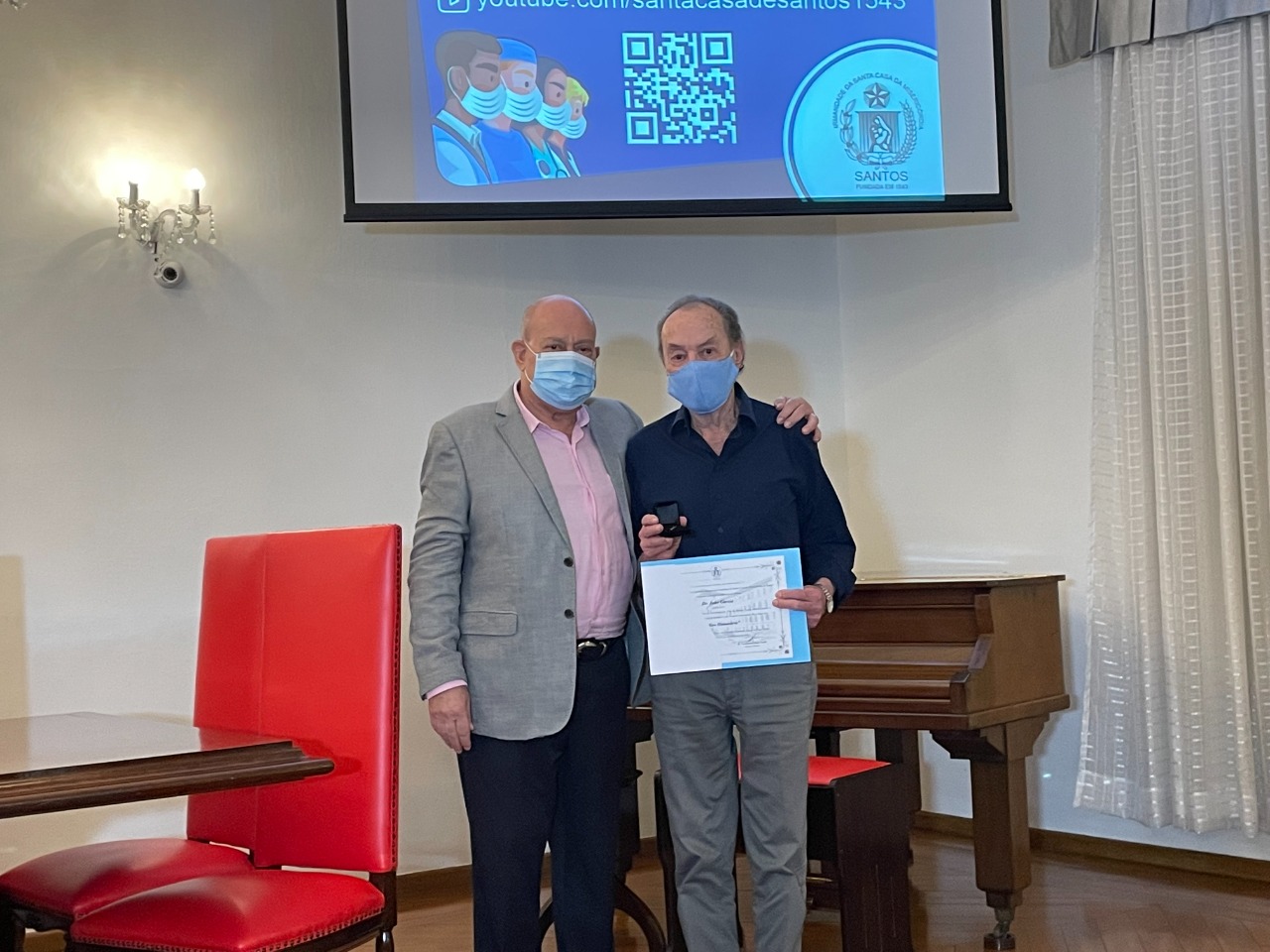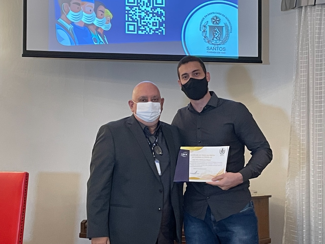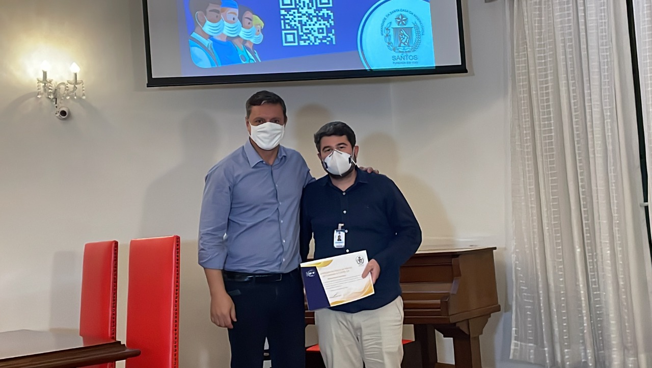 Dr. Sérgio Feijoo, com a voz embargada, leu a mensagem contida no certificado, que dizia: “A Irmandade da Santa Casa da Misericórdia de Santos agradece sua excepcional dedicação, compromisso e competência no combate à Covid-19 e, em reconhecimento pela sua atuação, certifica sua louvável participação junto à linha de frente. Seu empenho contribuiu para a superação do hospital diante de todas as adversidades e desafios impostos pela pandemia”.