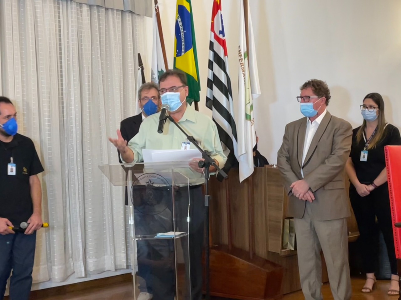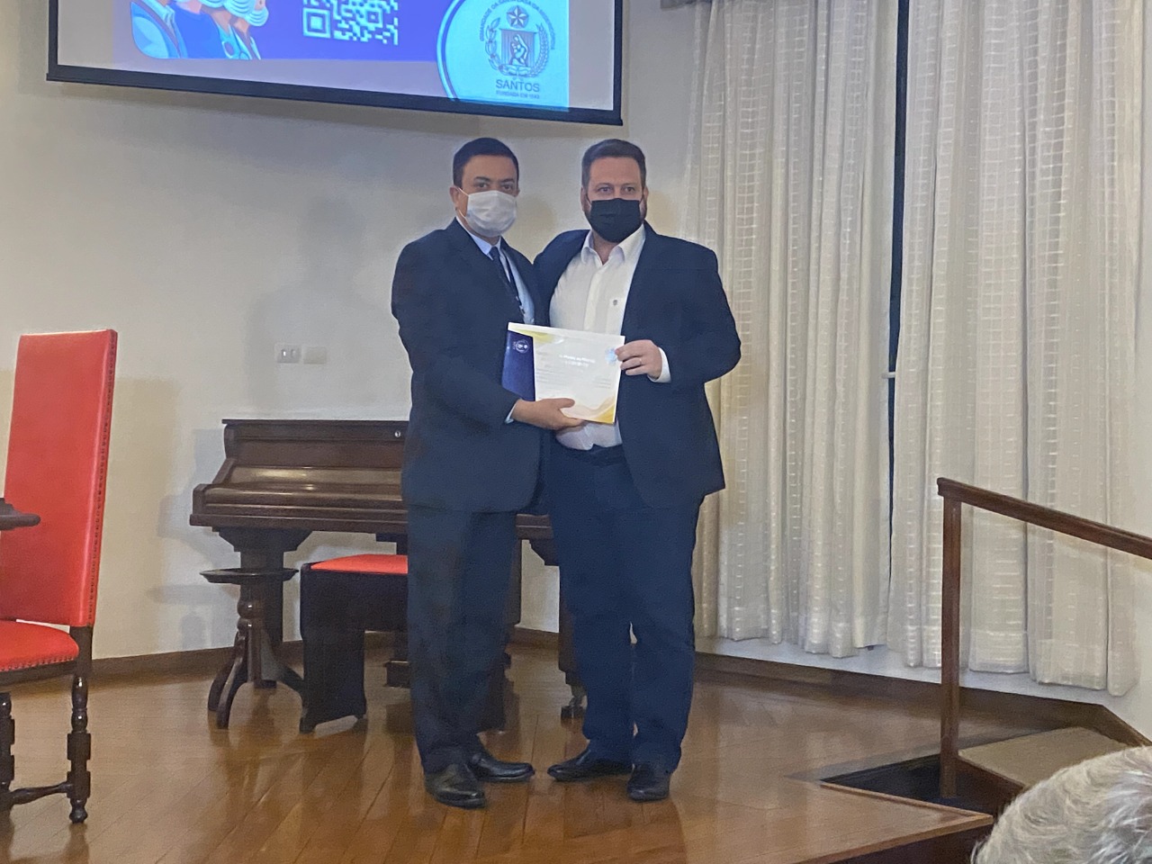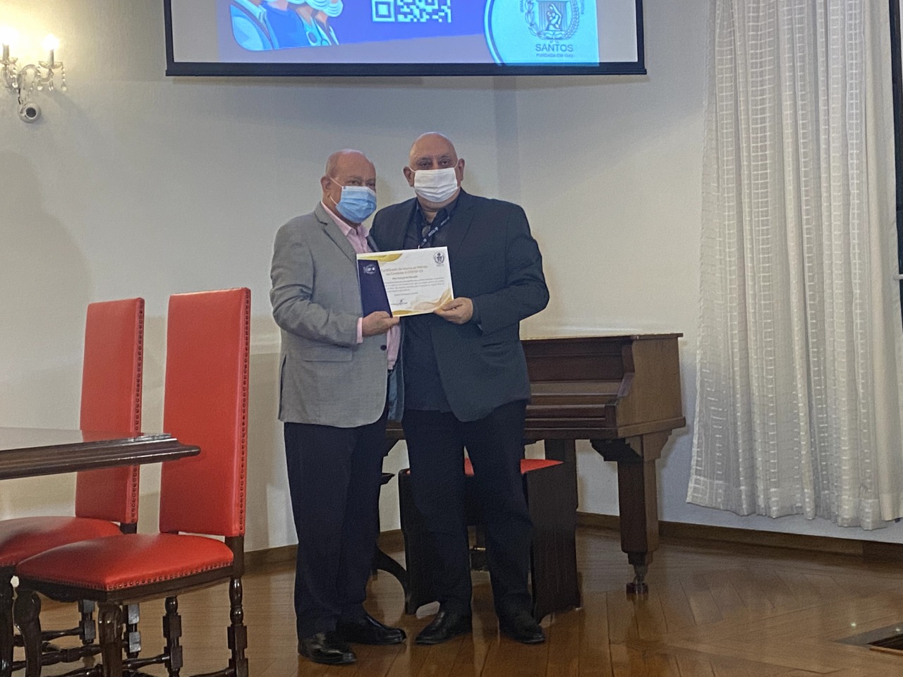 Dr. Sérgio Feijoo, com a voz embargada, leu a mensagem contida no certificado, que dizia: “A Irmandade da Santa Casa da Misericórdia de Santos agradece sua excepcional dedicação, compromisso e competência no combate à Covid-19 e, em reconhecimento pela sua atuação, certifica sua louvável participação junto à linha de frente. Seu empenho contribuiu para a superação do hospital diante de todas as adversidades e desafios impostos pela pandemia”.