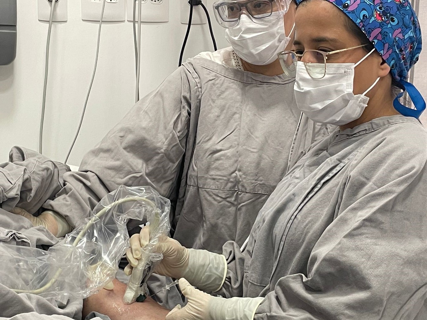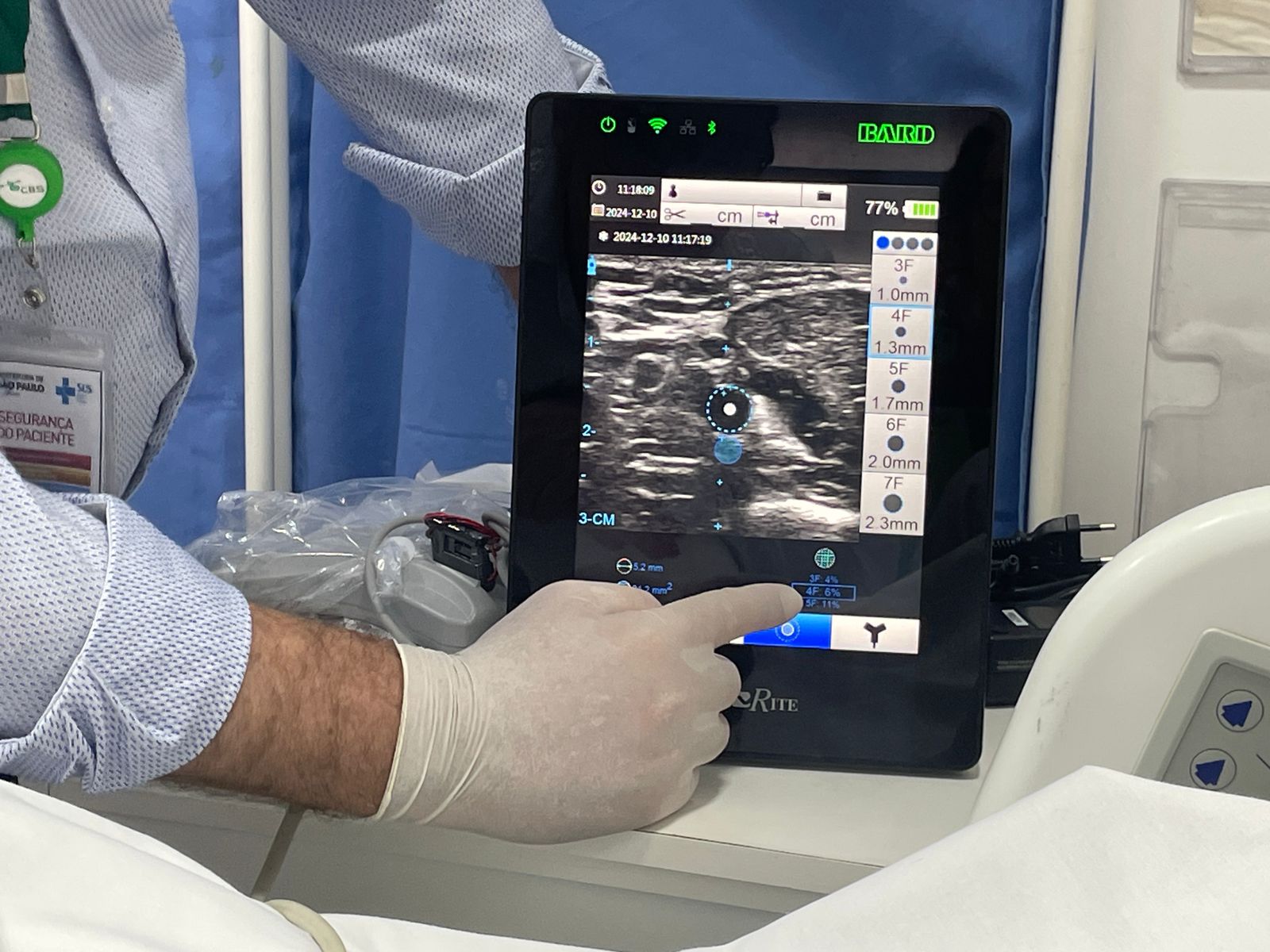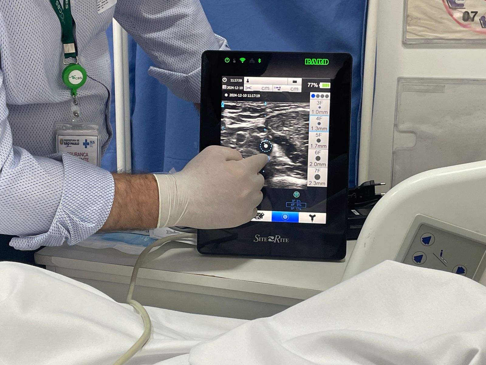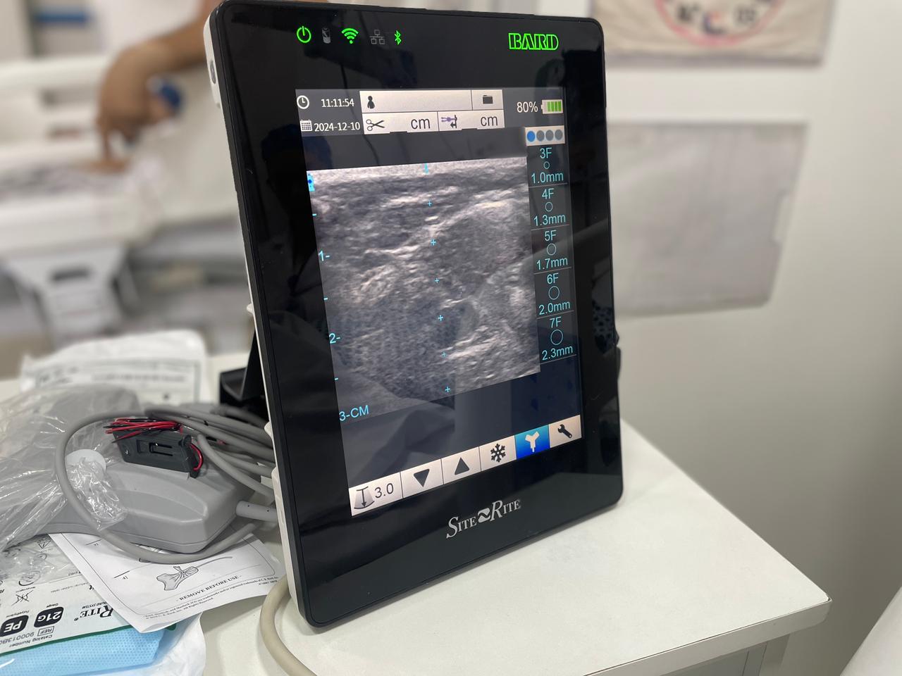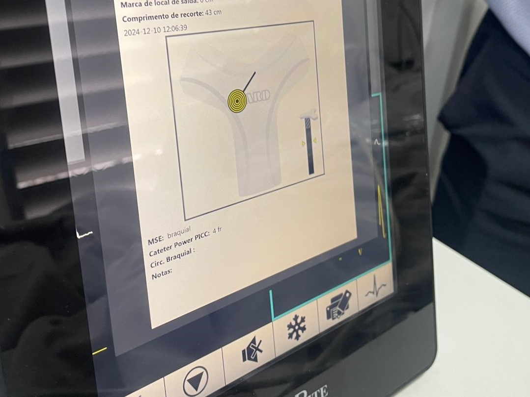 A primeira passagem de PICC 3CG aconteceu no dia 10/12/24, e foi realizada pela Enfª. Noely Costa e Enfª. Christiane Shiozaki, do Núcleo de Acessos da Santa Casa, com o apoio do representante da empresa CBS, distribuidora do aparelho Sherlock, Enfº. Jessé Silva.