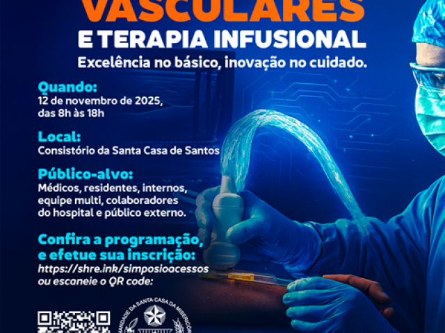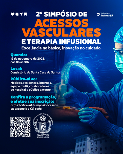 A Santa Casa de Santos, por meio da Equipe de Educação Continuada, promove no dia 12 de novembro de 2025, o 2º Simpósio de Acessos Vasculares e Terapia Infusional, que acontecerá no Consistório da Santa Casa de Santos, das 8h às 17h. O evento tem como tema “Excelência no básico, inovação no cuidado” e reunirá profissionais e especialistas de diversas instituições de saúde para debater os avanços, desafios e boas práticas na área de acessos vasculares, com ênfase em acessos periféricos e novas tecnologias.