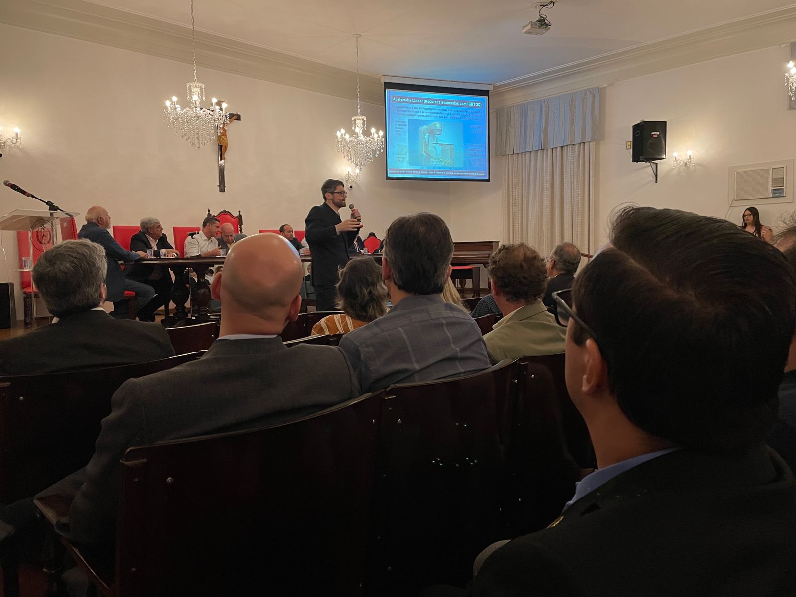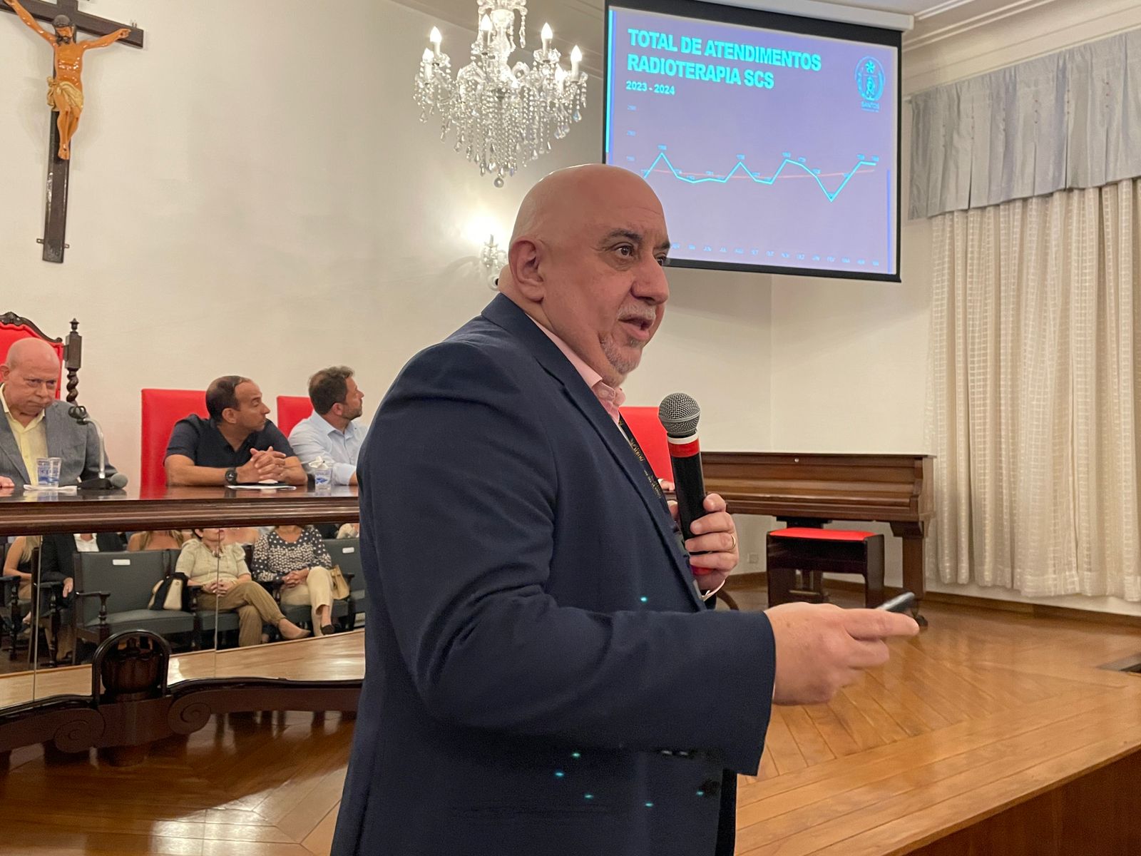O diretor técnico da Santa Casa, Dr. Alex Macedo, e o diretor comercial, Fábio Isoldi, fizeram uma apresentação mostrando os números de casos de câncer, que aumentam anualmente, e também explicaram sobre a tecnologia do novo acelerador linear, que conta com os recursos mais avançados da atualidade (IRGT 3D), podendo tratar diversos tipos de tumores.