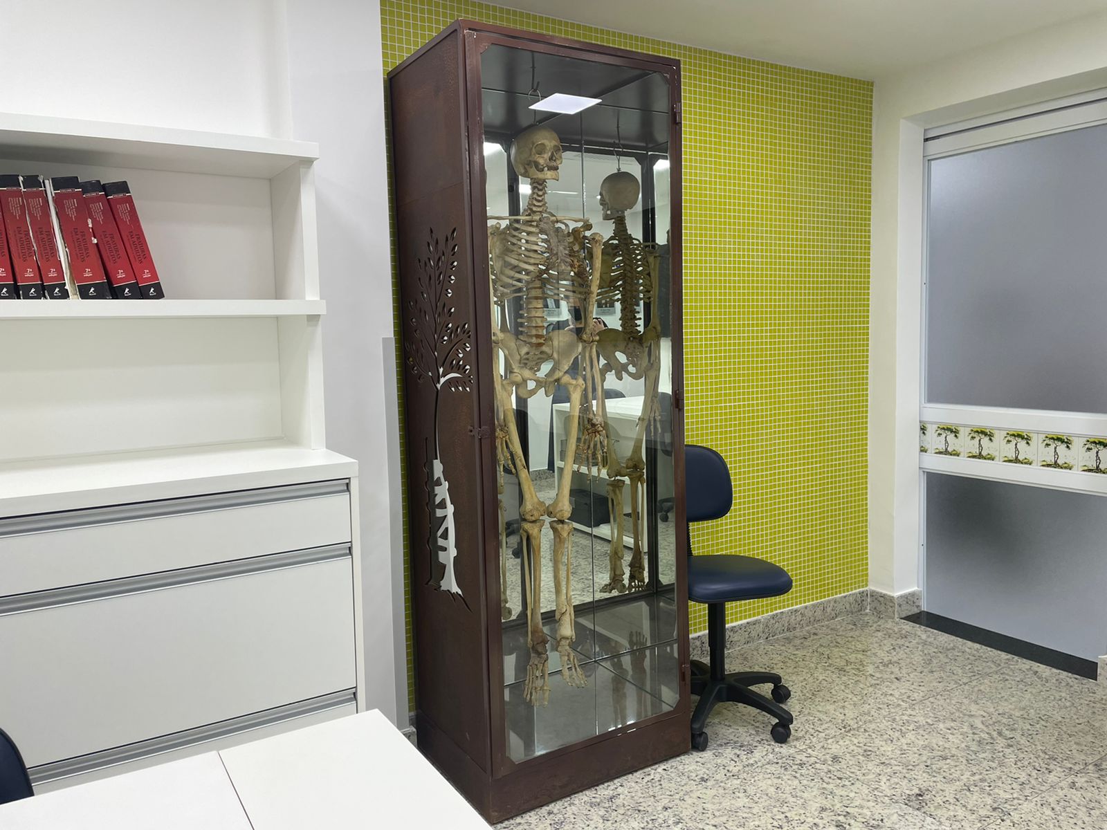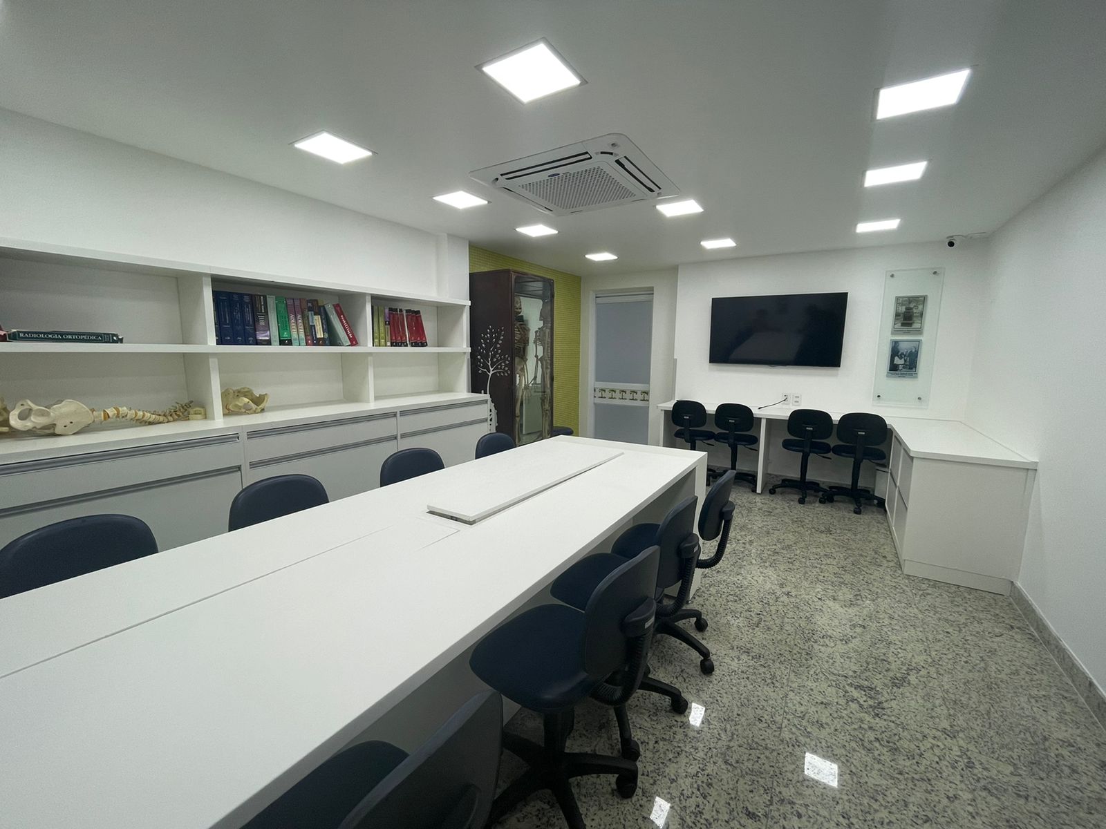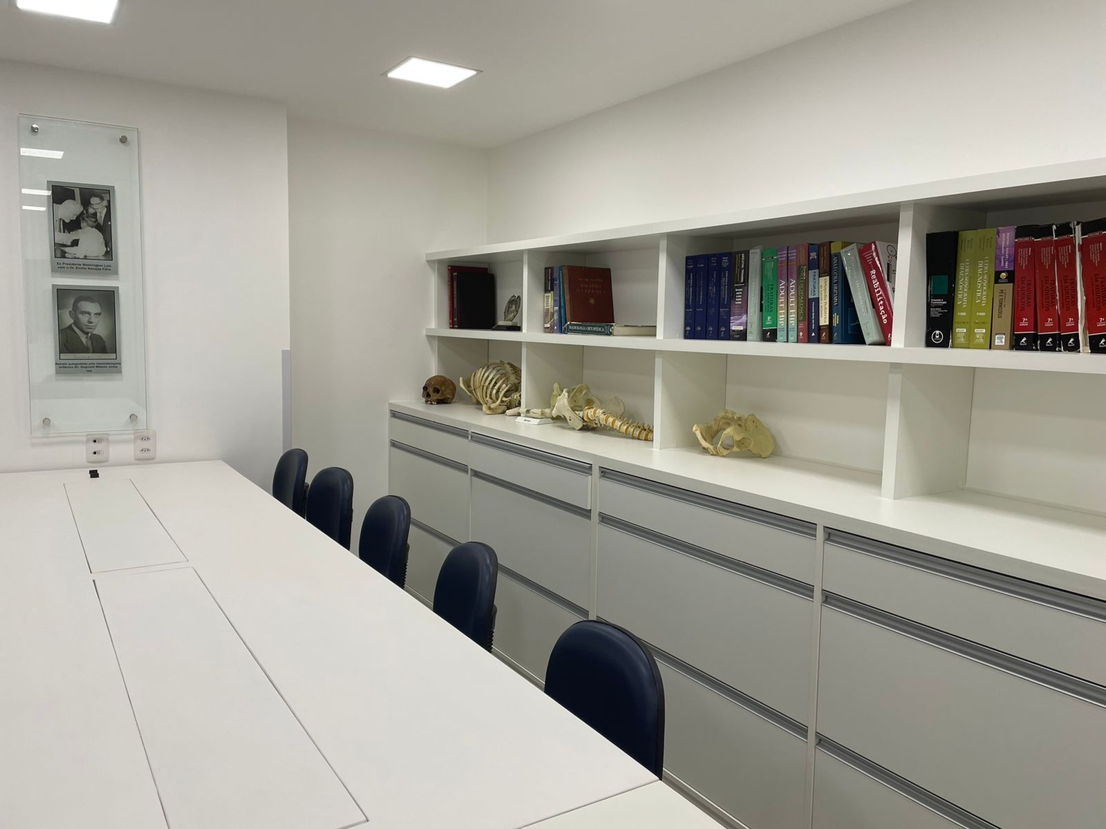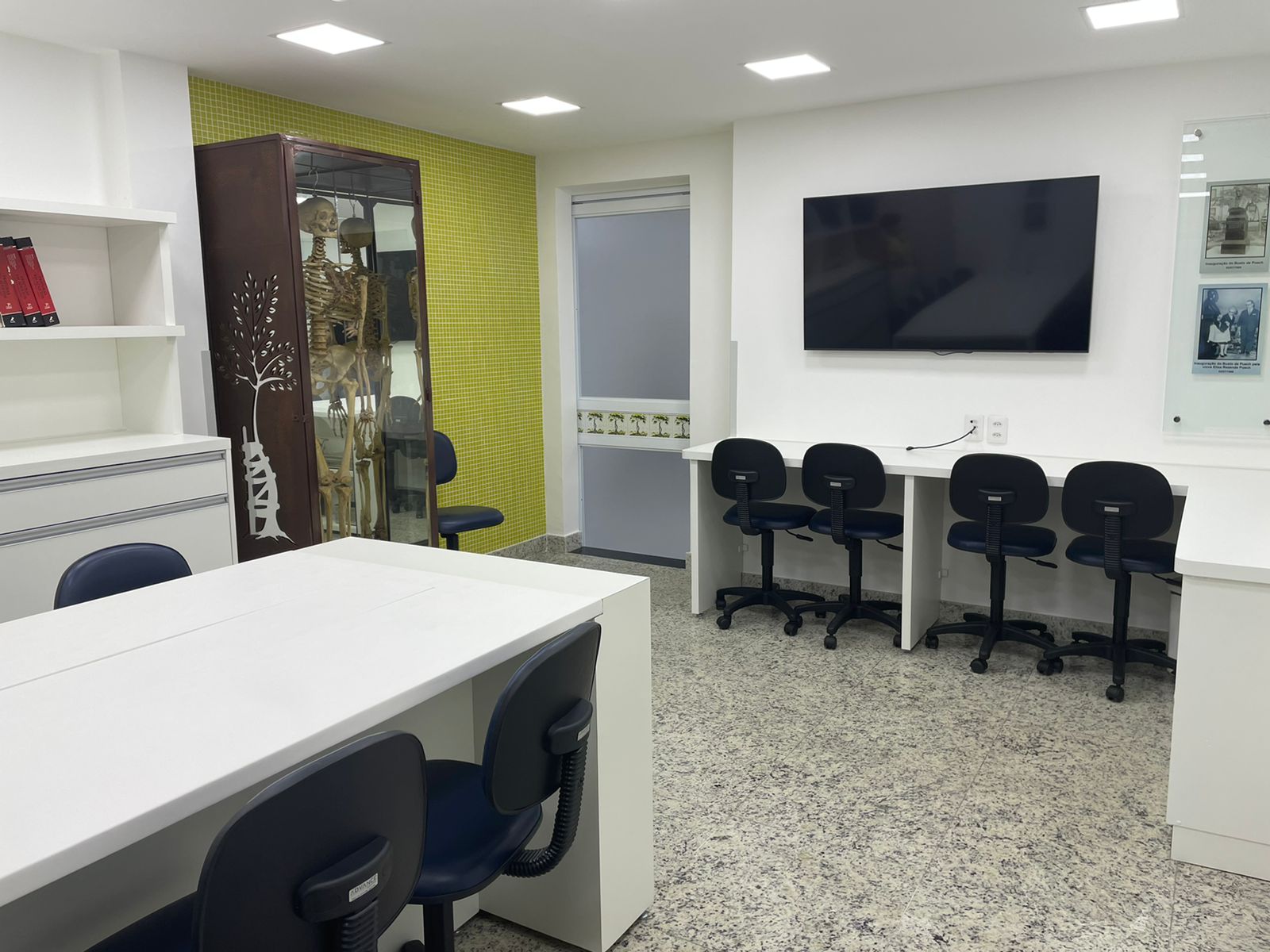 Toda a estrutura e mobiliário foram planejados pensando nos mínimos detalhes, propiciando o melhor desempenho das atividades propostas, que incluem a prática de procedimentos em protótipos e ossos sintéticos. O grande destaque da sala é a mesa de estudos com compartimento automatizado e revestimento em couro, para evitar o deslizamento das peças usadas na prática das técnicas.