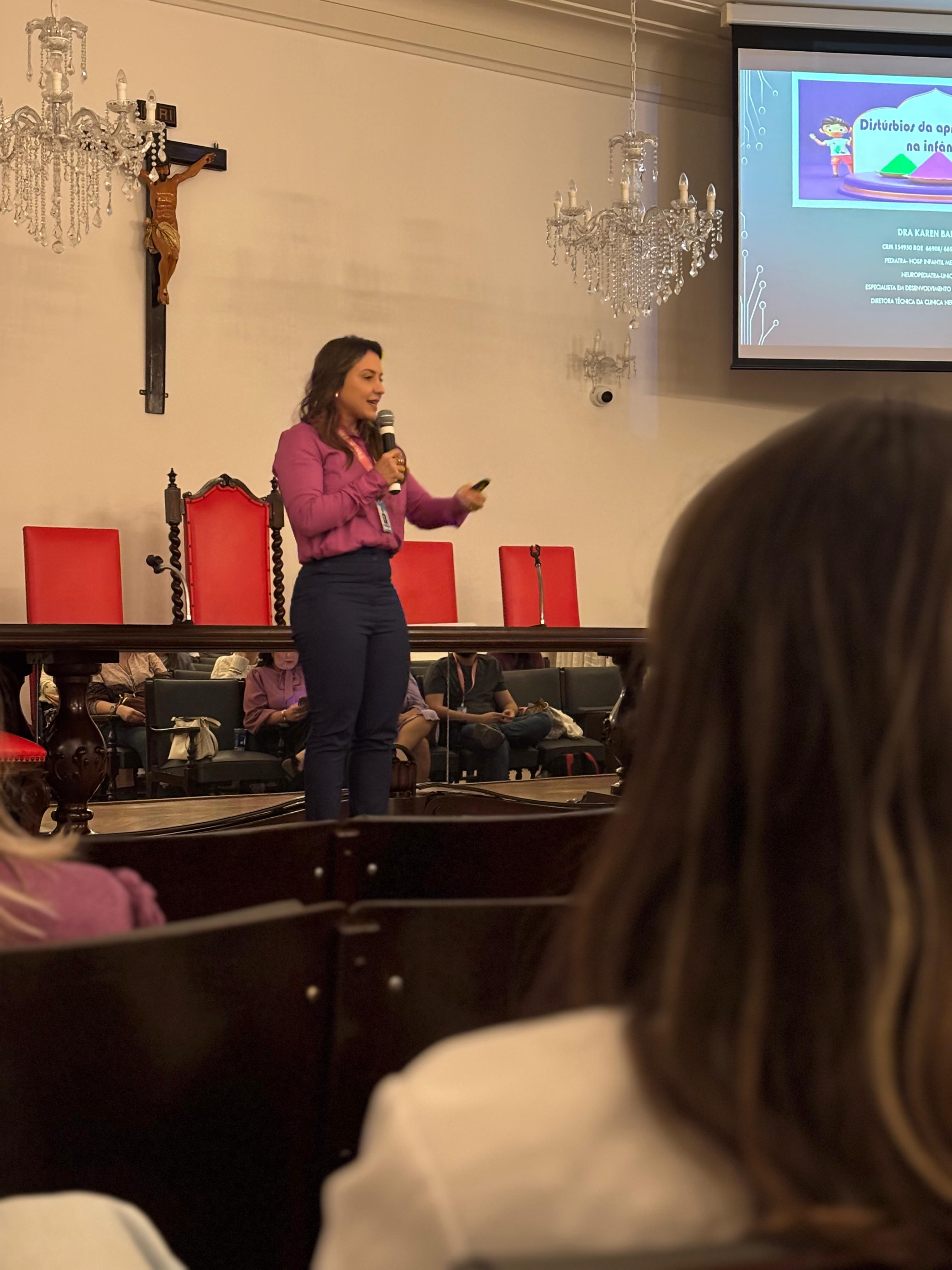 A segunda palestra foi a Neuropediatra Dra. Karen Baldin que explicou sobre os principais distúrbios como dislexia, TDAH e discalculia, seus sinais precoces e impactos emocionais. “Os principais sintomas iniciais incluem: Dislexia: dificuldade com leitura, escrita, soletração e alfabetização. TDAH: desatenção persistente, hiperatividade, impulsividade, presentes por pelo menos seis meses em múltiplos ambientes; causa impacto acadêmico e emocional. E discalculia: dificuldade significativa com operações matemáticas e raciocínio lógico. Além do rendimento escolar prejudicado, essas condições podem gerar frustração, estresse e afetar negativamente a autoestima dos pequenos”.